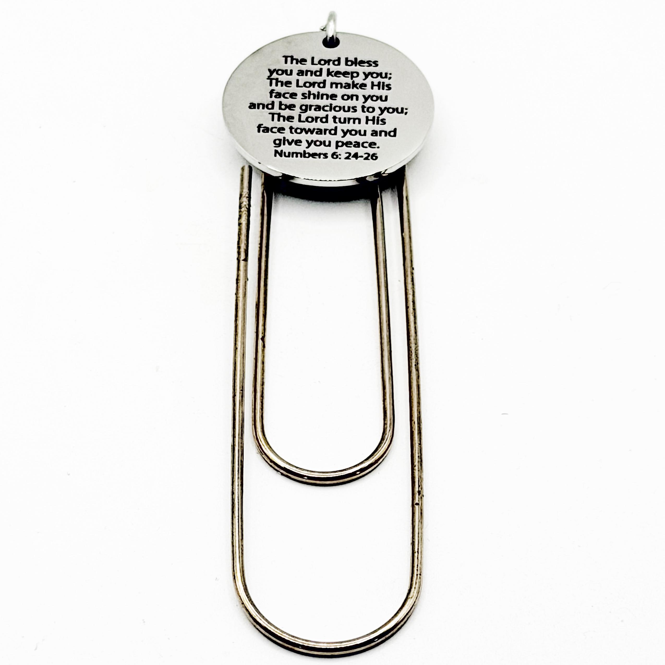 Keep a meaningful reminder of God’s blessing close as you read with this stainless steel paperclip bookmark charm featuring the powerful words of Numbers 6:24-26. The engraved message reads exactly: The Lord bless you and keep you; The Lord make His face shine on you and be gracious to you; The Lord turn His face toward you and give you peace. Numbers 6:24-26. Crafted with a durable stainless steel charm measuring approximately 25mm, this piece is attached to a 3 1/2 inch paperclip bookmark for easy placement in your Bible, journal, or favorite book. Thoughtful and faith-filled, it makes a meaningful gift for encouragement, birthdays, or personal devotion. To maintain its shine, avoid exposure to harsh chemicals and store in a dry place when not in use.