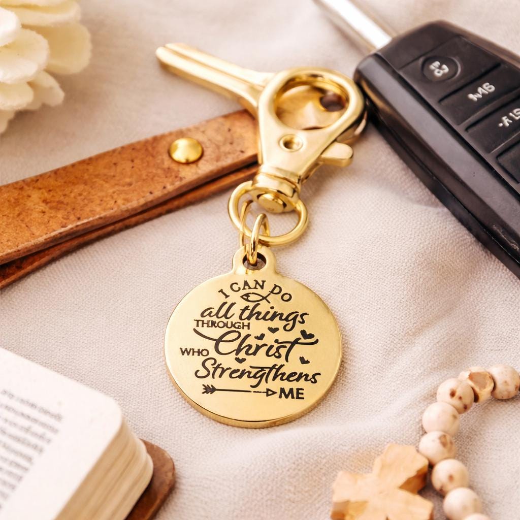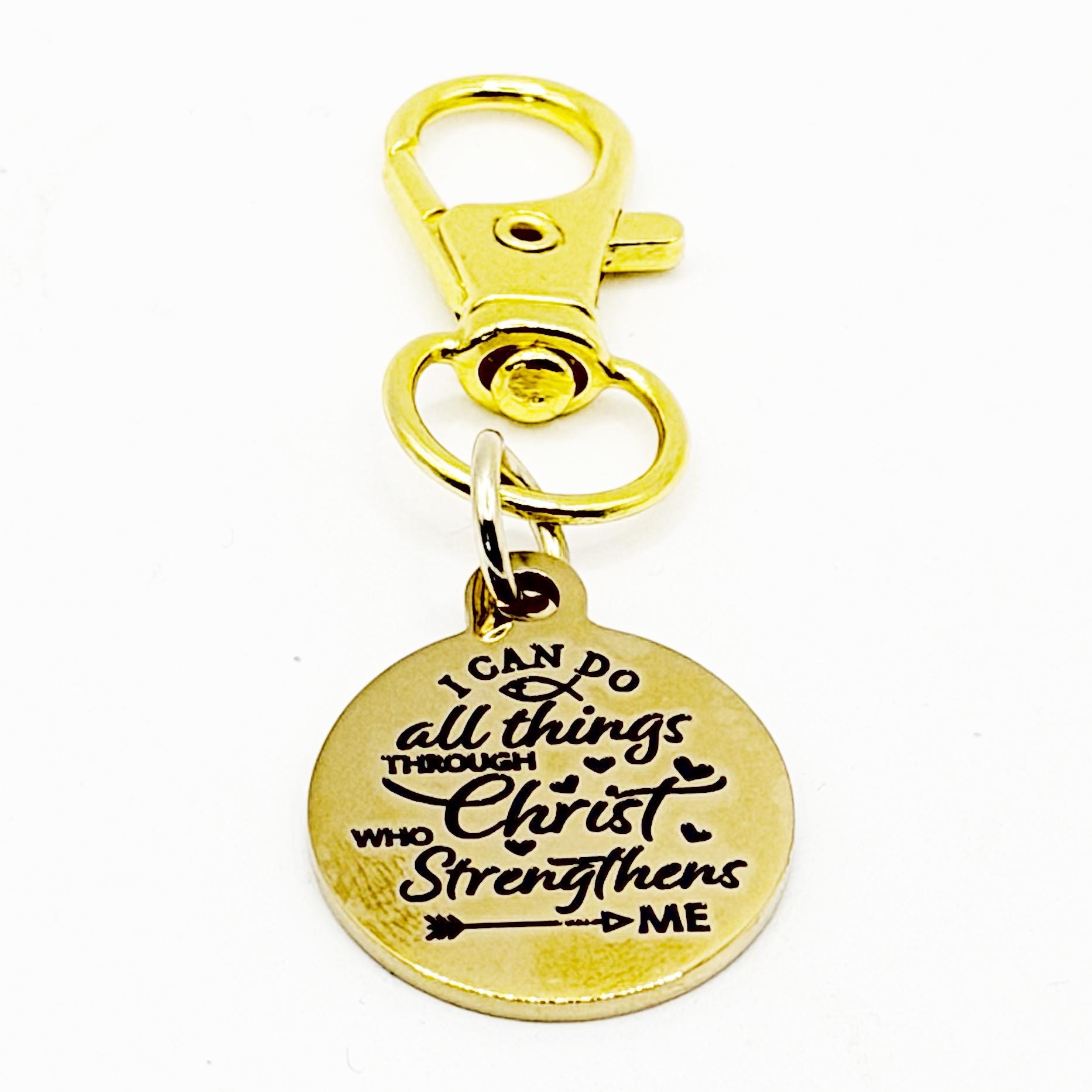 Carry a powerful reminder of faith wherever you go with this gold-plated stainless steel clip on charm. Engraved with the meaningful message “I can do all things through Christ who strengthens me,” this piece serves as a daily source of encouragement and strength. The 19mm charm offers a clean, timeless look while remaining lightweight and easy to wear. It is securely attached to a durable 32mm alloy lobster clasp, making it simple to clip onto keys, bags, backpacks, or purses. Thoughtfully designed for everyday use, this charm makes a meaningful gift for friends, family, or anyone seeking inspiration in their walk of faith. To maintain its shine, avoid exposure to water, lotions, and harsh chemicals, and store in a dry place when not in use.