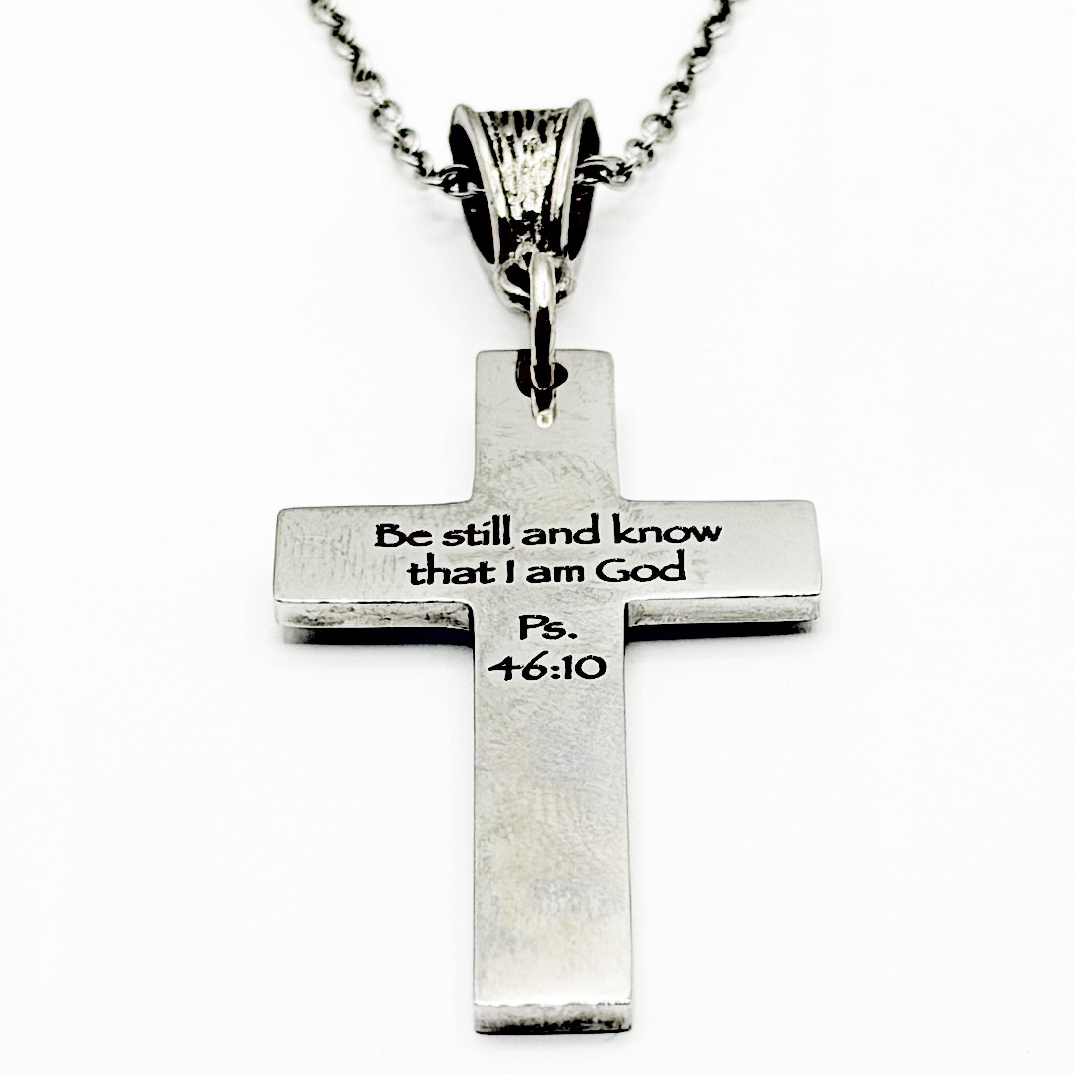 Carry a quiet reminder of faith with this stainless steel cross necklace engraved with the powerful words “Be still and know that I am God Ps. 46:10.” Crafted from durable stainless steel, this piece is designed for everyday wear while maintaining its meaningful message. The cross charm measures approximately 1 5/8 inches long by 1 inch wide and hangs from a stainless steel link chain available in your choice of lengths for a comfortable, personalized fit. This necklace makes a thoughtful gift for birthdays, baptisms, confirmations, or moments when encouragement and faith are needed most. Its timeless design pairs easily with any style, making it a meaningful addition to any jewelry collection. To care for your necklace, simply wipe clean with a soft cloth and store in a dry place to preserve its finish.