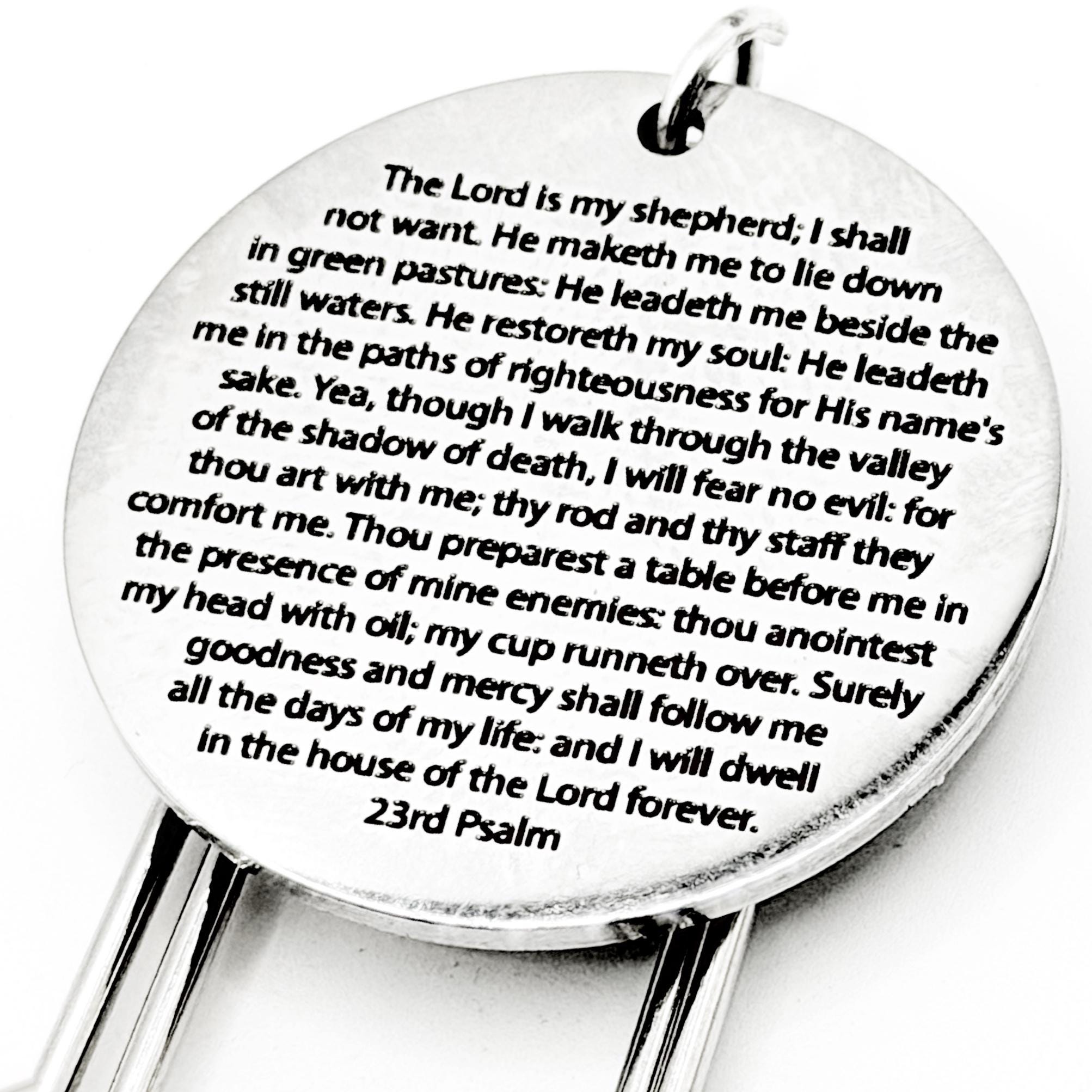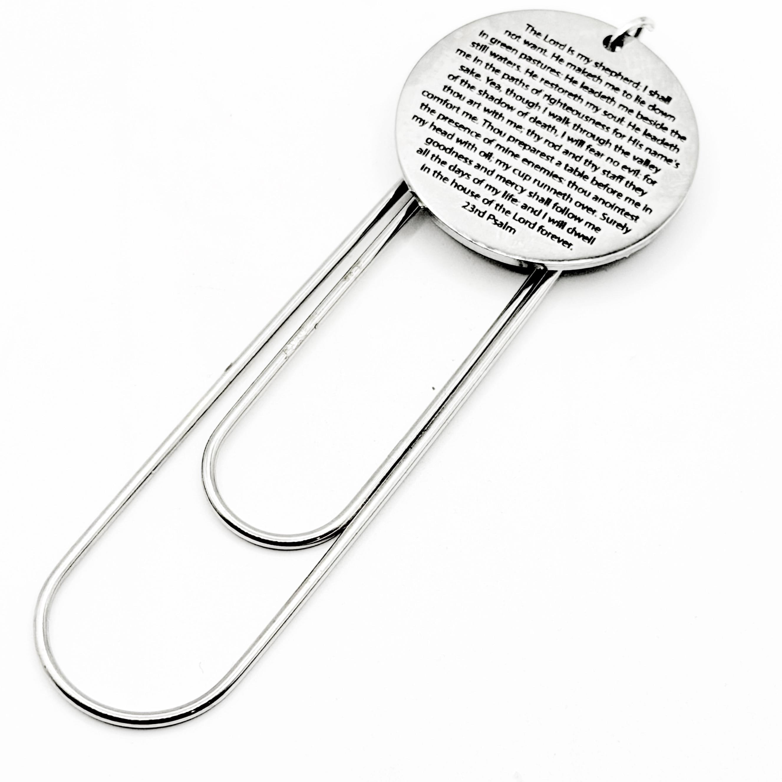 Carry the comforting words of the 23rd Psalm with you wherever you go. This stainless steel paperclip bookmark features a beautifully engraved 30mm charm with the full scripture, paired with a 3 1/2 inch paperclip for secure placement in your favorite Bible, journal, or book. Its sleek, durable design makes it a meaningful keepsake for daily devotion, quiet reflection, or thoughtful gifting. Due to the amount of text on this charm, the font is small but carefully engraved for clarity. This bookmark makes a heartfelt gift for loved ones, church members, or anyone seeking encouragement through scripture. To care for your bookmark, simply wipe clean with a soft cloth and store in a dry place.