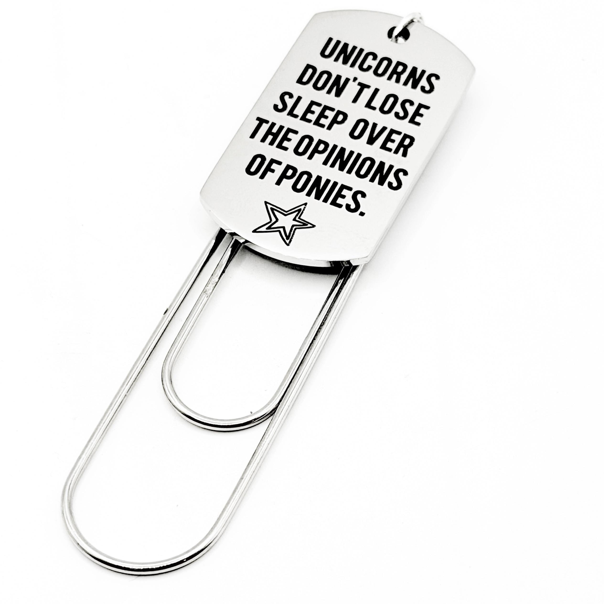 Add a touch of confidence and personality to your reading time with this beautifully engraved stainless steel bookmark from JKCE Designs. Featuring the phrase “Unicorns don't lose sleep over the opinions of ponies,” this piece is a fun yet meaningful reminder to stay true to yourself.