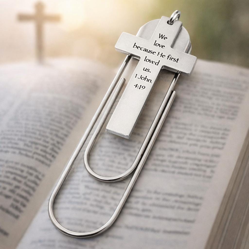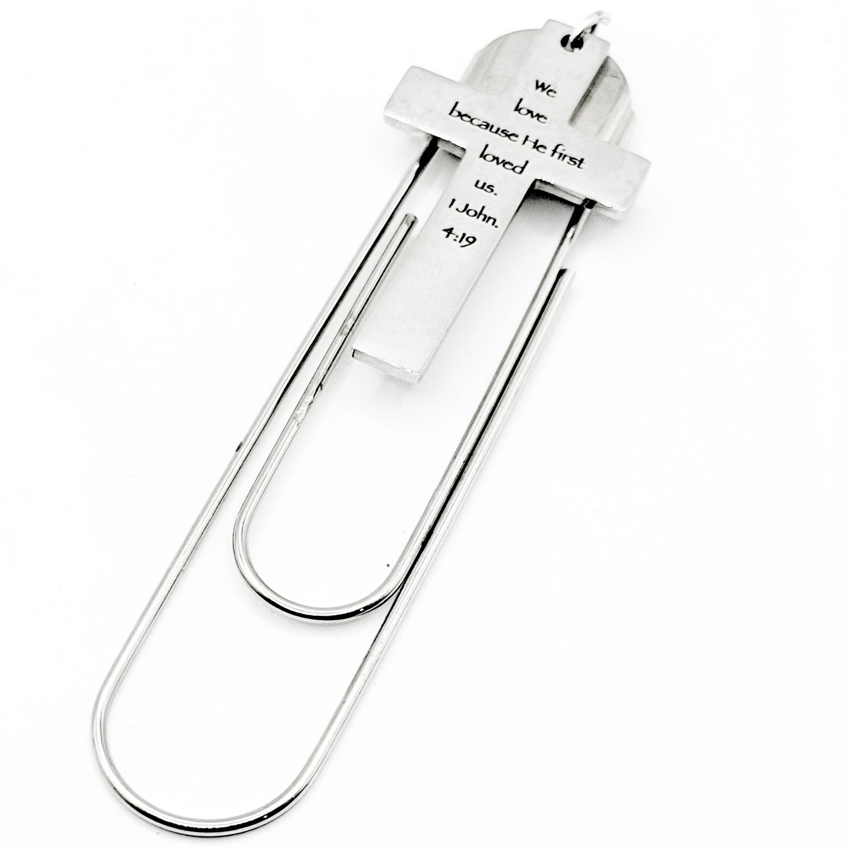 This stainless steel paperclip bookmark features a cross-shaped charm engraved with the meaningful verse: