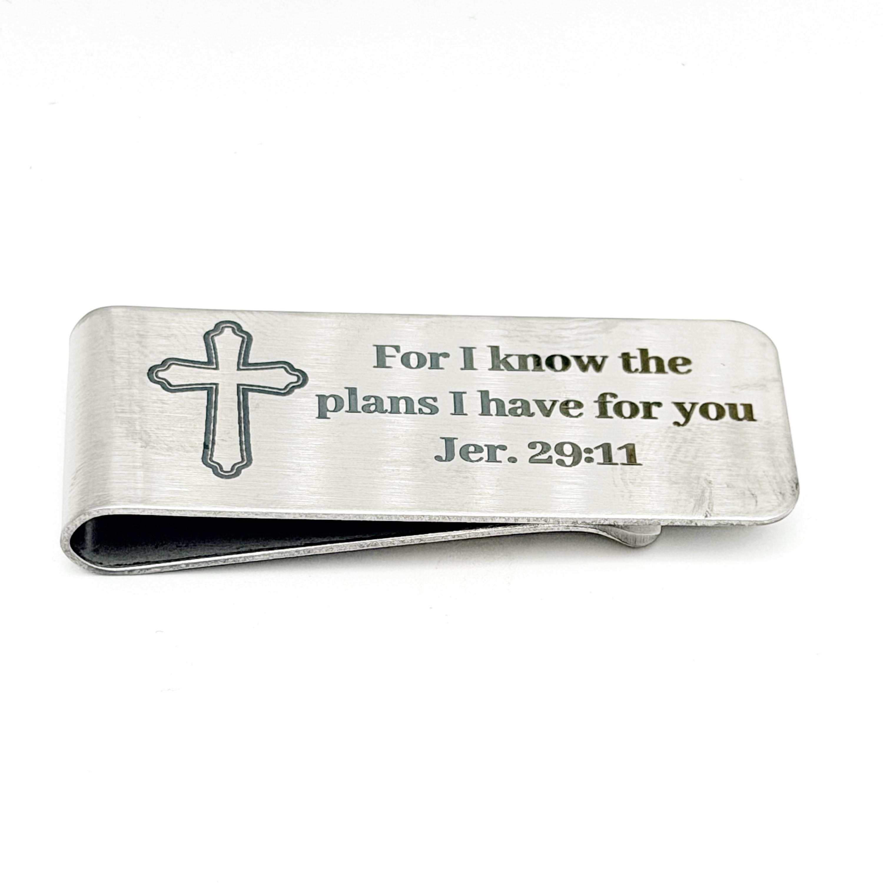 Carry a daily reminder of faith and purpose with this stainless steel money clip engraved with the message “For I know the plans I have for you Jer. 29:11”. Designed with both meaning and function in mind, this piece offers a simple yet powerful way to keep encouragement close at hand.