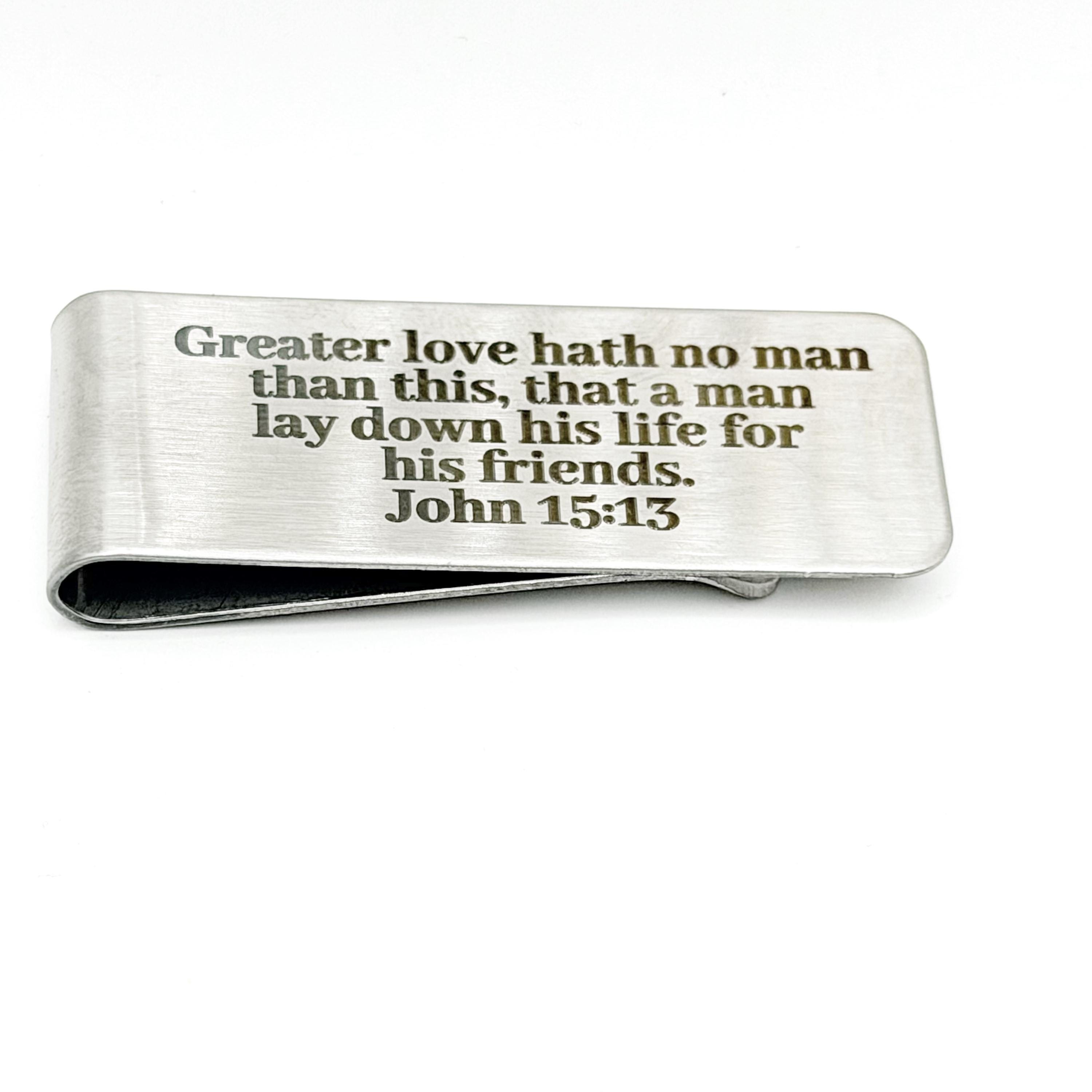 Carry a powerful reminder of love and sacrifice with this stainless steel money clip engraved with the message “Greater love hath no man than this, that a man lay down his life for his friends. John 15:13”. This meaningful piece serves as a daily encouragement while offering a clean and timeless design.