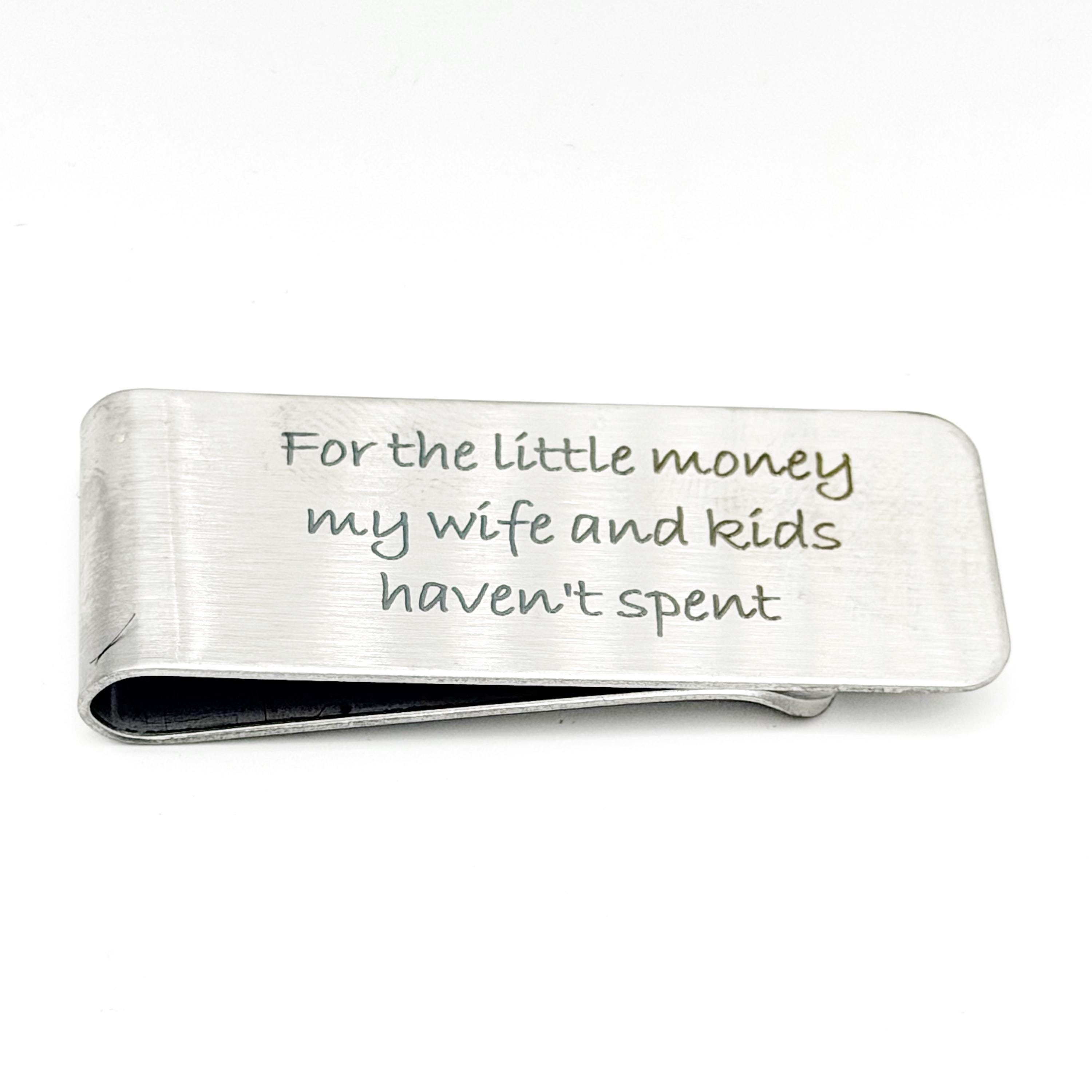 Add a touch of humor to an everyday essential with this stainless steel money clip engraved with the message “For the little money my wife and kids haven't spent”. This lighthearted design makes it a fun and practical accessory he will enjoy using every day.