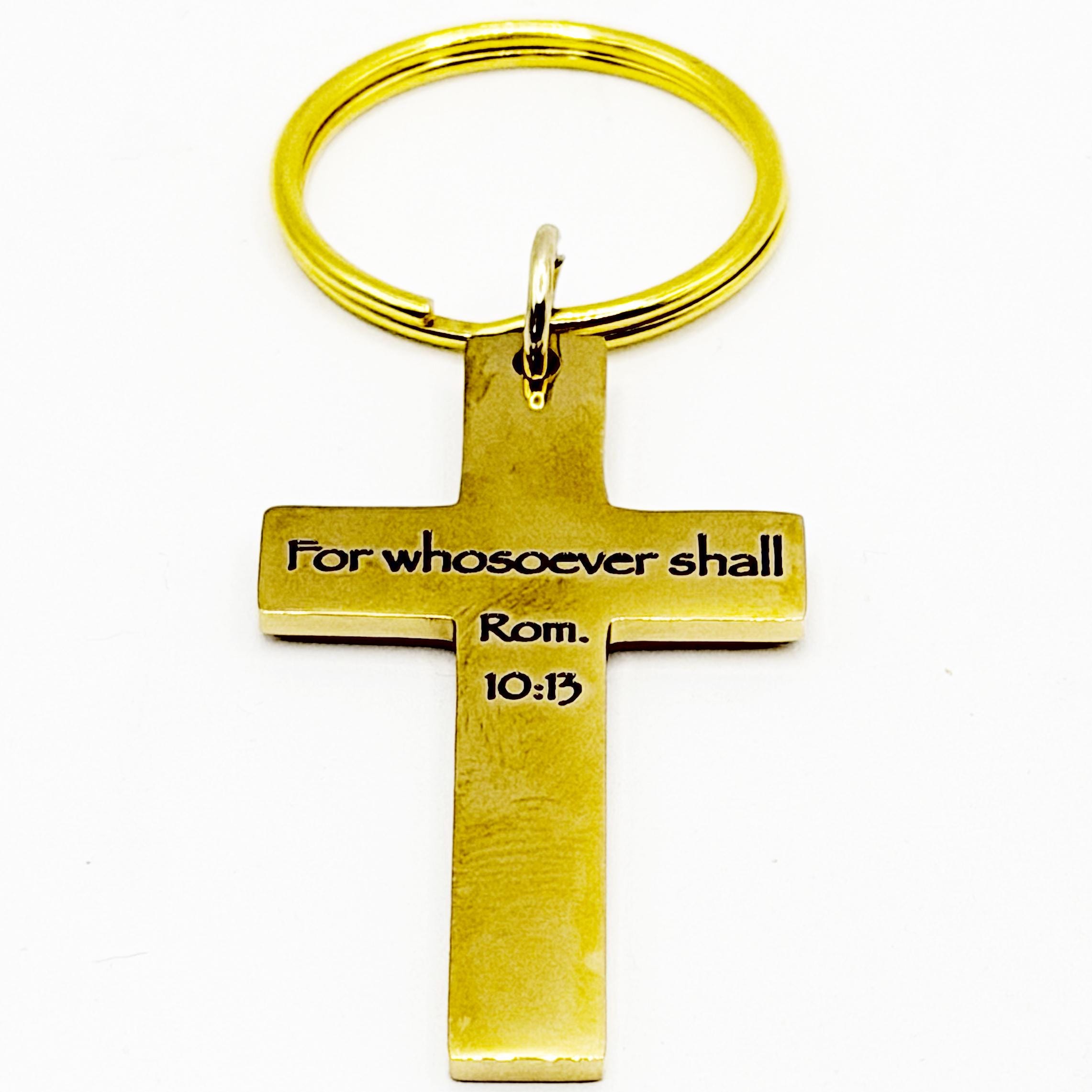 Carry a meaningful reminder of faith wherever you go with this gold-plated stainless steel cross charm keychain. Featuring the engraved message “For Whosoever Shall Rom 10:13,” this piece serves as a daily encouragement rooted in scripture. The cross measures approximately 1 5/8 inches long by 1 inch wide and is attached to a 1 inch alloy split key ring, making it easy to secure to keys, bags, or accessories.