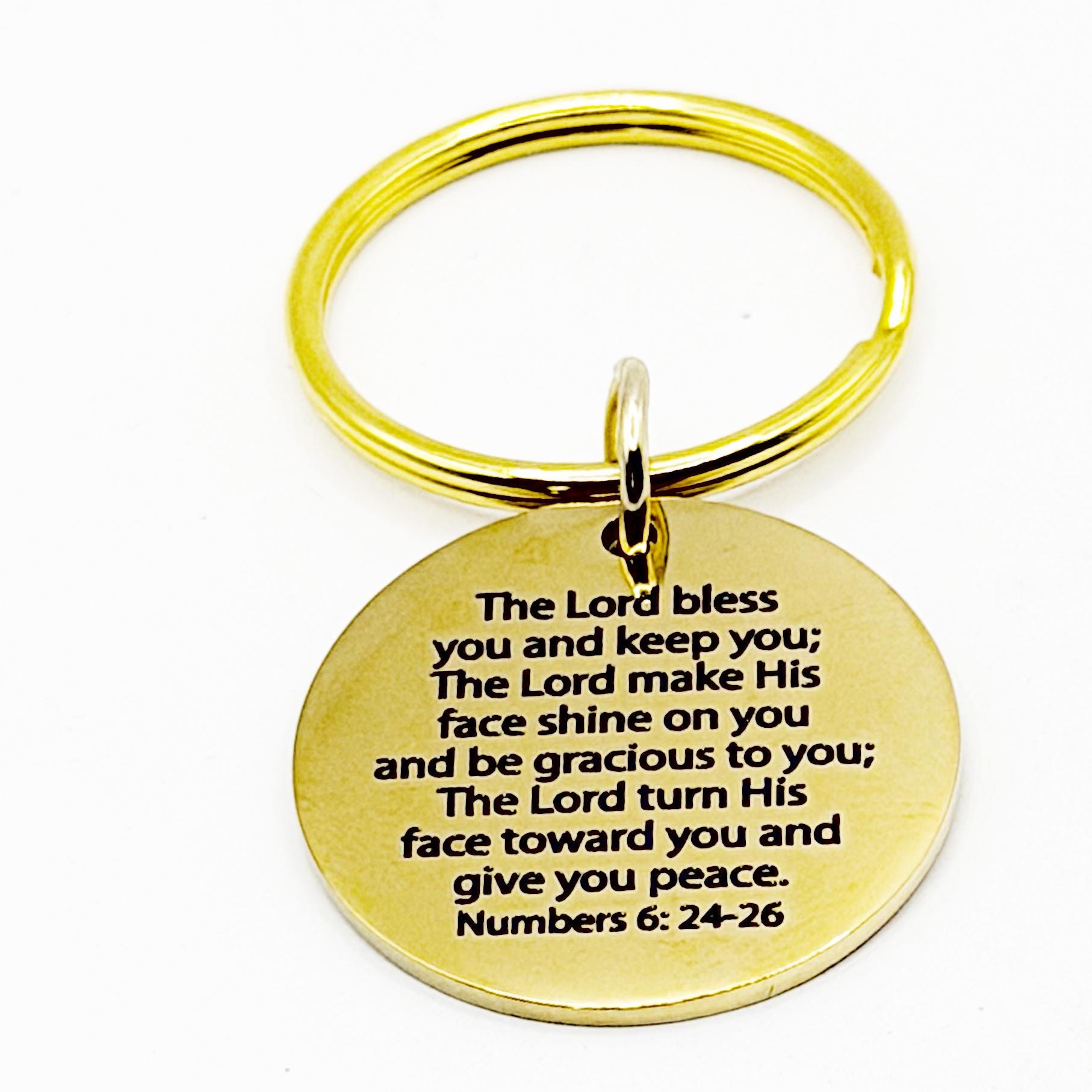Carry a blessing of peace and encouragement with you wherever you go with this gold-plated stainless steel charm keychain. Featuring the engraved scripture “The Lord bless you and keep you; The Lord make His face shine on you and be gracious to you; The Lord turn His face toward you and give you peace. Numbers 6:24-26.”, this piece serves as a meaningful daily reminder of faith.