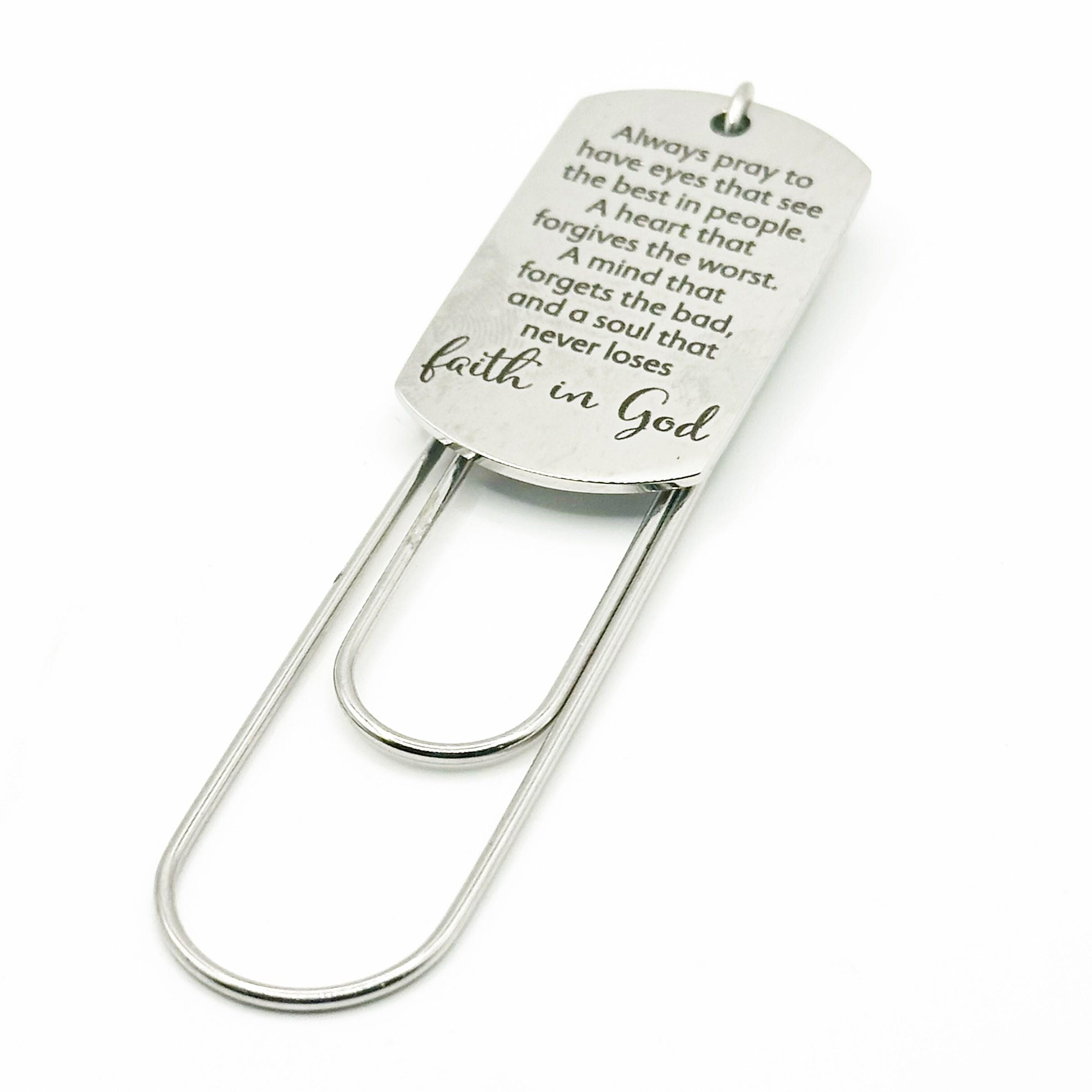 Keep your place and your faith close with this stainless steel bookmark charm. Engraved with a powerful message about seeing the best in others, forgiving freely, and holding onto faith in God, this piece serves as a meaningful daily reminder. The charm measures 43mm x 24mm and is attached to a 3 1/2 inch paperclip bookmark, making it both functional and inspirational for your reading time. Crafted from durable stainless steel, it offers lasting shine and everyday use. This bookmark makes a thoughtful gift for friends, family, or anyone who finds comfort and encouragement in scripture and reflection. To care for your piece, gently clean with a soft cloth and store in a dry place when not in use.