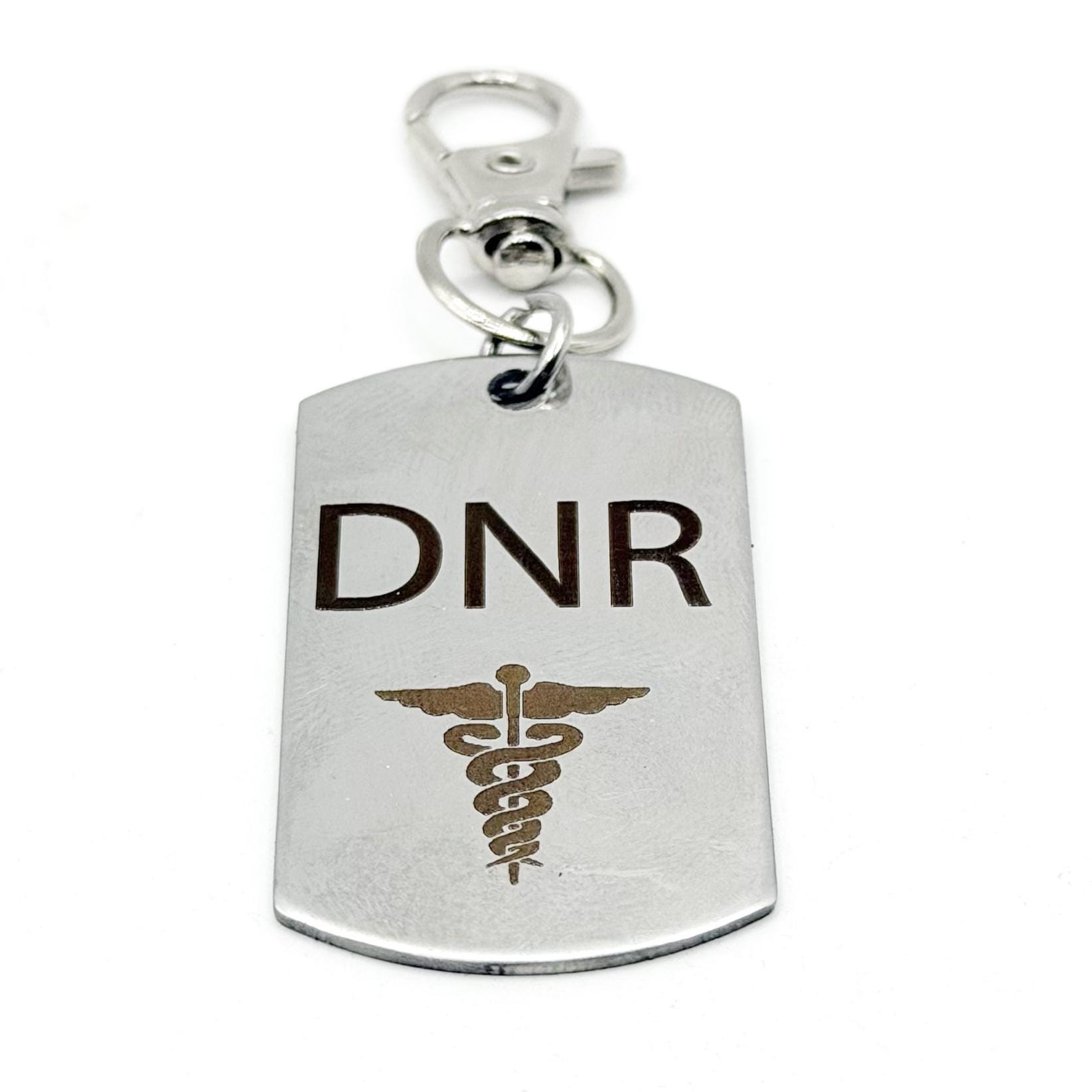 This stainless steel DNR clip-on charm offers a simple and meaningful way to keep an important message close at all times. Designed with a clean, durable finish, the 43mm x 23mm dog tag style charm features a bold DNR engraving and is securely attached with a sturdy 32mm alloy lobster clasp for easy clipping onto keyrings, bags, or personal items.