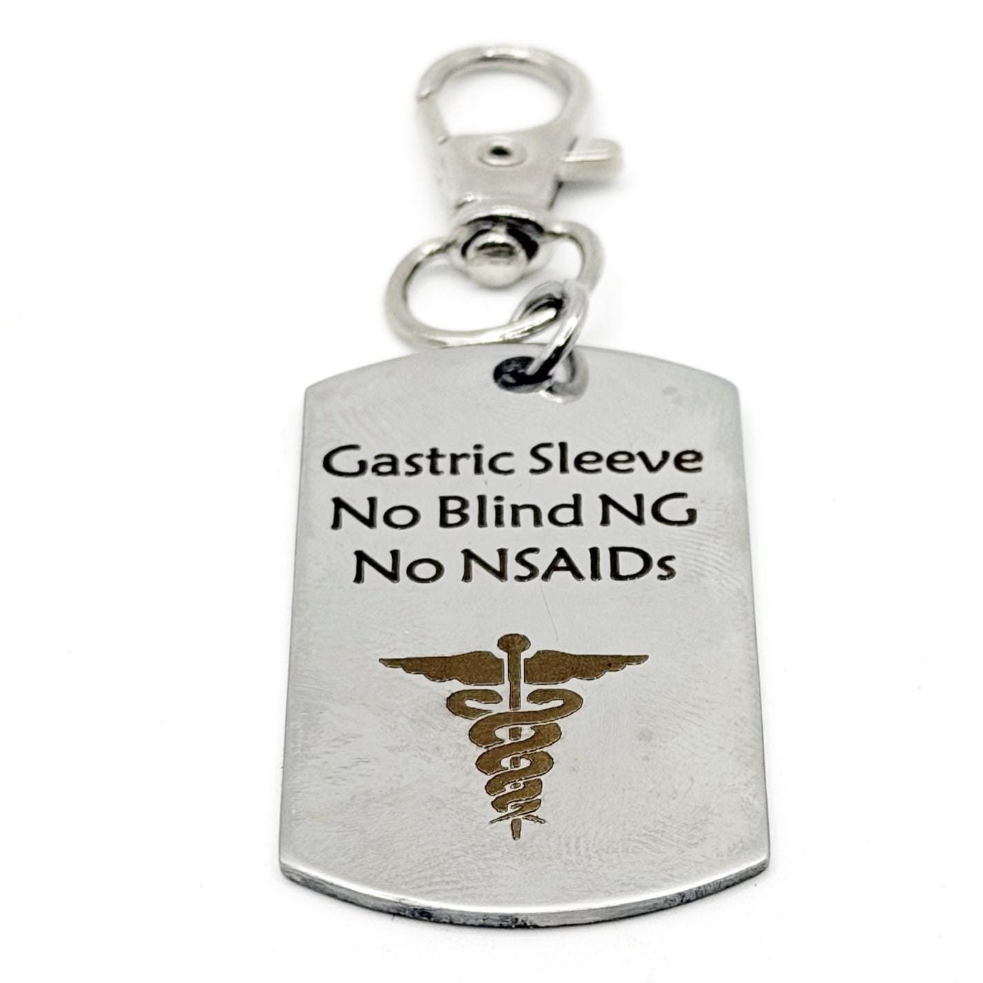 This stainless steel clip-on charm is designed to clearly communicate important medical information in a durable and dependable way. Featuring the exact engraving “Gastric Sleeve No Blind NG No NSAIDS,” this 43mm x 23mm dog tag style charm provides a visible and practical solution for carrying essential health details.
