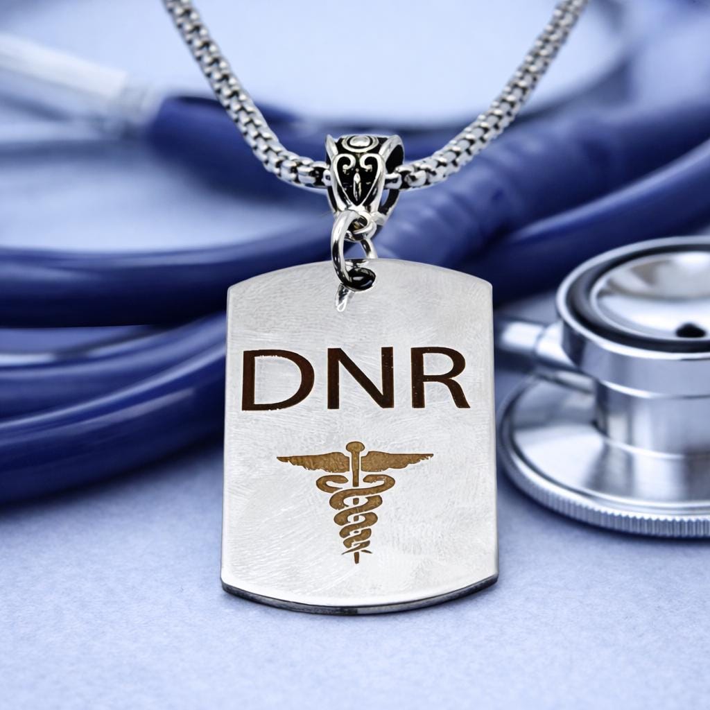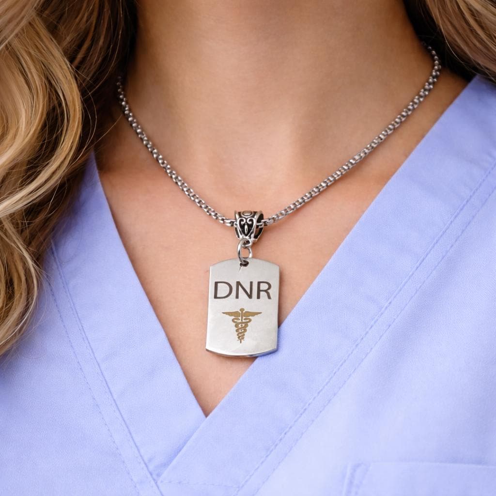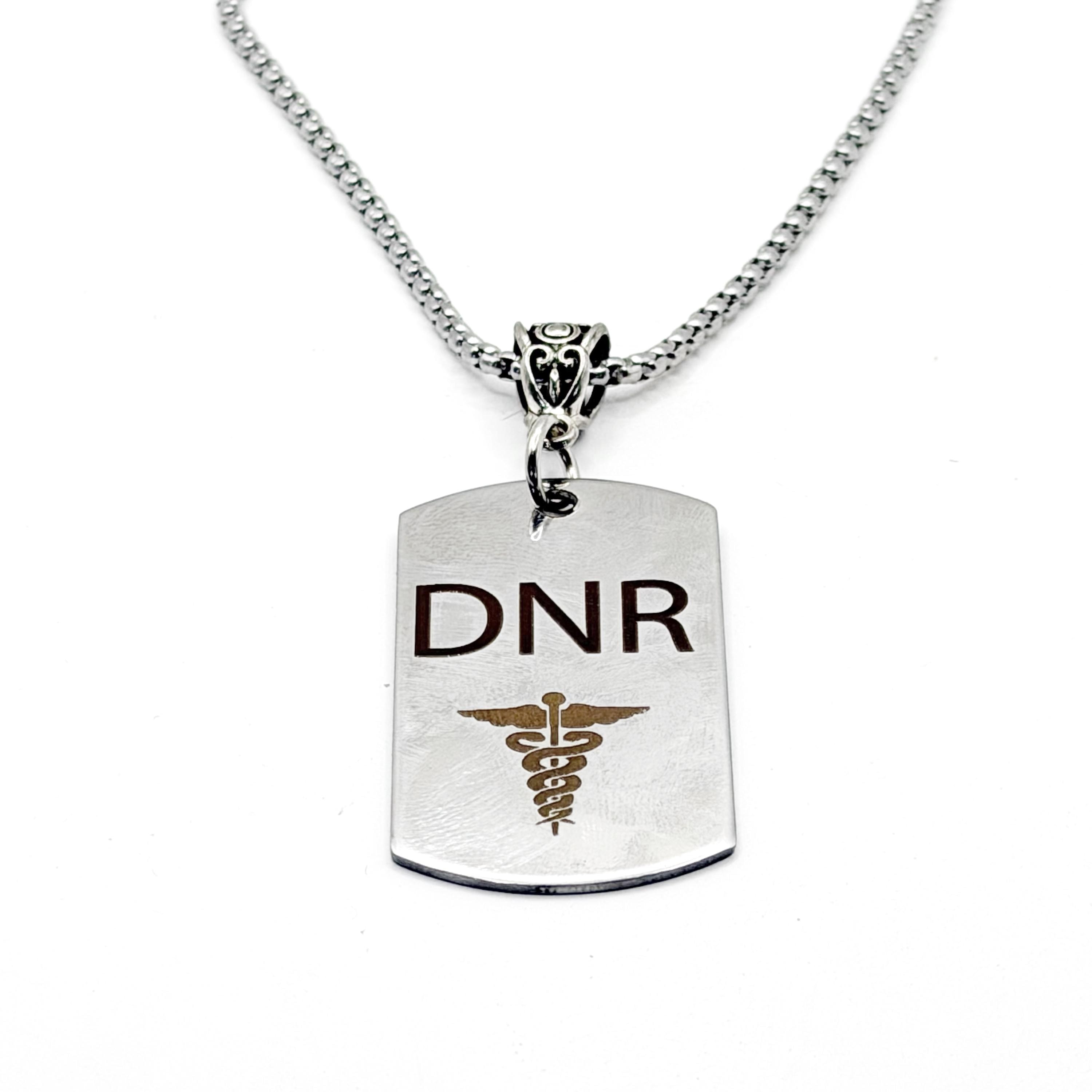 This stainless steel DNR Medical Caduceus Charm Necklace is a meaningful and practical piece designed to serve as a clear medical identifier. The charm is engraved with “DNR” above a detailed caduceus symbol, offering a clean and professional look suitable for everyday wear. The pendant measures 43mm x 24mm and is paired with a durable stainless steel rounded box chain, available in your choice of length for a comfortable fit. This necklace makes a thoughtful gift for those with Do Not Resuscitate directives or anyone seeking a reliable medical alert accessory. Crafted from stainless steel for lasting durability, it resists tarnishing with proper care. To maintain its shine, avoid prolonged exposure to water and harsh chemicals and clean gently with a soft cloth.