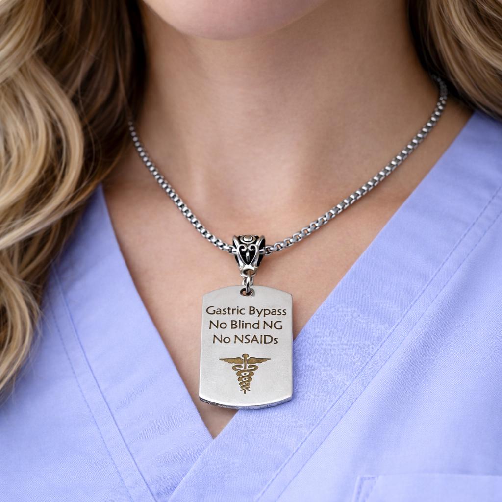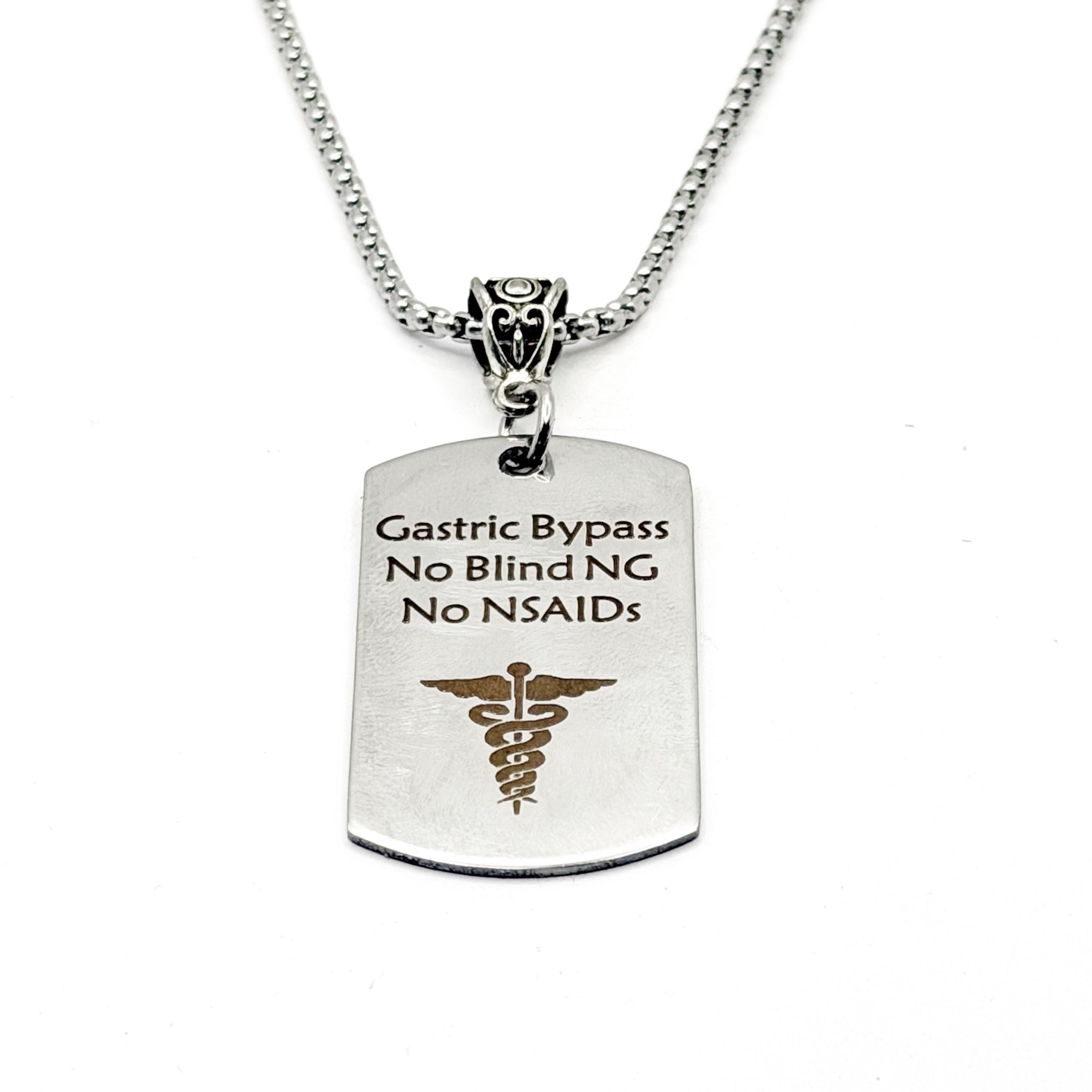 This stainless steel Gastric Bypass Medical Alert Charm Necklace is designed to provide clear and essential medical information in a clean, professional format. The charm is engraved with “Gastric Bypass No Blind NG No NSAIDs,” offering important guidance at a glance. Measuring 43mm x 24mm, the pendant is paired with a durable stainless steel rounded box chain available in your choice of length for comfortable everyday wear. This piece makes a thoughtful and practical gift for individuals who require visible medical alert identification. Crafted from stainless steel for long-lasting durability, it resists tarnishing with proper care. To maintain its finish, avoid prolonged exposure to water and harsh chemicals and clean gently with a soft cloth.