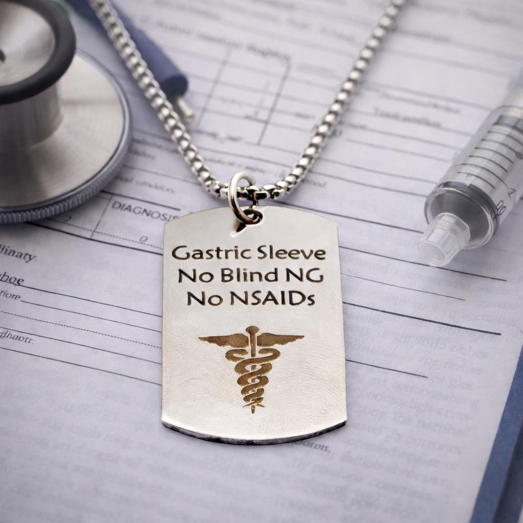 With its sleek, polished finish and medical-inspired design, this necklace offers both function and peace of mind. It makes a thoughtful and practical gift for yourself or a loved one who has undergone gastric sleeve surgery or requires specific medical precautions. Built for everyday wear, stainless steel resists tarnishing and maintains its shine over time. To care for your necklace, simply clean with a soft cloth and avoid harsh chemicals to preserve its finish.