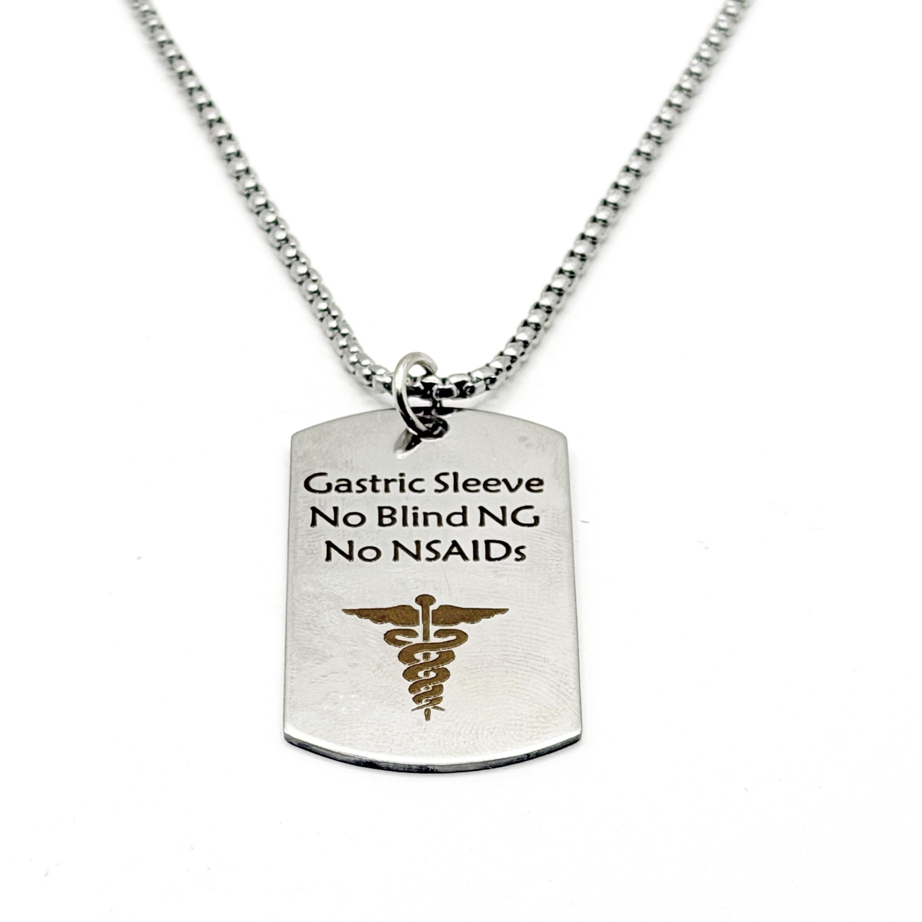 This stainless steel medical alert charm necklace is designed to provide clear, essential information in a clean and professional format. Engraved with “Gastric Sleeve No Blind NG No NSAIDs,” this piece helps communicate critical medical details when it matters most. The durable stainless steel charm measures approximately 43mm x 24mm and is paired with a stainless steel rounded box chain available in your choice of length for a comfortable fit.