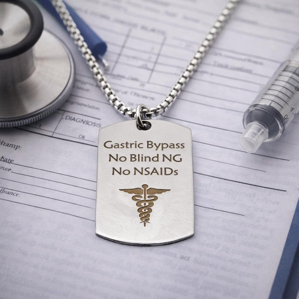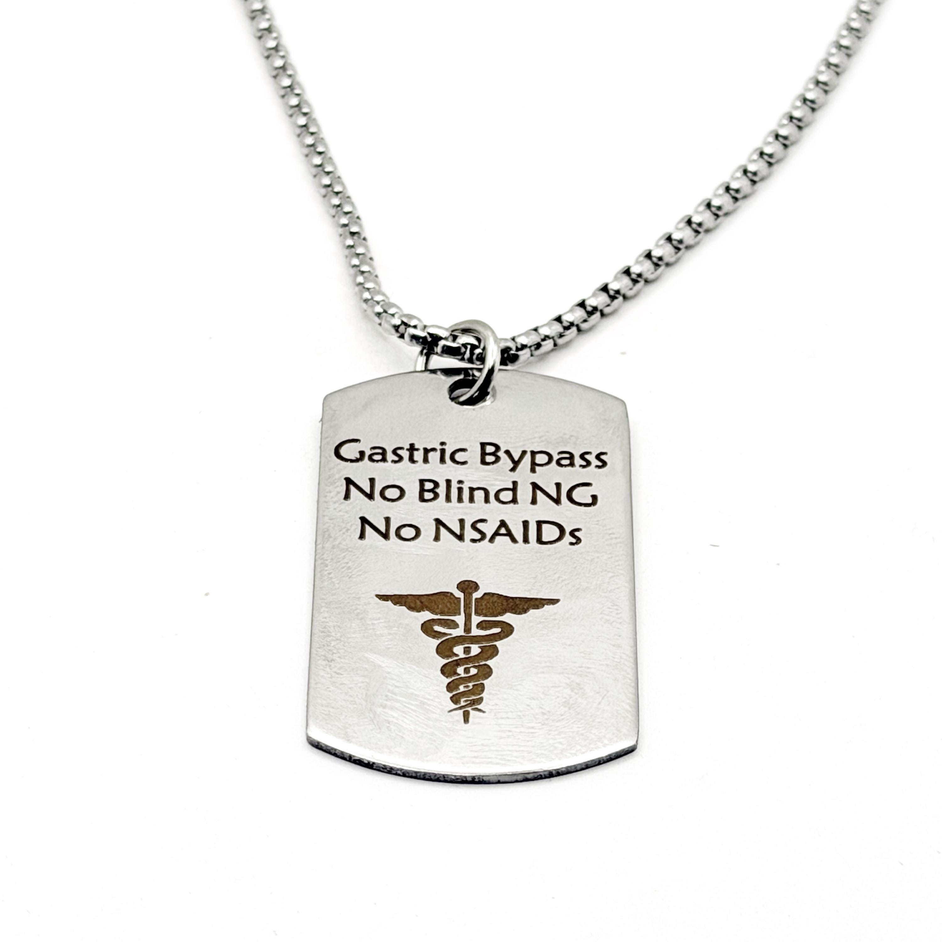 This stainless steel medical alert charm necklace is designed to clearly communicate essential health information in a clean and professional way. Engraved with “Gastric Bypass No Blind NG No NSAIDs,” it helps ensure critical details are easily visible when needed. The stainless steel charm measures approximately 43mm x 24mm and is paired with a durable stainless steel rounded box chain, available in your choice of length for comfortable everyday wear.