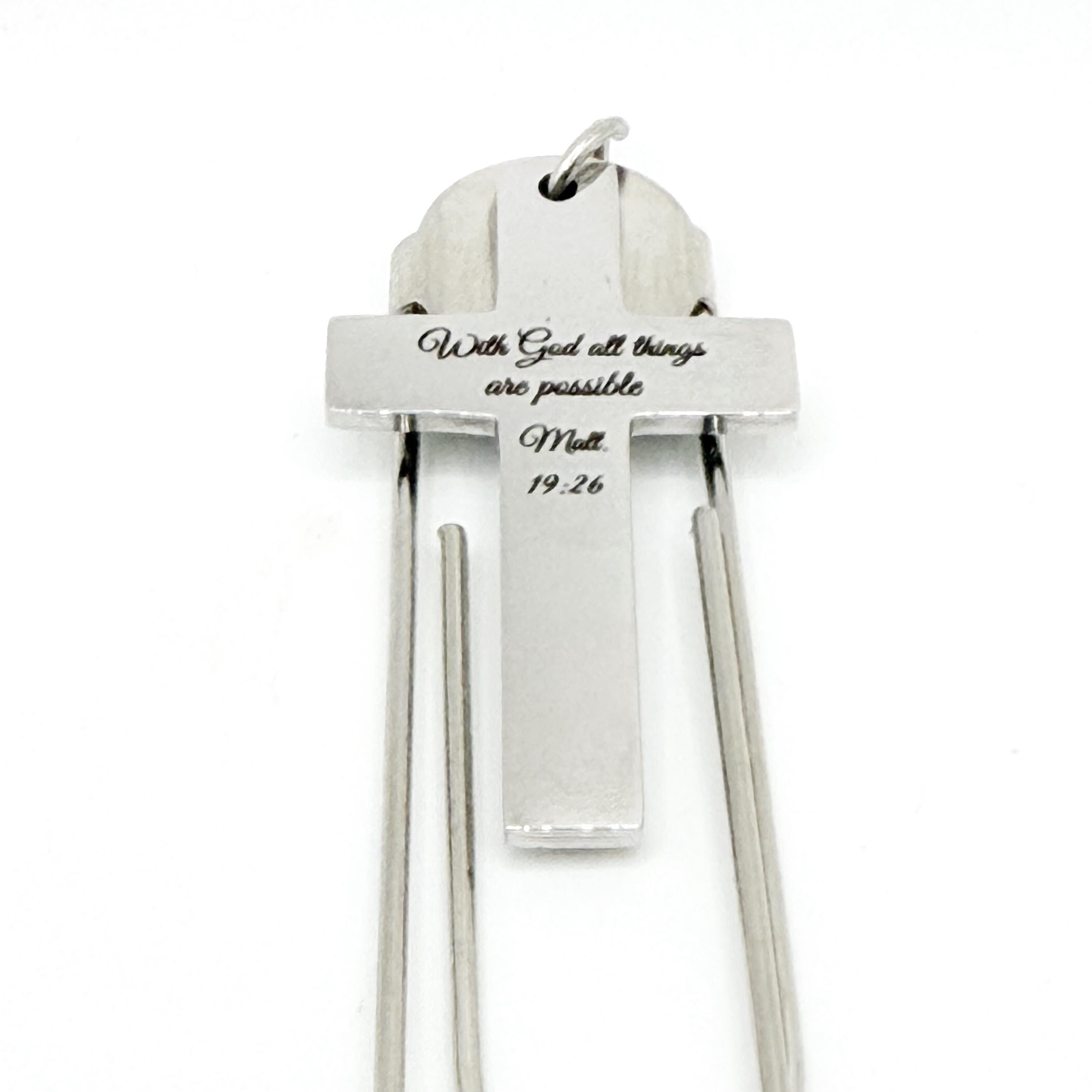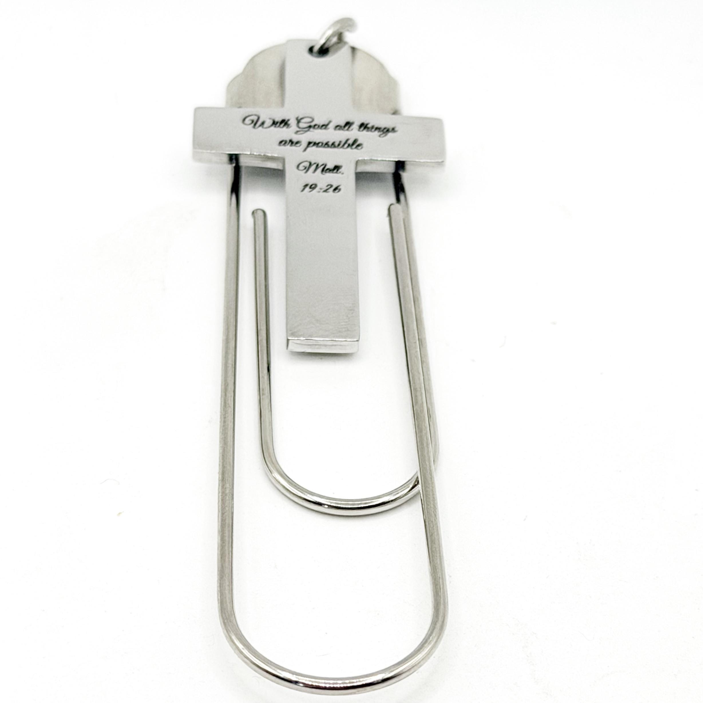 Carry a reminder of faith and encouragement with you wherever you read. This beautifully crafted paperclip bookmark features a stainless steel engraved cross charm with the uplifting message: