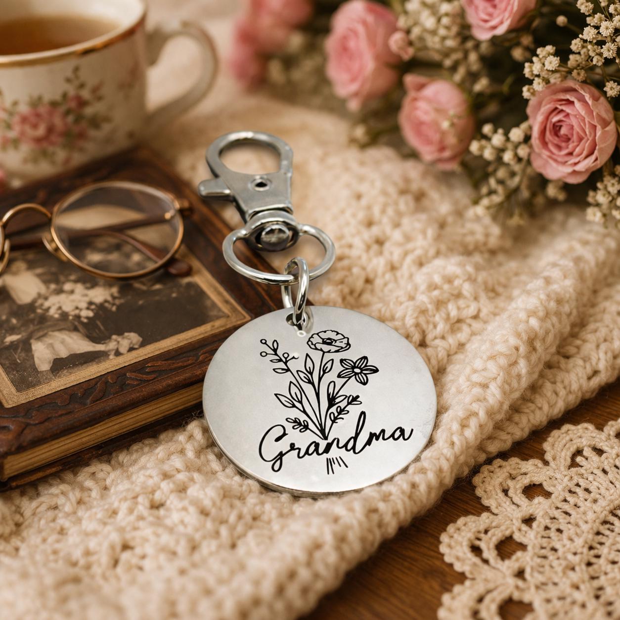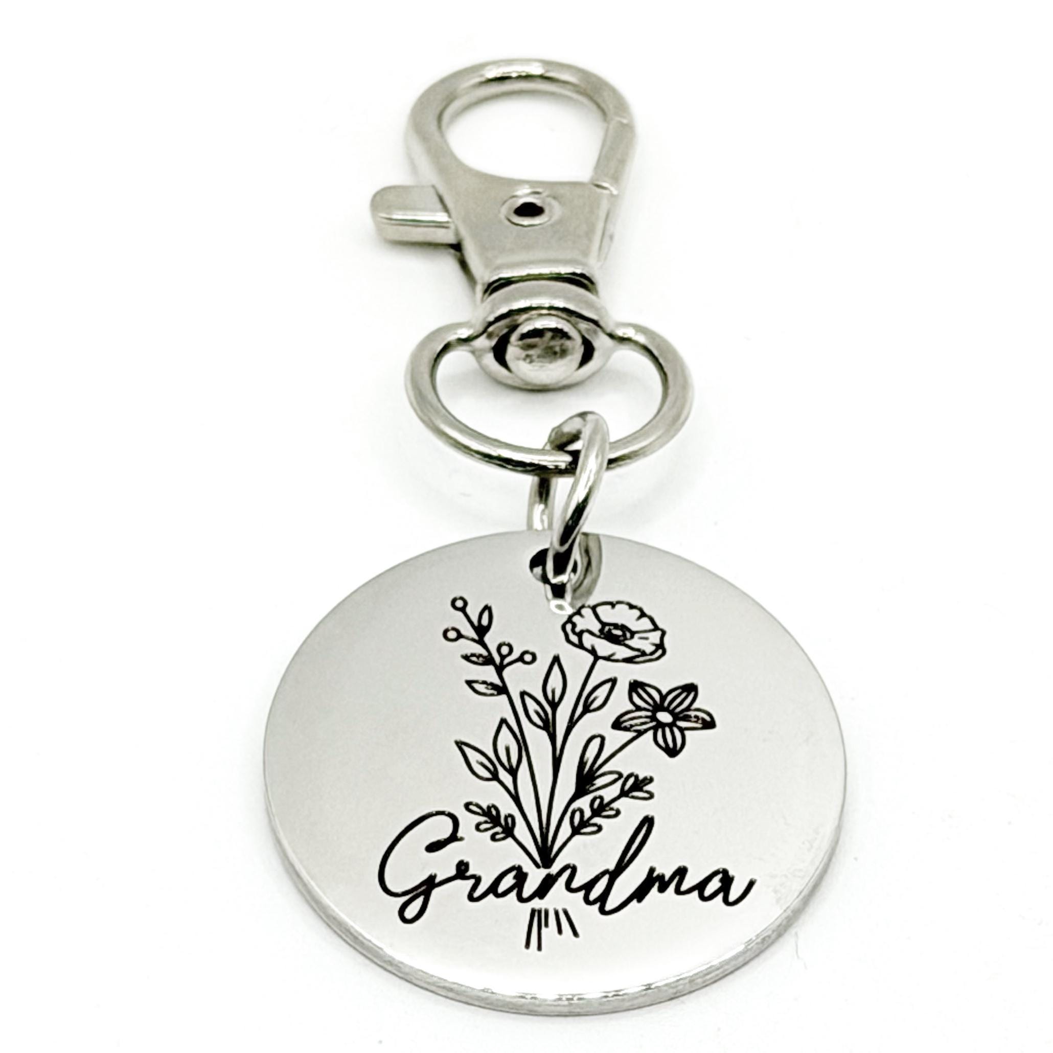 Celebrate the love and legacy of Grandma with this beautifully engraved clip on charm. Featuring the word Grandma in an elegant script with a delicate floral design, this piece is a meaningful reminder of faith, family, and cherished moments. Crafted from durable stainless steel, the 25mm charm is paired with a secure 32mm alloy lobster clasp for easy attachment to keyrings, purses, backpacks, or Bible accessories.