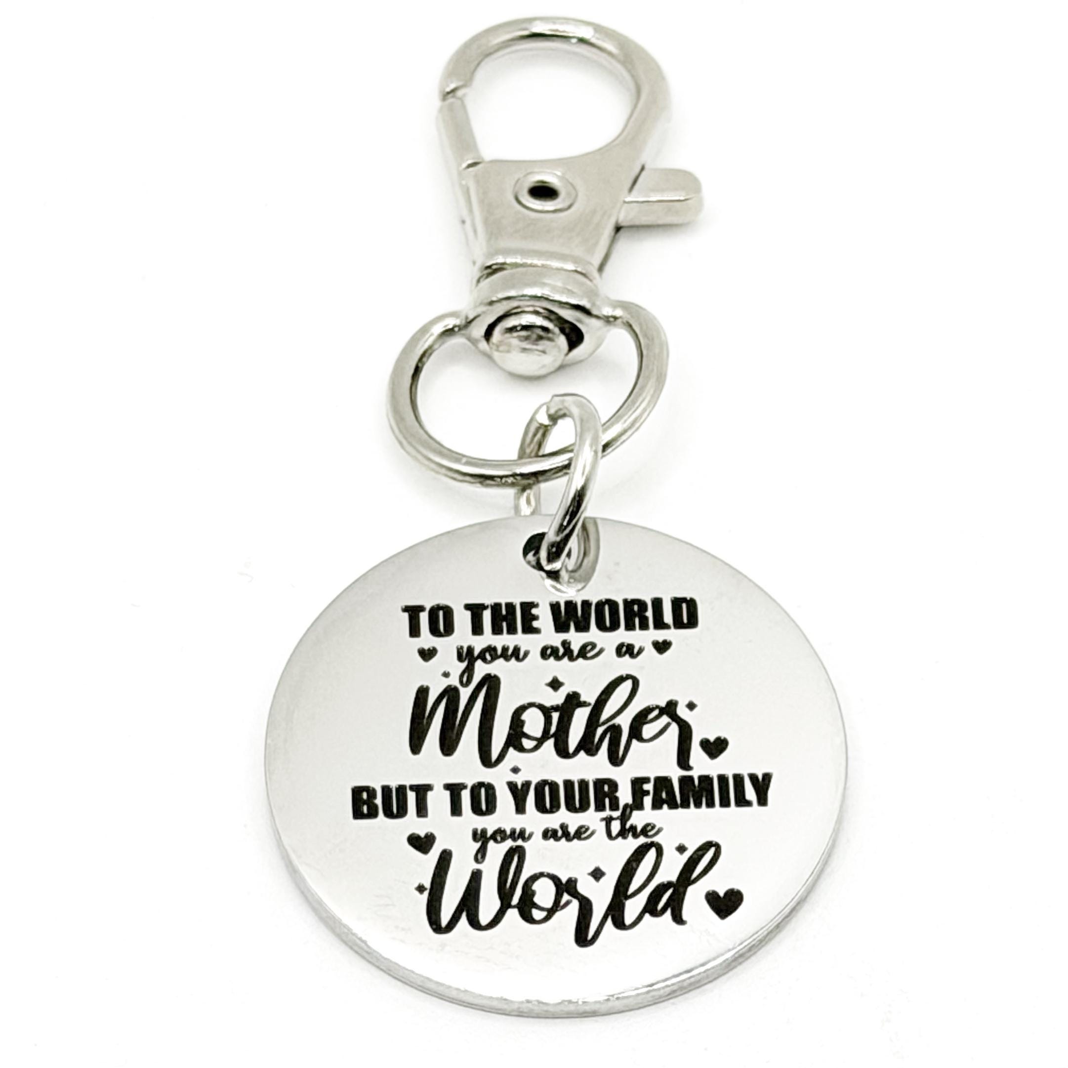 Celebrate the heart of the family with this meaningful clip on charm, beautifully engraved with the message To the world you are a mother but to your family you are the world. This heartfelt design is a daily reminder of love, strength, and the special role a mother holds. Crafted from durable stainless steel, the 25mm charm is paired with a secure 32mm alloy lobster clasp, making it easy to attach to keyrings, purses, backpacks, or diaper bags.
