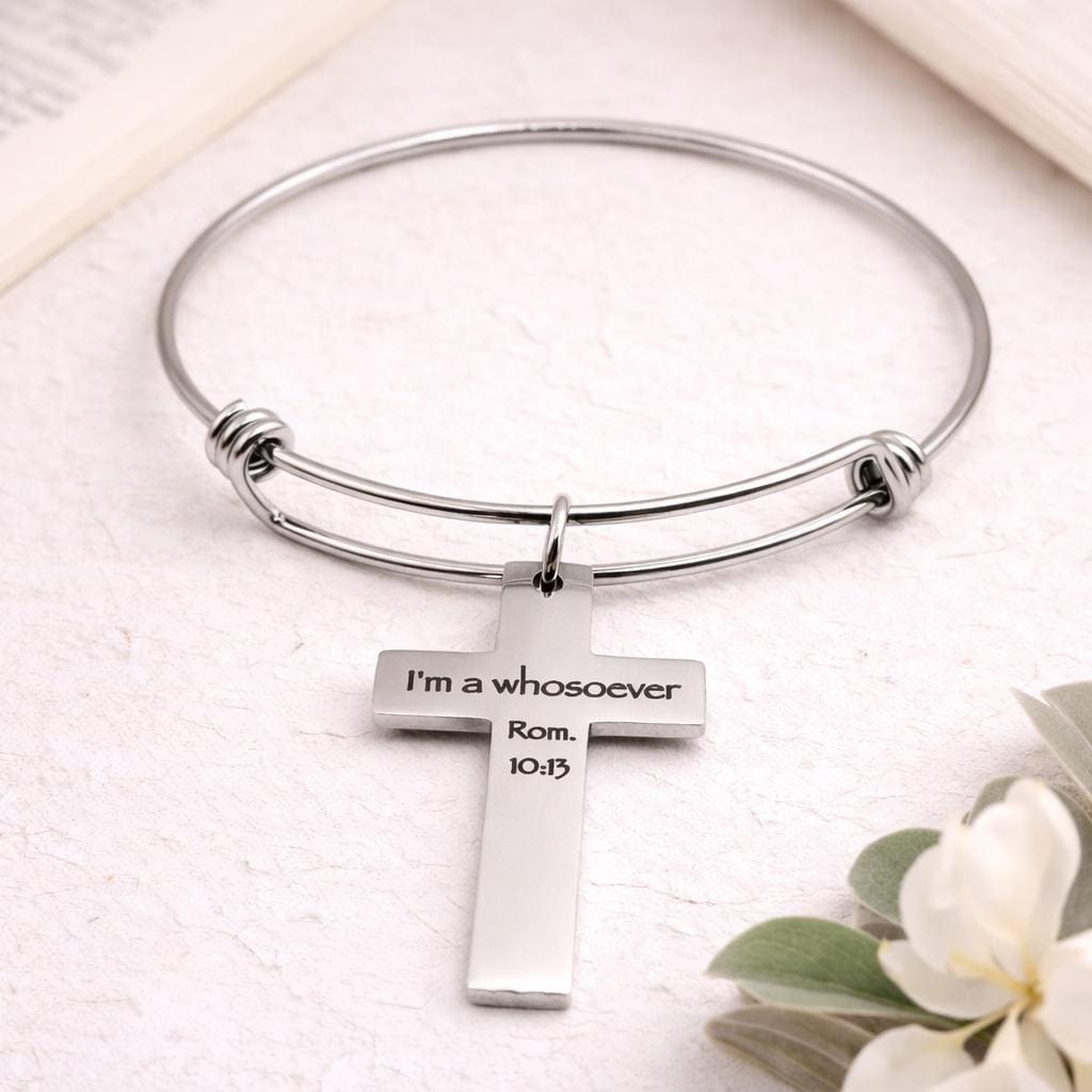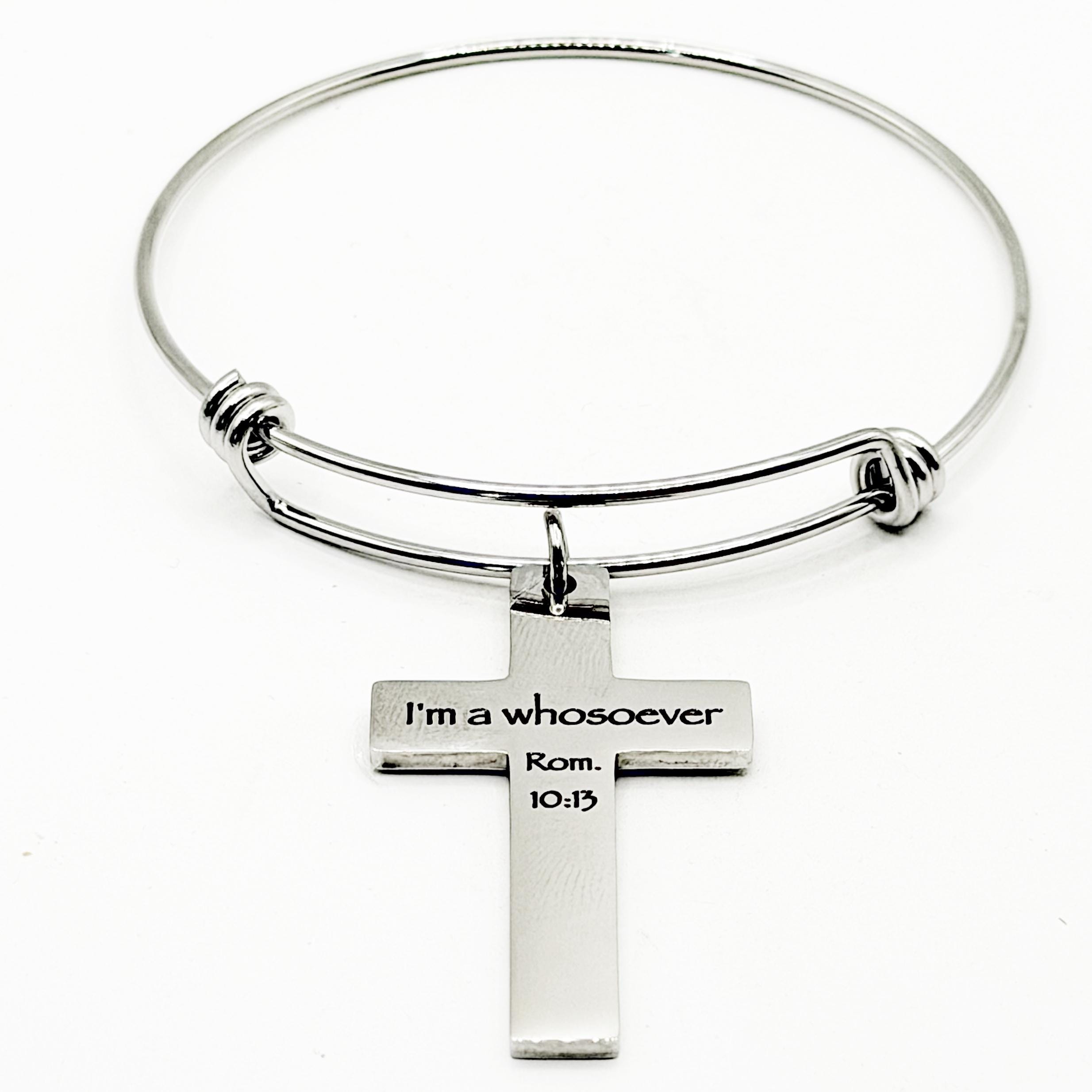 Keep a meaningful reminder of faith close with this stainless steel cross charm bracelet engraved with “I'm a whosoever Rom. 10:13.” Inspired by the powerful promise that all who call on His name are welcomed, this piece offers both encouragement and simplicity in a timeless design. The cross charm measures approximately 1 5/8 inches long by 1 inch wide and is attached to a stainless-steel expanding bangle, designed for a comfortable and flexible fit for everyday wear. Crafted from stainless steel, it provides lasting durability with a clean, polished finish. This bracelet makes a thoughtful gift for friends, family, or anyone seeking to carry a visible expression of their faith. To care for your bracelet, avoid exposure to harsh chemicals and store in a dry place when not in use to maintain its shine.