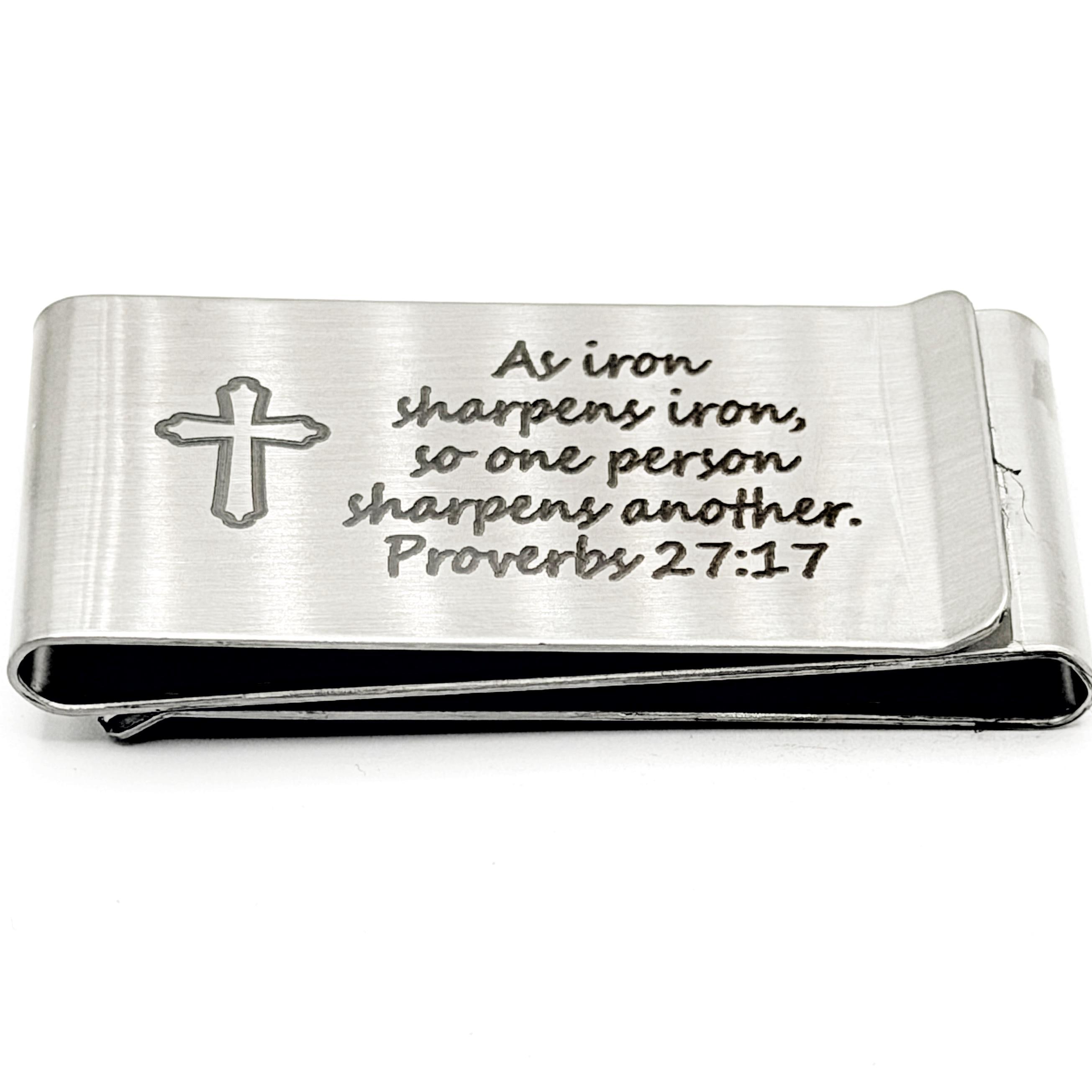 Carry a meaningful reminder of strength and connection with this stainless steel money clip engraved with the message “As iron sharpens iron, so one person sharpens another. Proverbs 27:17”. Designed to inspire and encourage, this piece represents the power of relationships that build and strengthen one another.