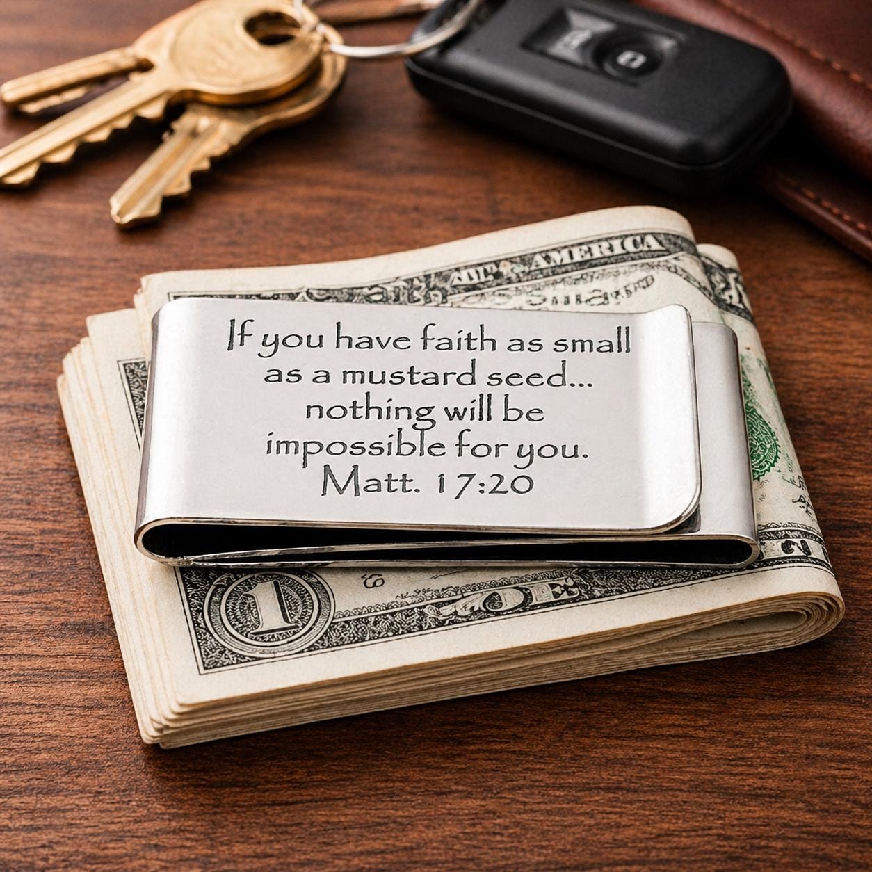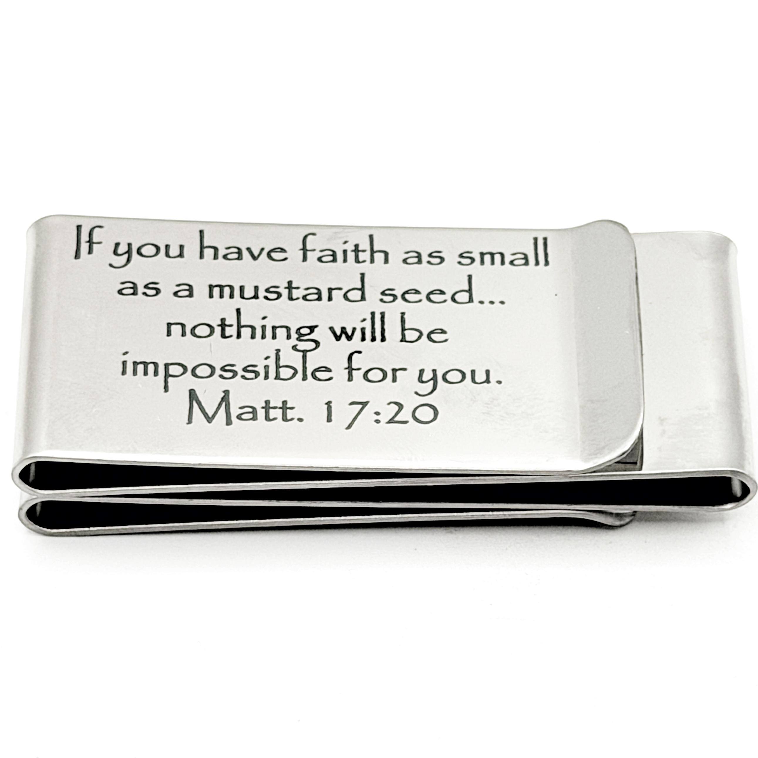 Carry a powerful reminder of faith with this stainless steel money clip engraved with the message “If you have faith as small as a mustard seed... nothing will be impossible for you. Matt. 17:20”. This meaningful piece serves as a daily encouragement to trust in even the smallest measure of faith.