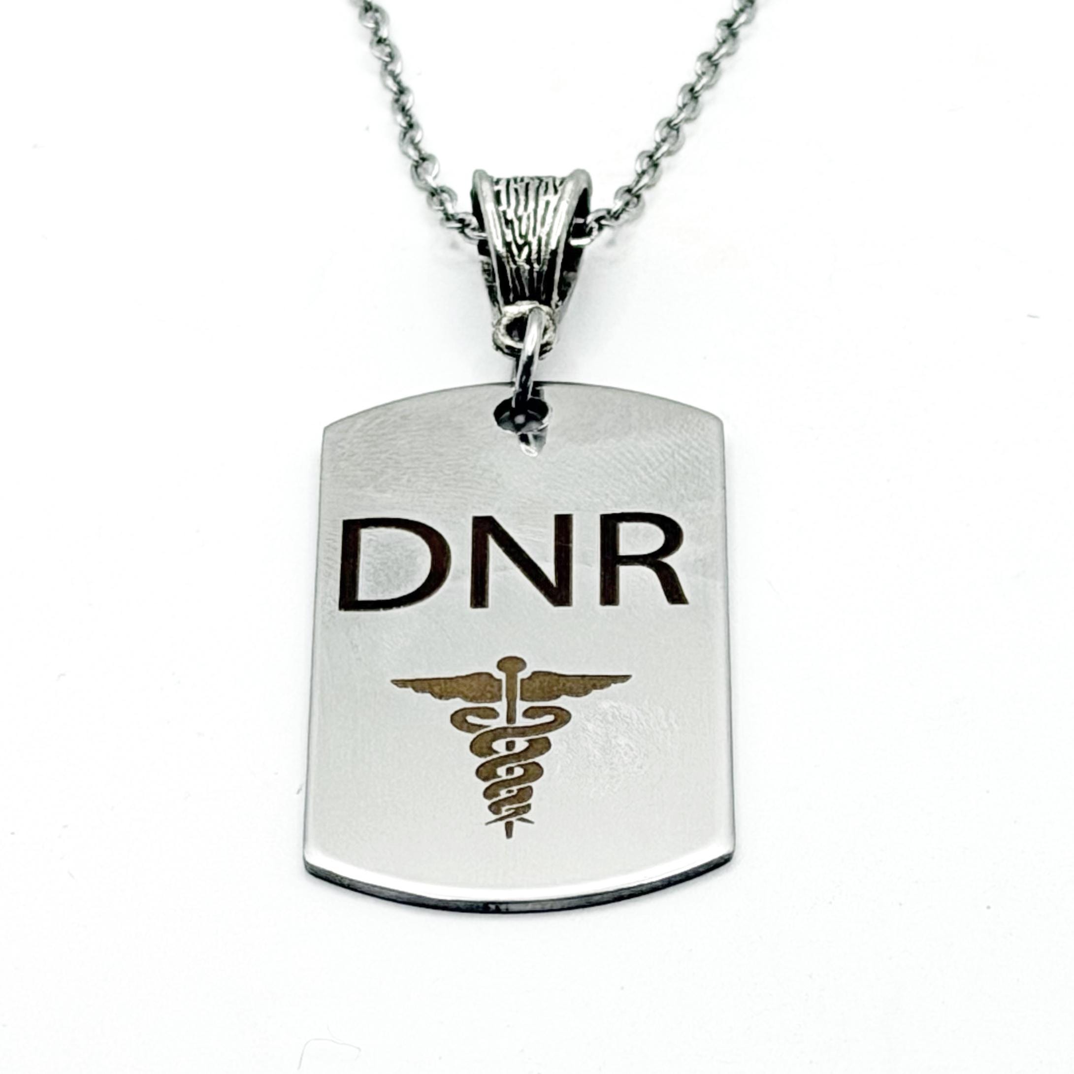 This stainless steel DNR dog tag necklace is designed to clearly communicate an important message while offering durability and everyday wearability. Featuring the exact engraving “DNR” along with a medical caduceus symbol, this 43mm x 23mm charm provides a bold yet clean look that is easy to recognize.