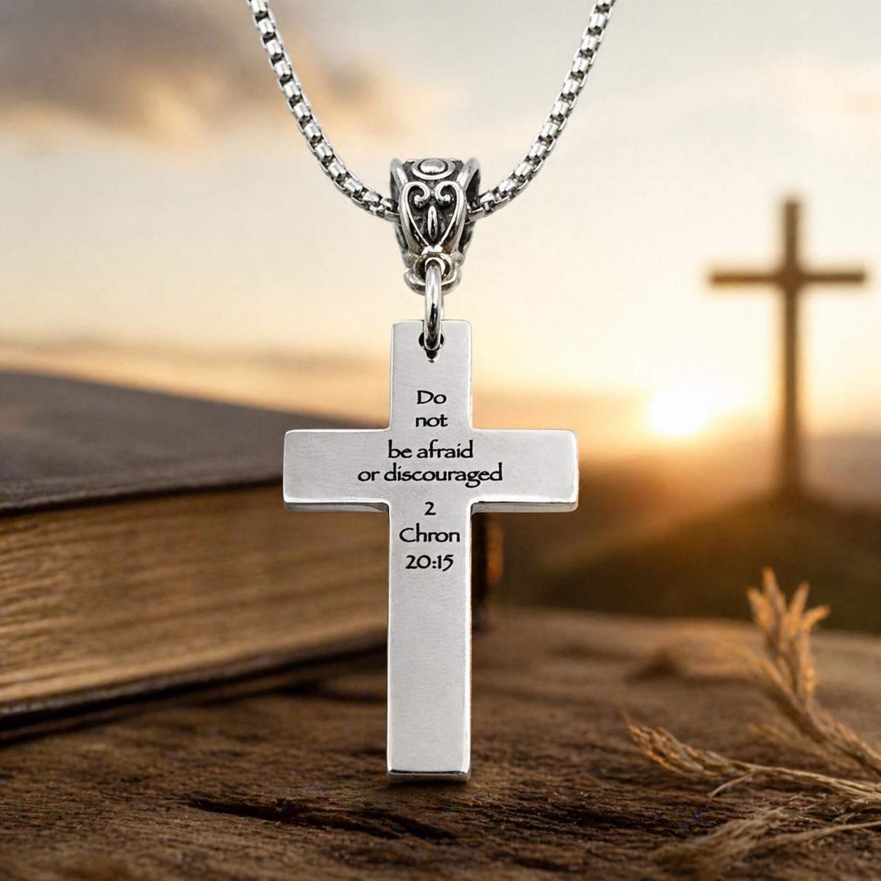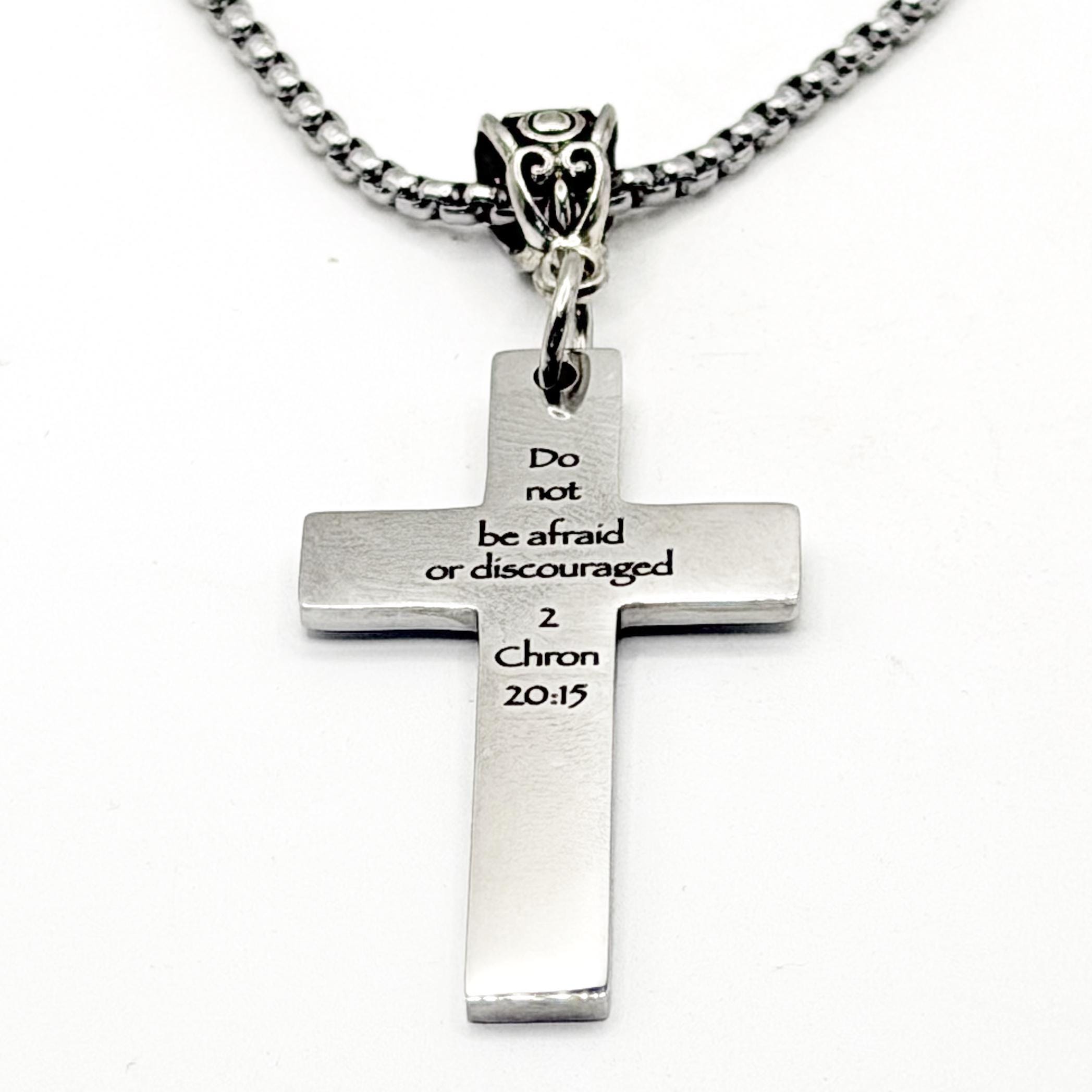 Carry a daily reminder of strength and faith with this beautifully engraved cross necklace. Featuring the powerful message “Do not be afraid or discouraged 2 Chron 20:15,” this piece offers comfort and encouragement wherever life leads. The cross charm is crafted from durable stainless steel and measures 1 5/8 inches long by 1 inch wide, creating a meaningful yet wearable statement. It hangs from a stainless steel rounded box chain with a secure alloy V-shaped bale, available in your choice of length for the perfect fit. This necklace makes a thoughtful gift for loved ones facing challenges, celebrating milestones, or strengthening their faith. To care for your piece, avoid harsh chemicals and store in a dry place to maintain its shine.