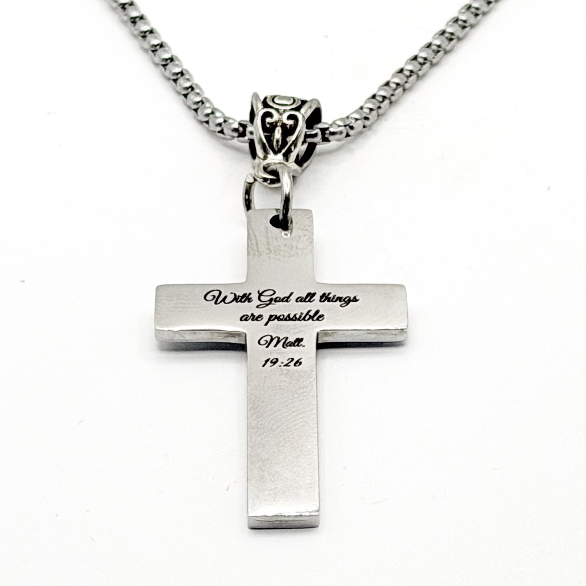 Carry a powerful reminder of faith and possibility with this engraved cross necklace featuring “With God all things are possible Matt. 19:26.” This meaningful message reflects strength, hope, and trust in His plan through every season of life. The cross charm is crafted from durable stainless steel and measures 1 5/8 inches long by 1 inch wide, offering a timeless and wearable design. It is paired with a stainless steel rounded box chain and secured with an alloy V-shaped bale, available in your choice of length for a comfortable fit. This necklace makes a thoughtful gift for encouragement, milestones, or anyone walking in faith. To care for your piece, avoid harsh chemicals and store in a dry place to maintain its shine.