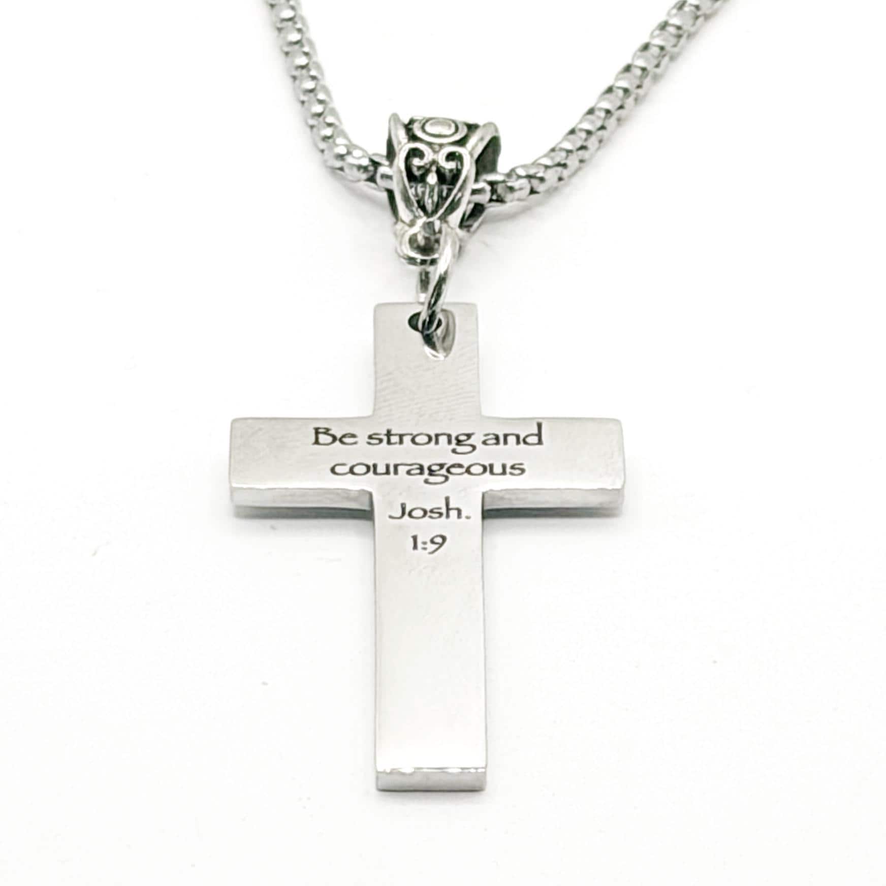 Carry a bold reminder of strength and faith with this engraved cross necklace featuring “Be strong and courageous Josh. 1:9.” This powerful message encourages confidence and trust in God’s presence through every challenge. The cross charm is crafted from durable stainless steel and measures 1 5/8 inches long by 1 inch wide, offering a timeless and meaningful design. It is paired with a stainless steel rounded box chain and secured with an alloy V-shaped bale, available in your choice of length for a comfortable fit. This necklace makes a thoughtful gift for encouragement, life transitions, or anyone walking in faith. To care for your piece, avoid harsh chemicals and store in a dry place to maintain its shine.