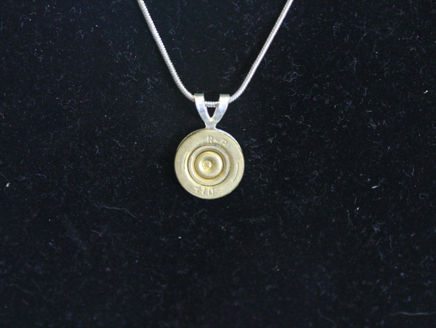 Unique necklace for those that love shooting sports - includes a cut 410 bore shotgun shell head pendant on an 18 inch silver tone chain