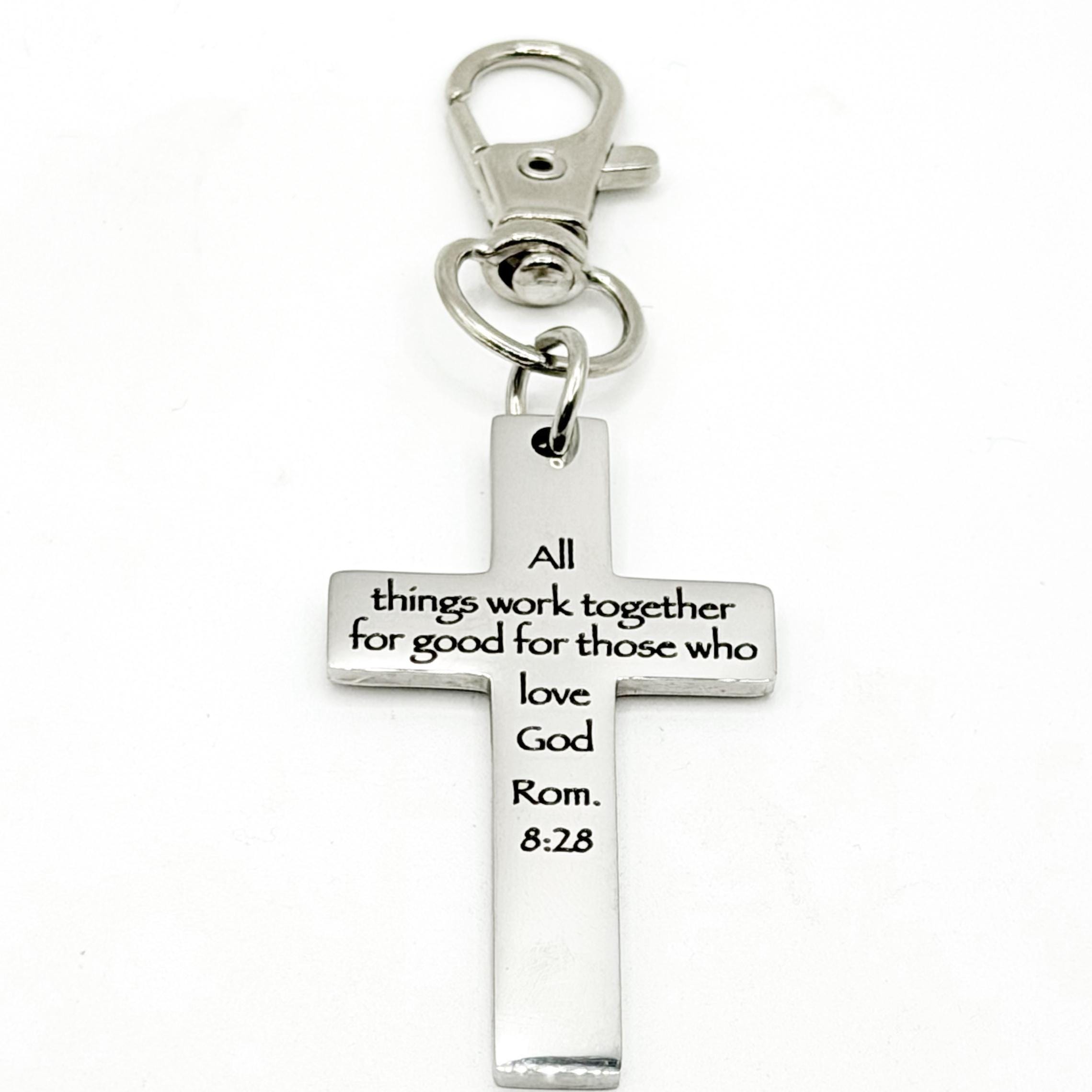 Carry a daily reminder of faith and purpose with this stainless steel cross clip on charm, engraved with a powerful message from Romans 8:28. Designed with a durable stainless steel cross and a 32mm alloy lobster clasp, this piece easily attaches to keyrings, bags, or zippers for meaningful wear anywhere you go. Measuring 1 5/8 inches long by 1 inch wide, it offers a noticeable yet comfortable presence. This charm makes a thoughtful gift for encouragement, spiritual growth, or support during life’s challenges. Crafted for everyday use, the stainless steel material resists tarnishing and maintains its shine with simple care. To preserve its finish, avoid harsh chemicals and store in a dry place when not in use.