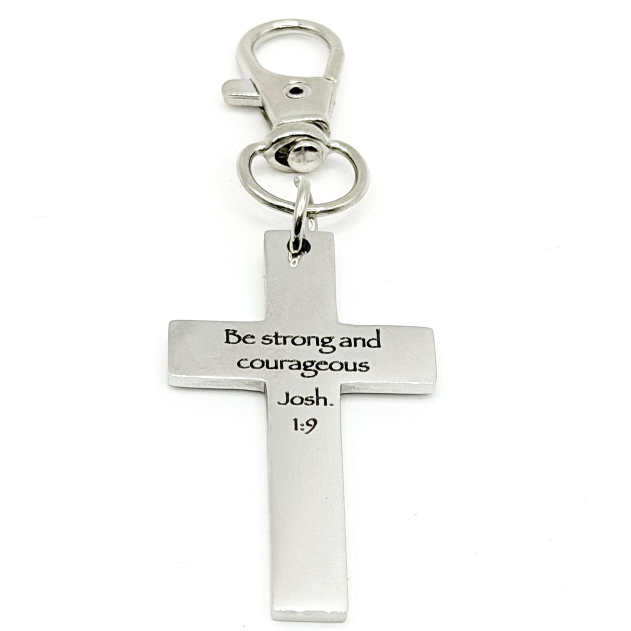 Carry a daily reminder of strength and faith with this stainless steel cross clip on charm, engraved with an encouraging message from Josh. 1:9. Crafted from durable stainless steel and paired with a 32mm alloy lobster clasp, this piece easily attaches to keyrings, bags, or zippers so you can keep its meaning close wherever you go. Measuring 1 5/8 inches long by 1 inch wide, it offers a balanced size that is both noticeable and comfortable for everyday use. This charm makes a meaningful gift for encouragement, support, or spiritual inspiration during life’s challenges. The stainless steel construction helps resist tarnishing and maintain its shine. To care for your piece, avoid exposure to harsh chemicals and store in a dry place when not in use.
