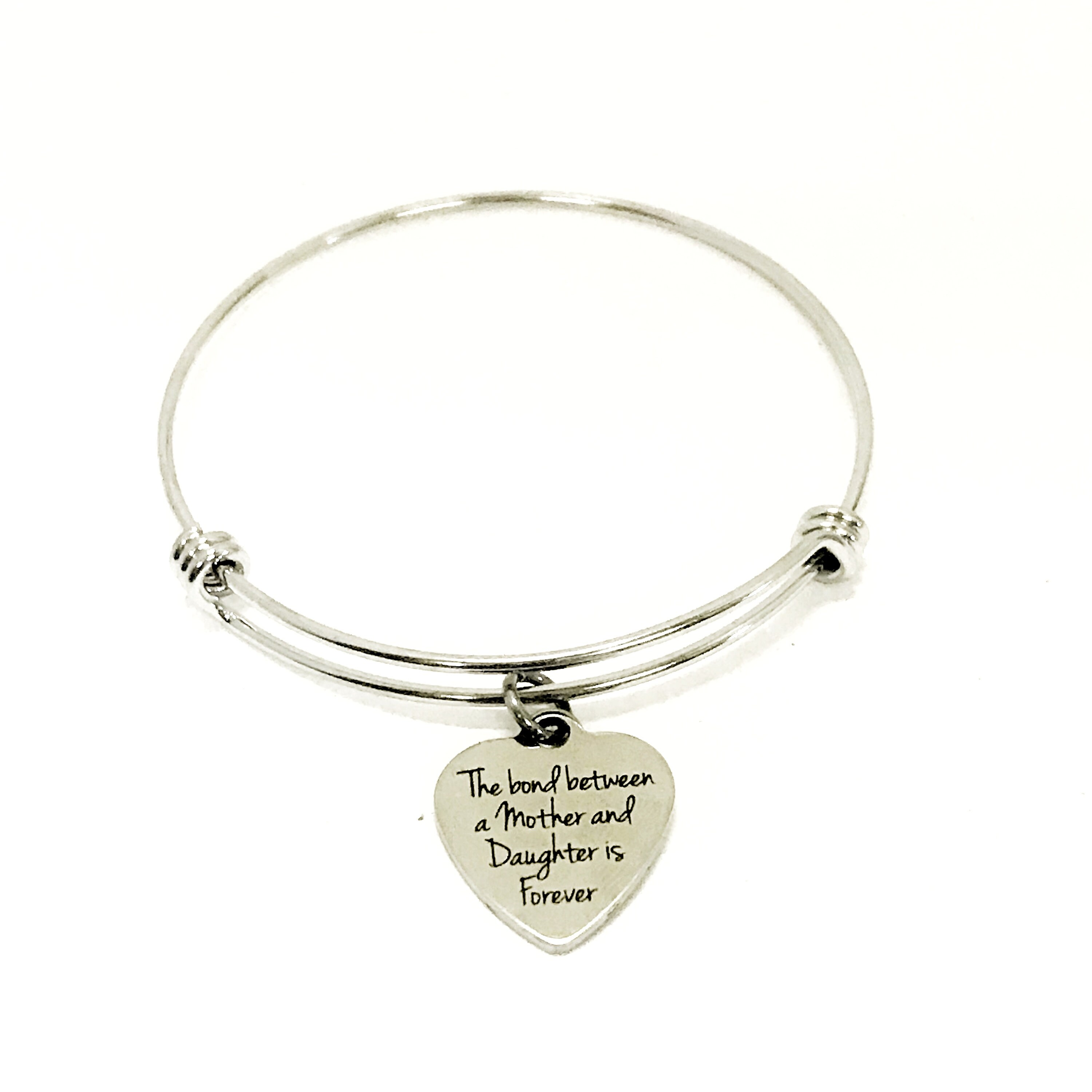 This is an expanding bangle bracelet with a stainless steel charm that says: "The Love Between A Mother and Daughter is Forever". This would be a great gift for your daughter or a new mom of a daughter. This bracelet expands to fit comfortably over any hand and fits any wrist size. The bracelet is made of stainless steel to withstand regular wear without tarnishing. Additional charms, such as a birthstone, can be added.