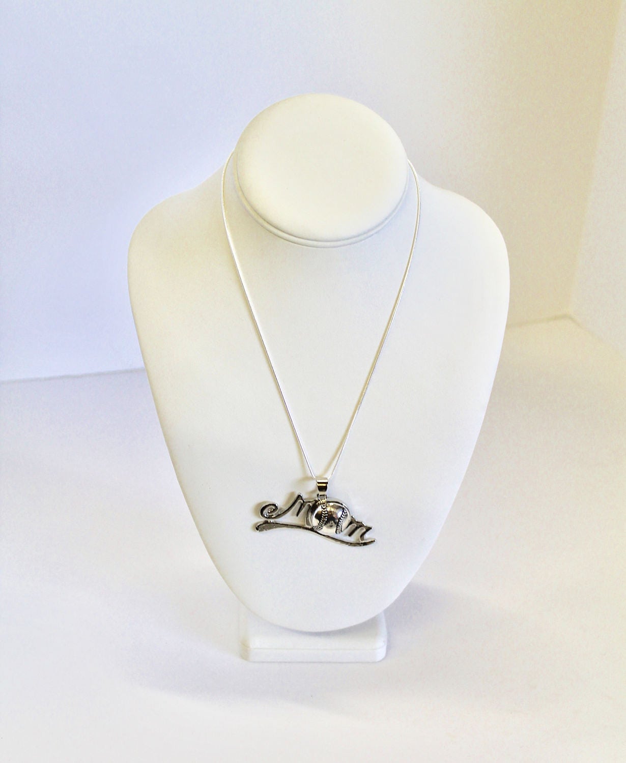 Show your love for your baseball player son with this silver tone baseball mom snap charm pendant necklace on your choice of either a 16, 18, 20, 22, 24, 26, 28 or 30 sterling silver plated snake chain. This would be a great gift for yourself another baseball mom! This can be customized with team colors or player numbers if desired. Please send me a Custom Order request if you would like those options.