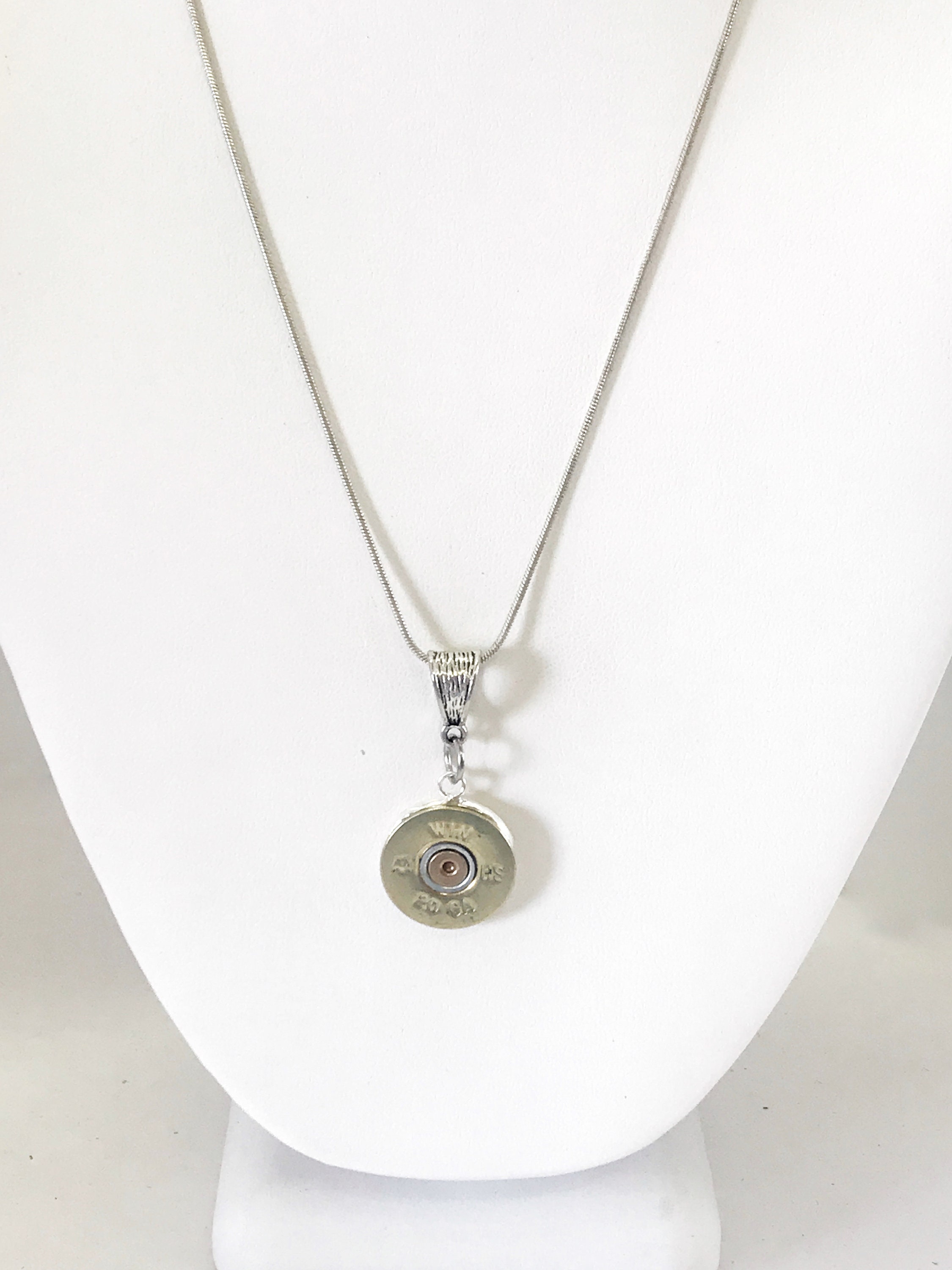 Unique necklace for those that love shooting sports - includes a cut 20 gauge shotgun shell head pendant on a snake chain. Great way to show your love for the shotgun sports - hunting, skeet, trap, or sporting clays.