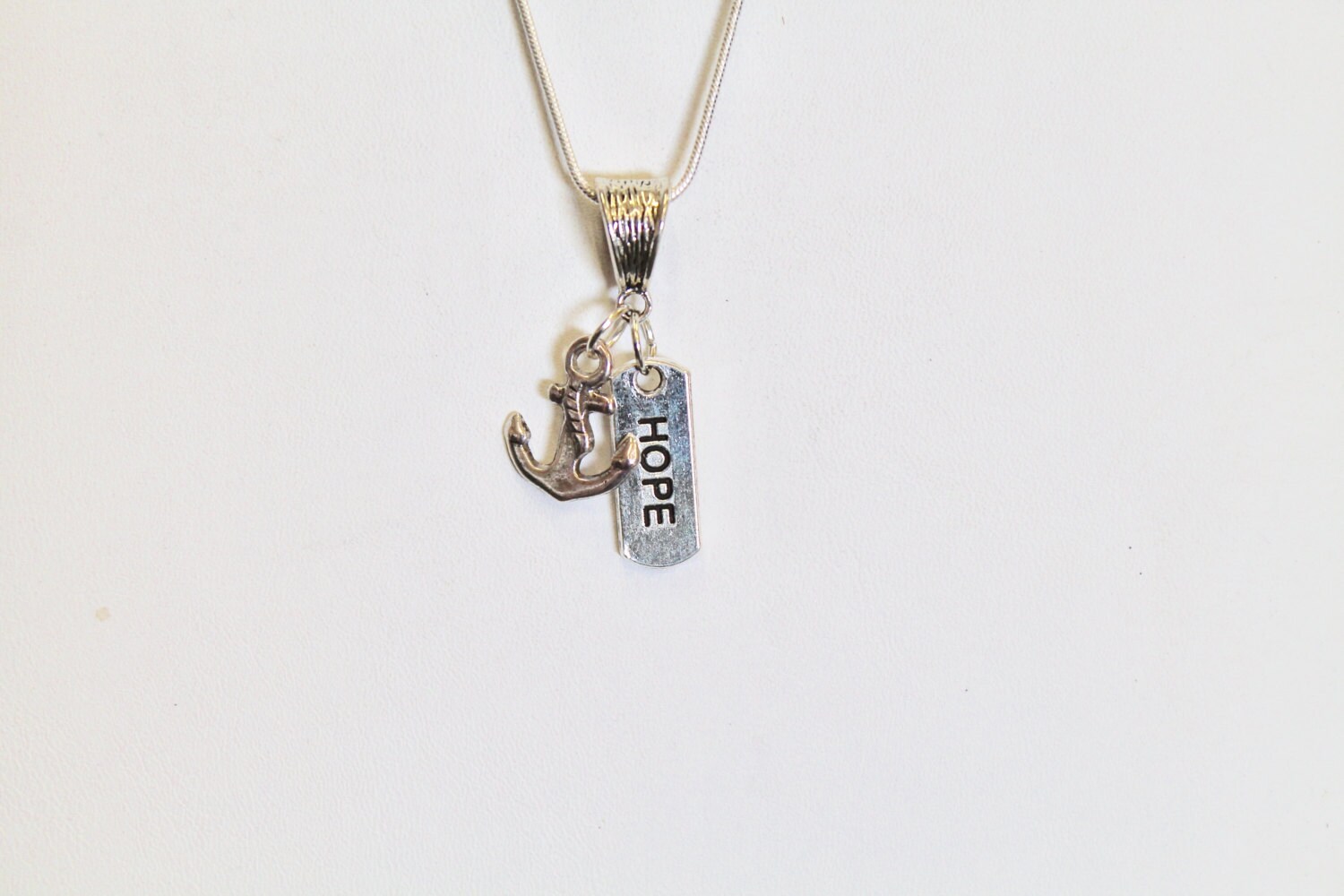 This is a silver tone This Hope Is Our Anchor pendant on a silver plated snake chain to represent the Bible verse of Hebrews 6:19. This verse is a comfort for through going through loss, grief or infertility. This would be a great gift for yourself or a gift for someone you love! This pendant is available on your choice of 16, 18, 20, 22, 24, 26, 28 or 30 inch silver plated snake chain. The pendant is also available for individual purchase if you have another chain that you would like to wear it on.