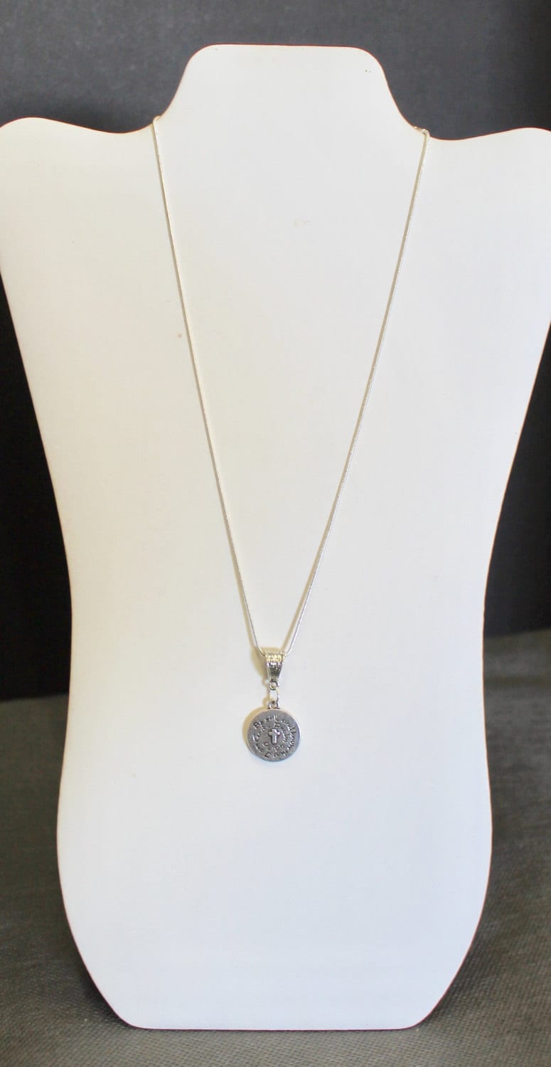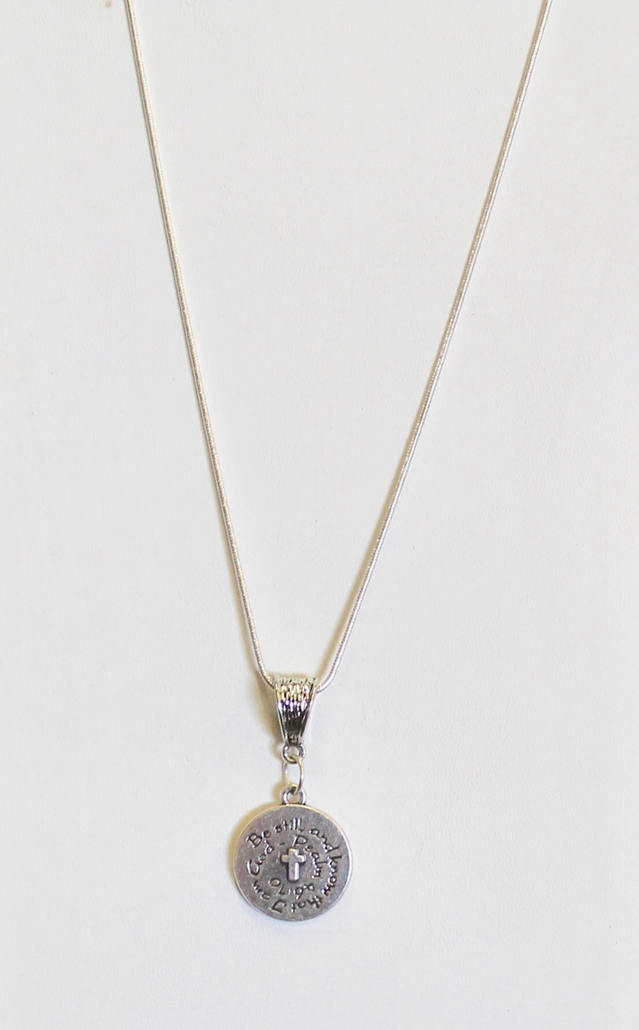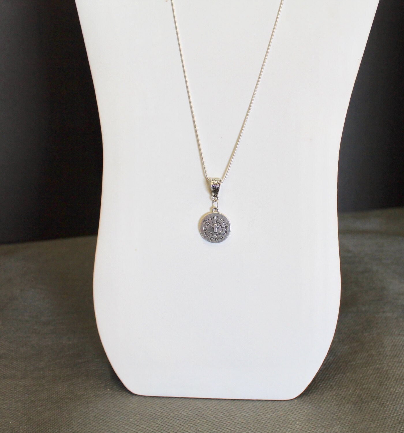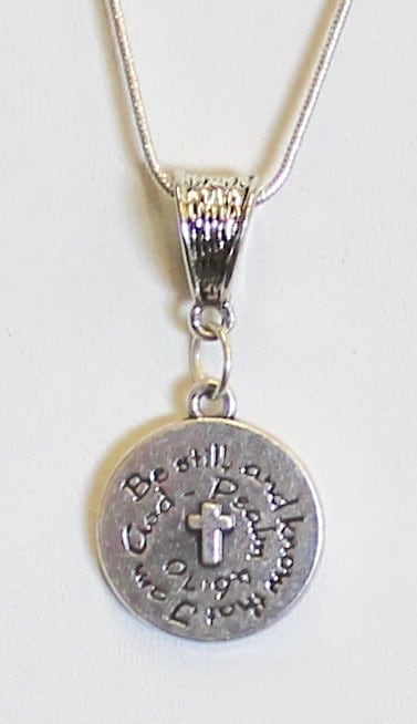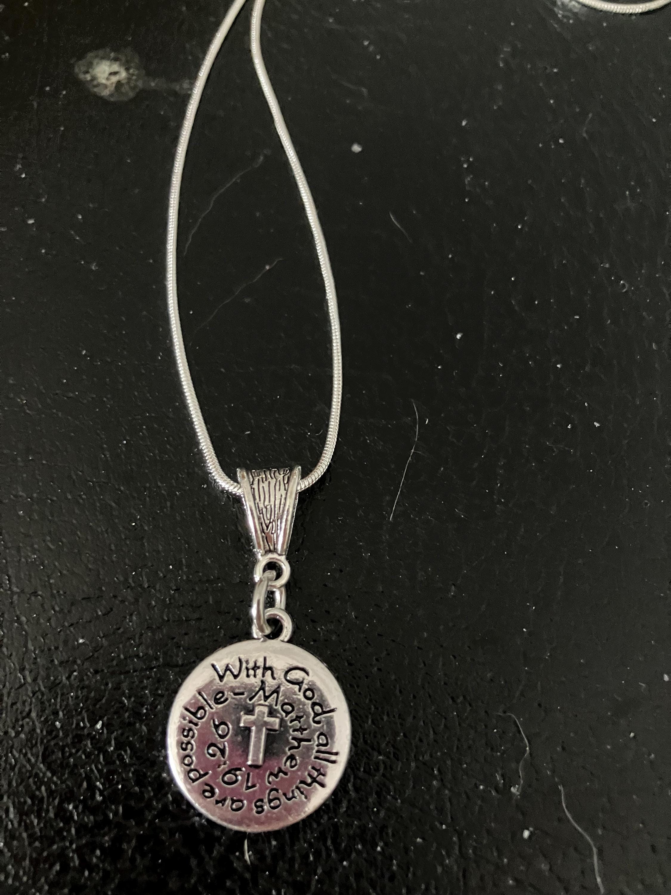 This is a silver tone With God All Things Are Possible pendant on a silver plated snake chain to represent the Bible verse of Matthew 19:26. This is a double sided pendant with the verse on both sides. This pendant is available on your choice of 16, 18, 20, 22, 24, 26, 28 or 30 inch silver plated snake chain. The pendant is also available for individual purchase if you have another chain that you would like to wear it on.