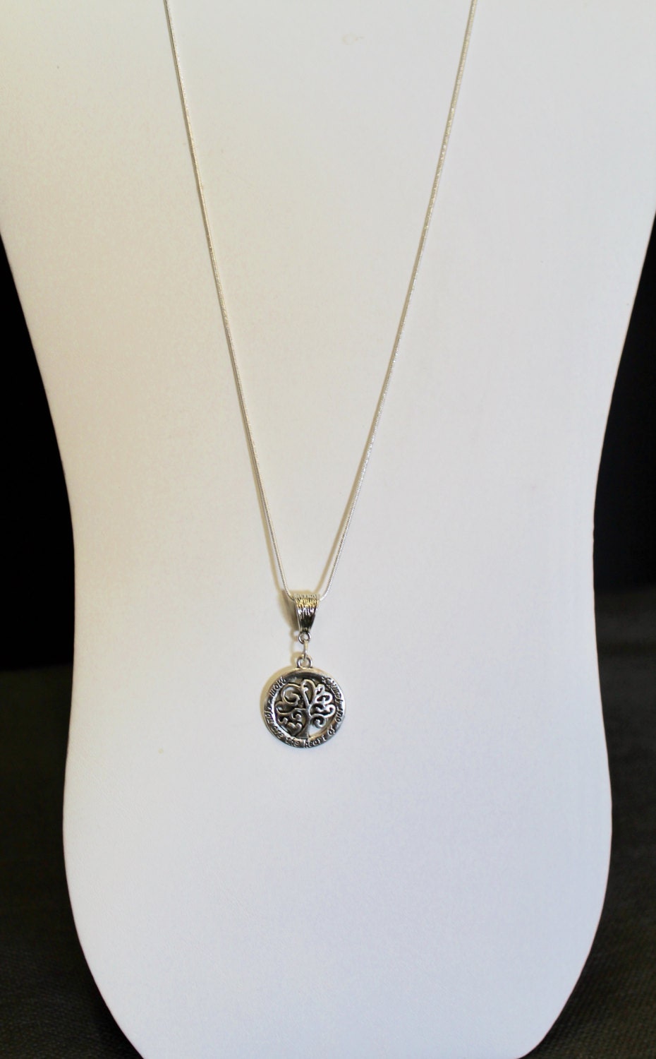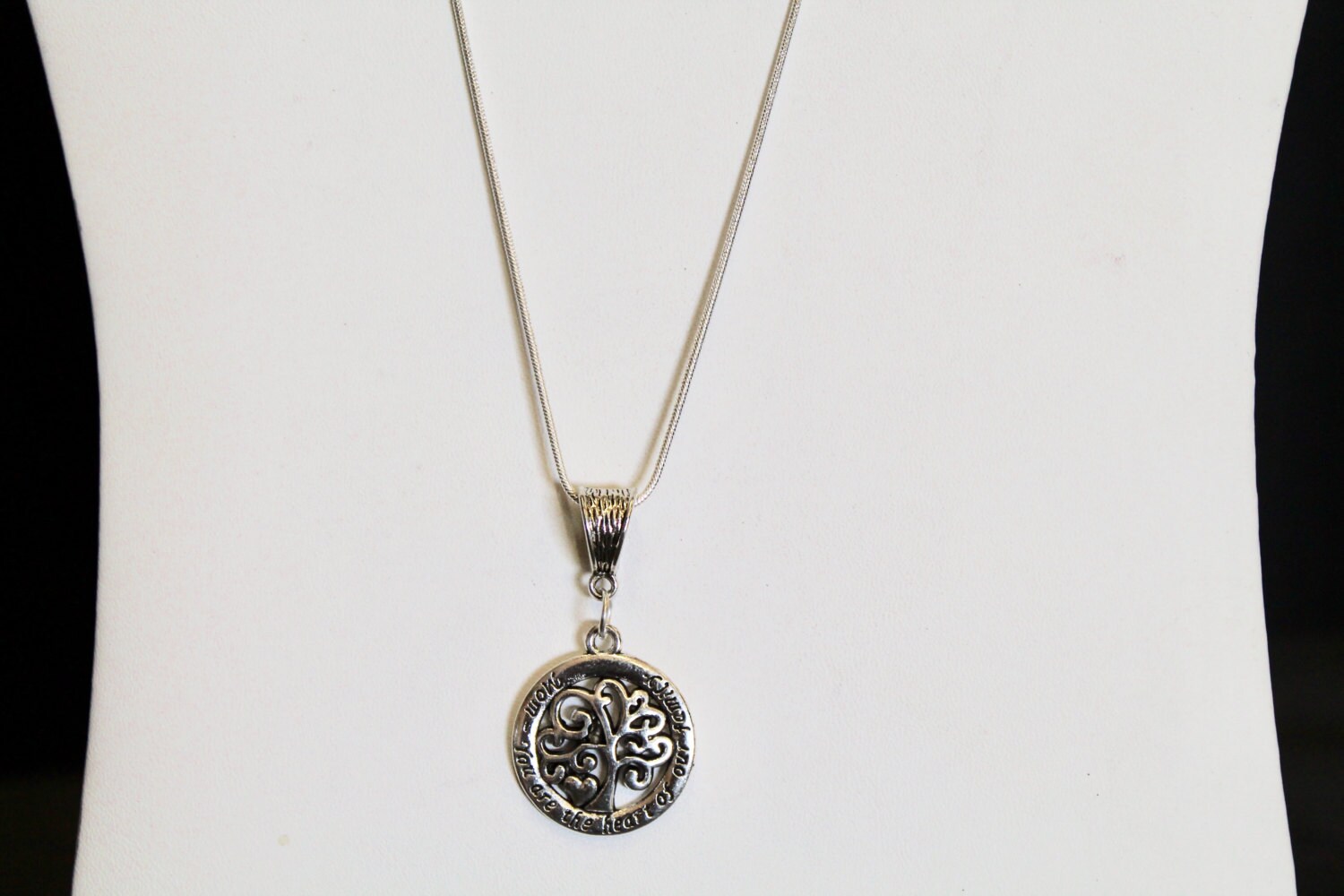 This is a silver tone Mom You Are The Heart Of Our Family pendant on a silver-plated snake chain. This pendant has a tree in the center to represent the family tree. It would make a great gift for Mom! This pendant is available on your choice of 16, 18, 20, 22, 24, 26, 28 or 30 inch chain. The pendant is also available for individual purchase if you have another chain on which you would like to wear it.