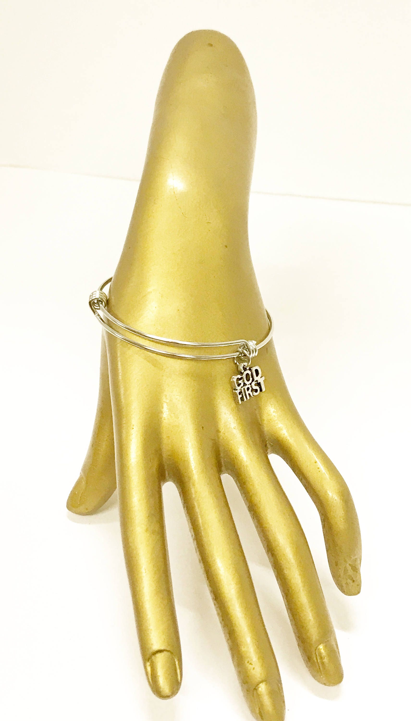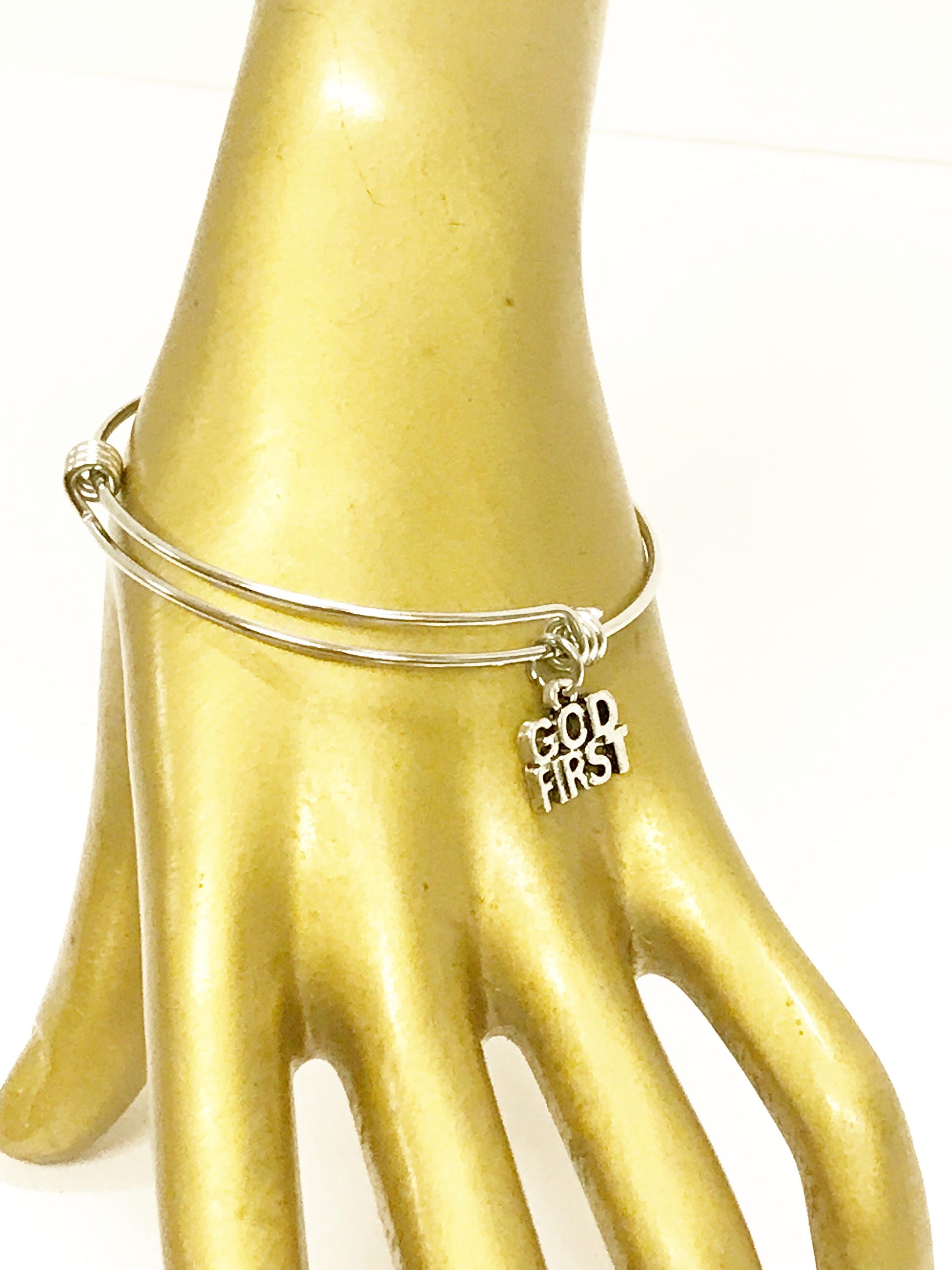 Remind yourself to always put God first in everything you do with this expandable bangle bracelet. This bracelet would also be a great gift to remind a young woman to always put God first in her life. This bracelet expands to fit comfortably over any hand and fits any wrist size. This bracelet is made of stainless steel to withstand regular wear without tarnishing or changing colors.