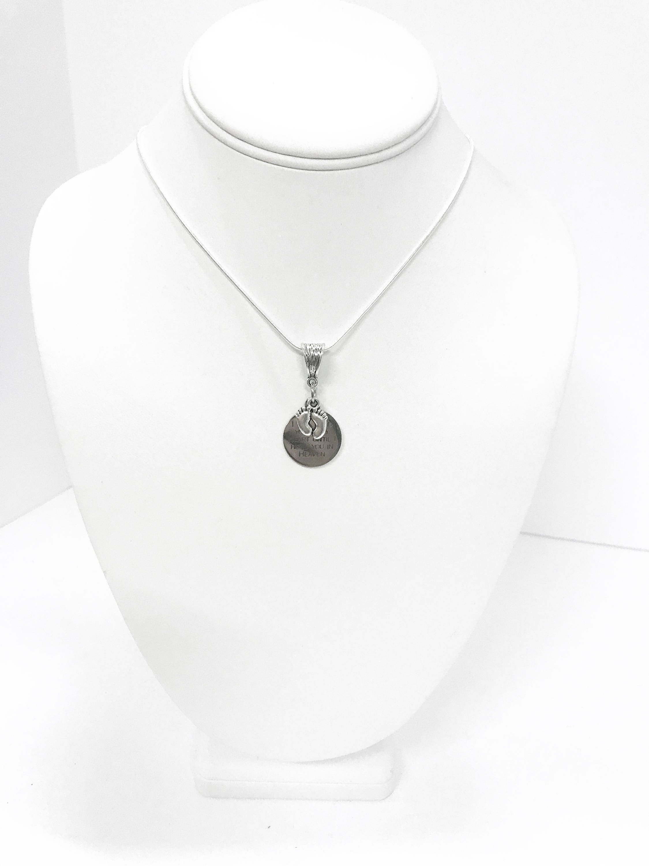This is a stainless steel laser engraved pendant on a sterling silver plated snake chain with a silvertone baby feet charm. The pendant says I Will Hold You in My Heart Until I Hold You in Heaven. This pendant is available on your choice of 16, 18, 20, 22, 24, 26, 28 or 30 inch sterling silver plated snake chain. This necklace serves as a beautiful memorial necklace for a pregnancy or child loss to wear near your heart. You can add a birthstone charm via the "Add A Charm" listing available in my store.