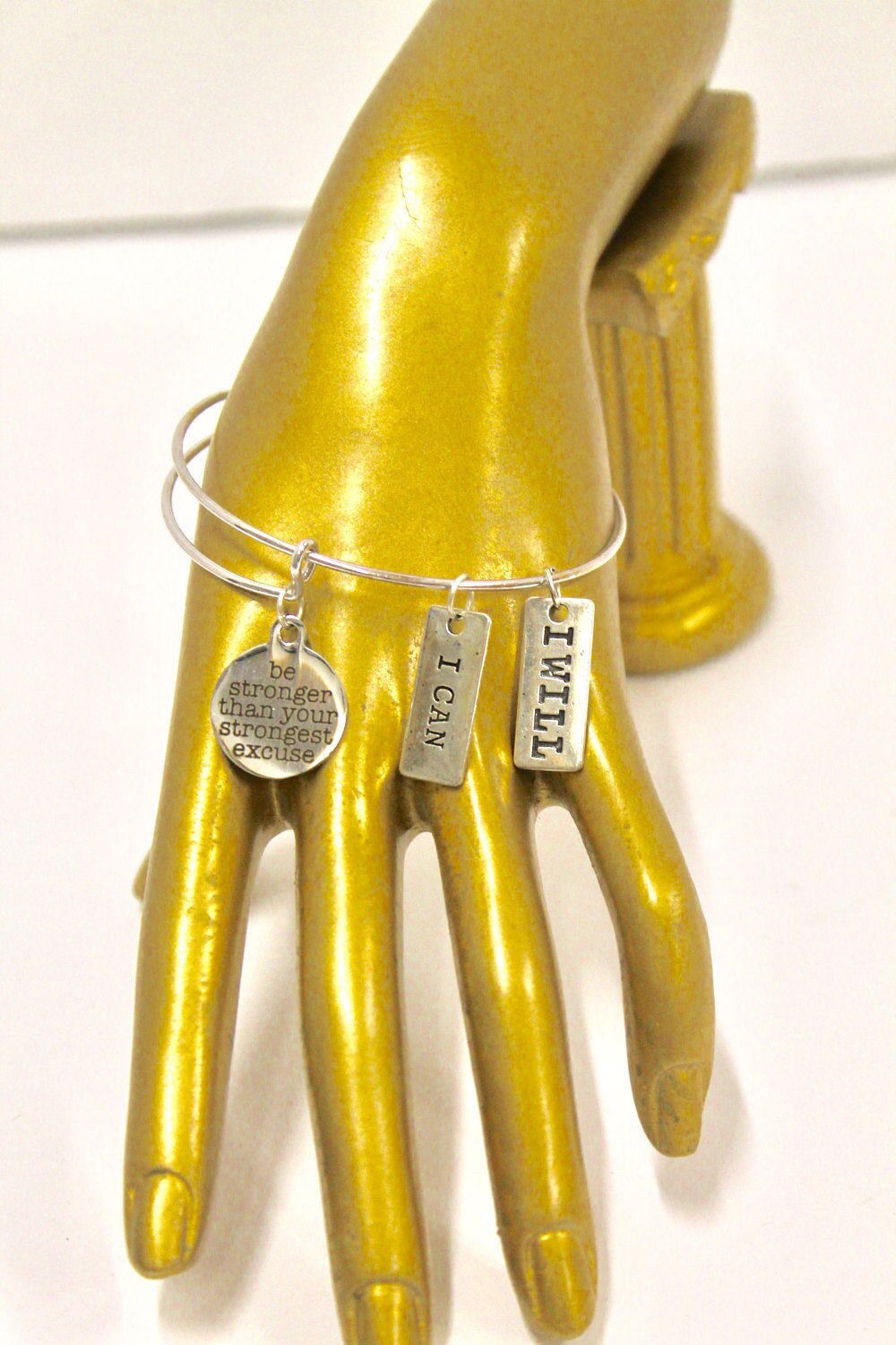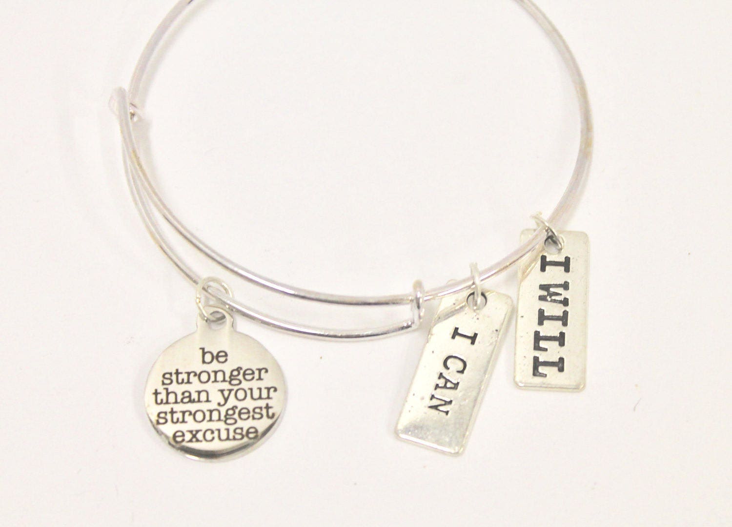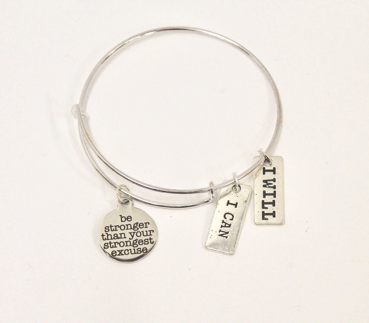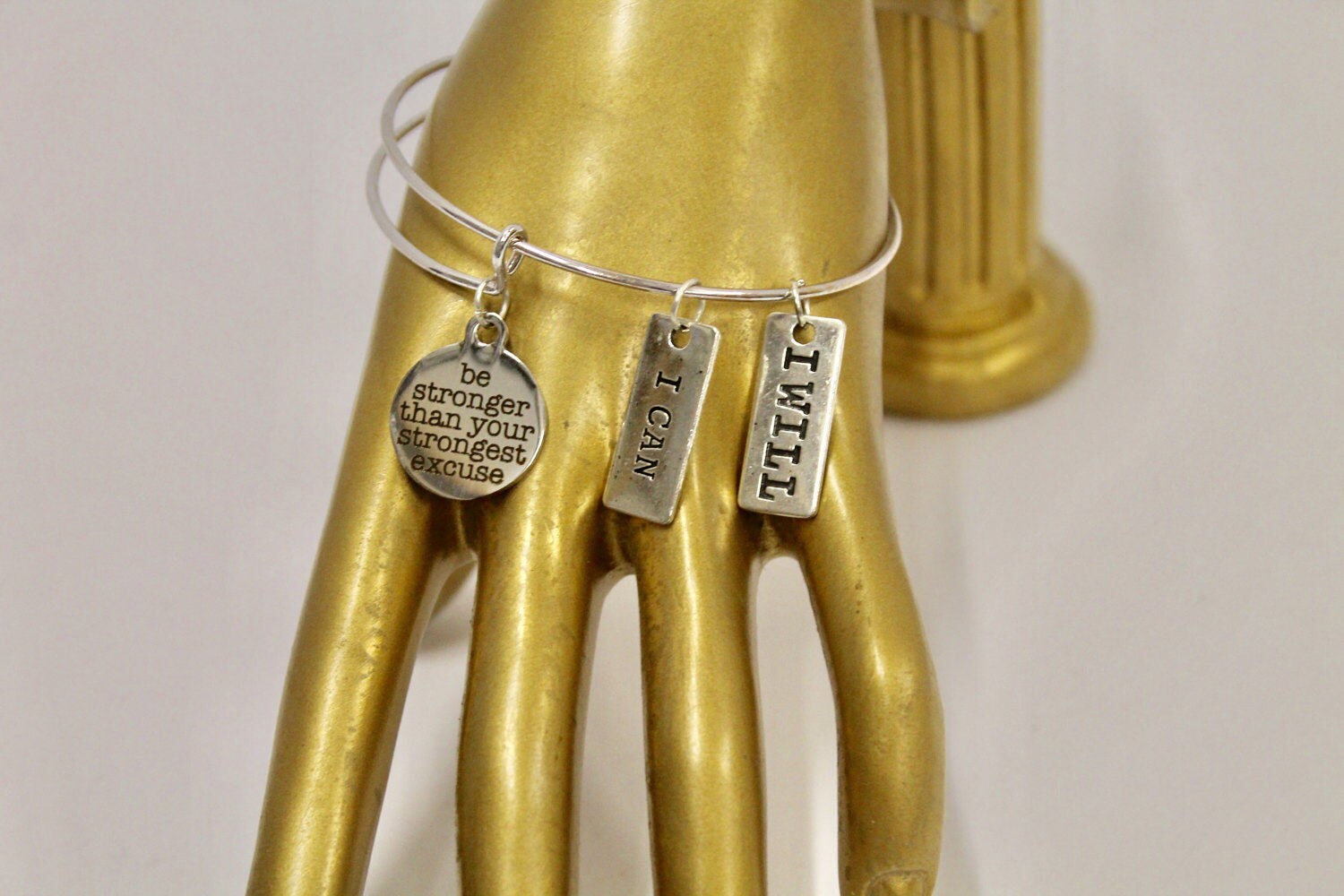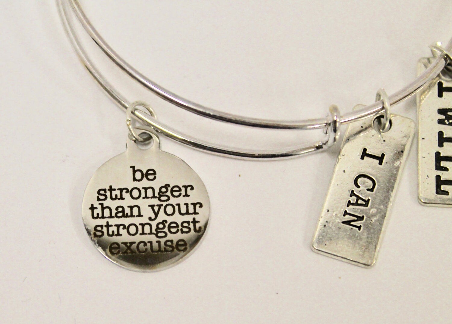 Be Stronger Than Your Strongest Excuse expanding bangle bracelet with I Can and I Will charms. This is a great motivational gift for yourself or for someone you love! This bracelet expands to fit comfortably over any hand and fits any wrist size. This bracelet is available in your choice of either silvertone alloy metal or stainless steel.