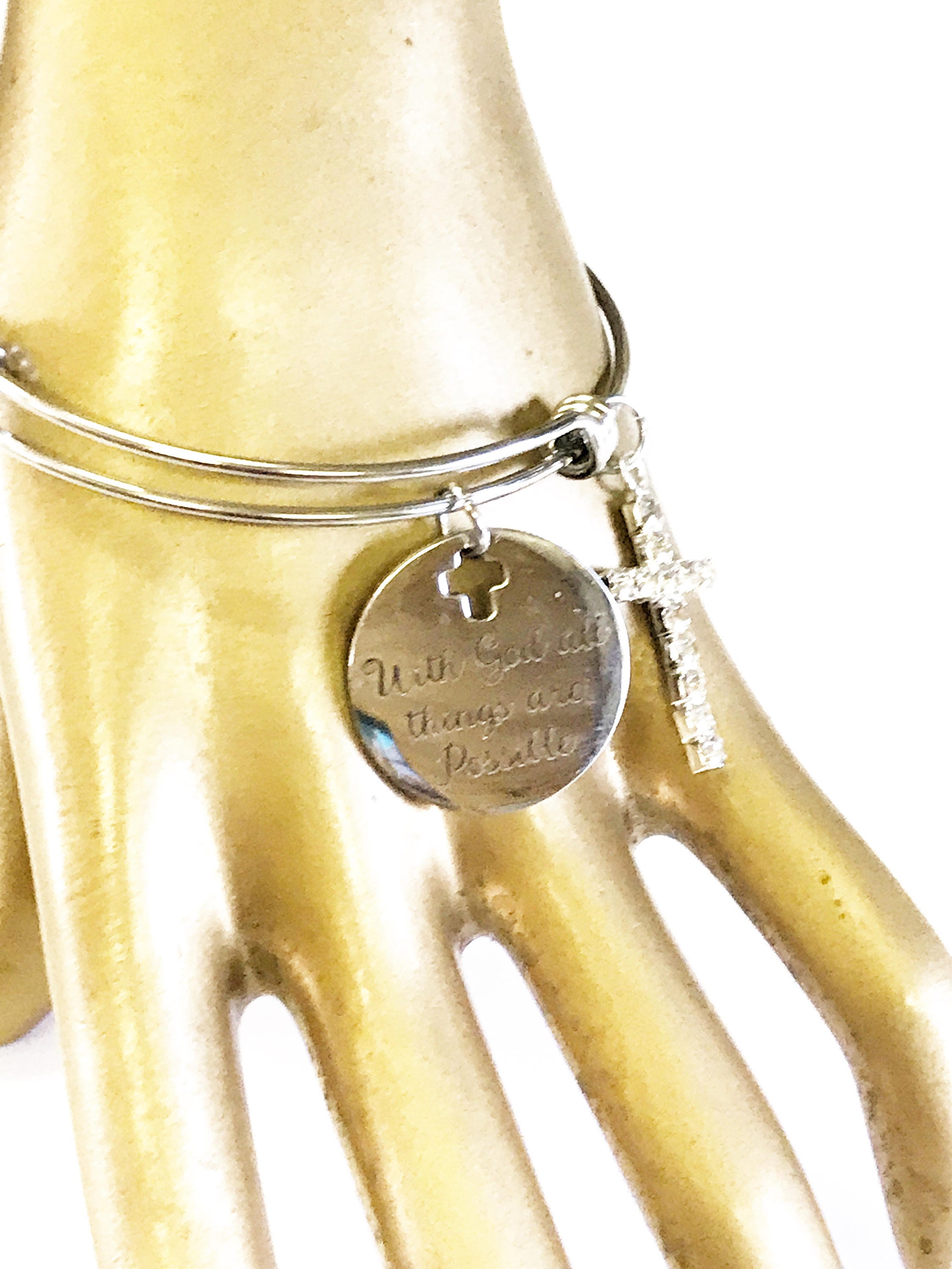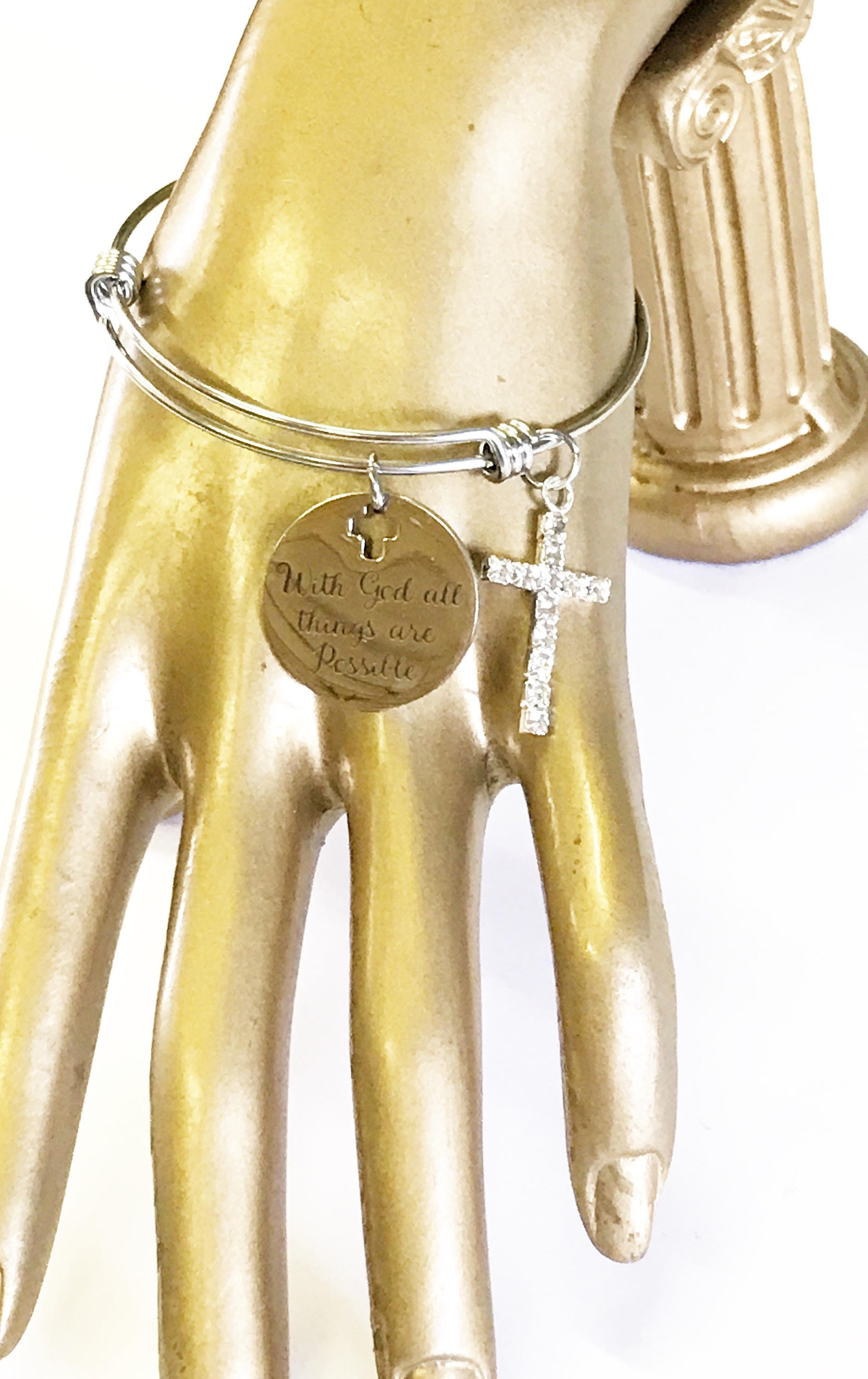 This is an expanding bangle bracelet with a stainless steel charm that says: "With God All Things Are Possible" and a silvertone and rhinestone cross charm. The bracelet is made of stainless steel to withstand regular wear without tarnishing or changing colors. It would be a great gift for someone working to reach a goal! This bracelet expands to fit comfortably over any hand and fits any wrist size.