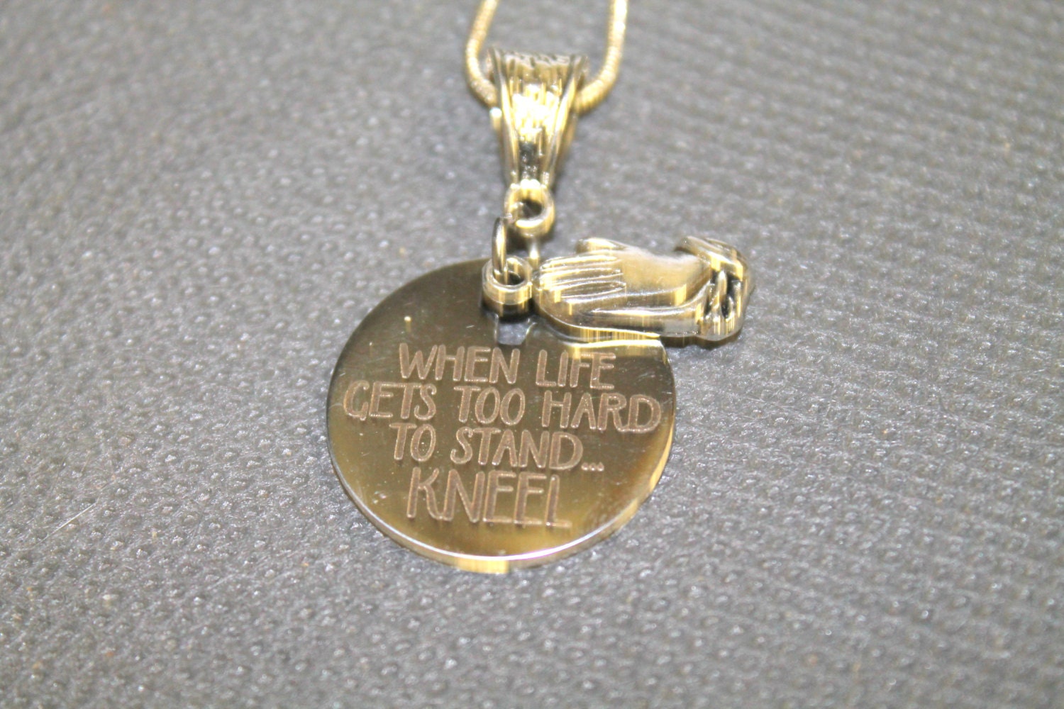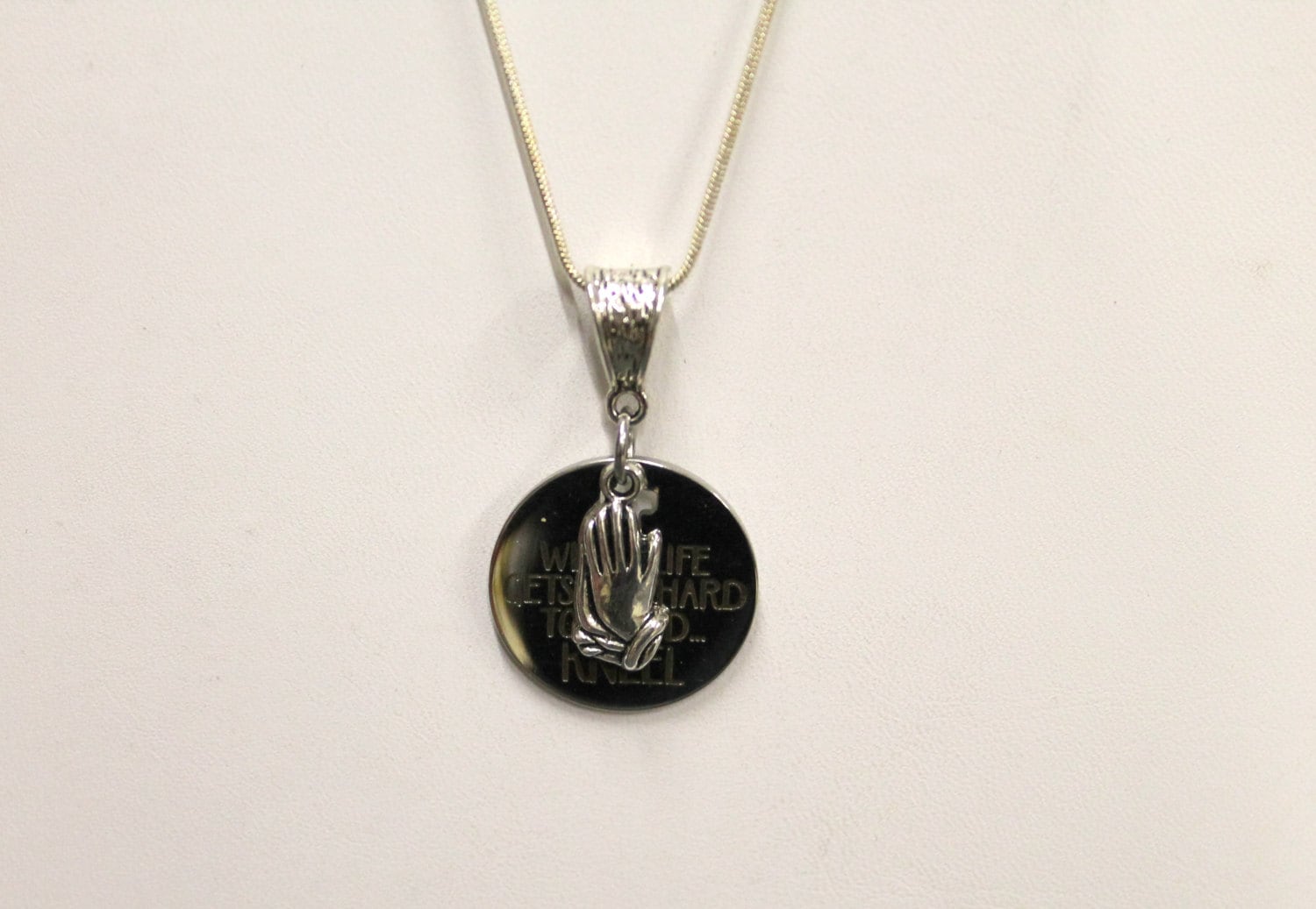 Beautiful stainless pendant that says "When Life Gets Too Hard to Stand... Kneel" along with a silver tone praying hands charm on your choice of a 16, 18, 20, 22, 24, 26, 28 or 30 inch silver plated snake chain. The necklace would be a great gift for someone that you love that is going through a tough time or as a reminder for yourself to turn things over to God.