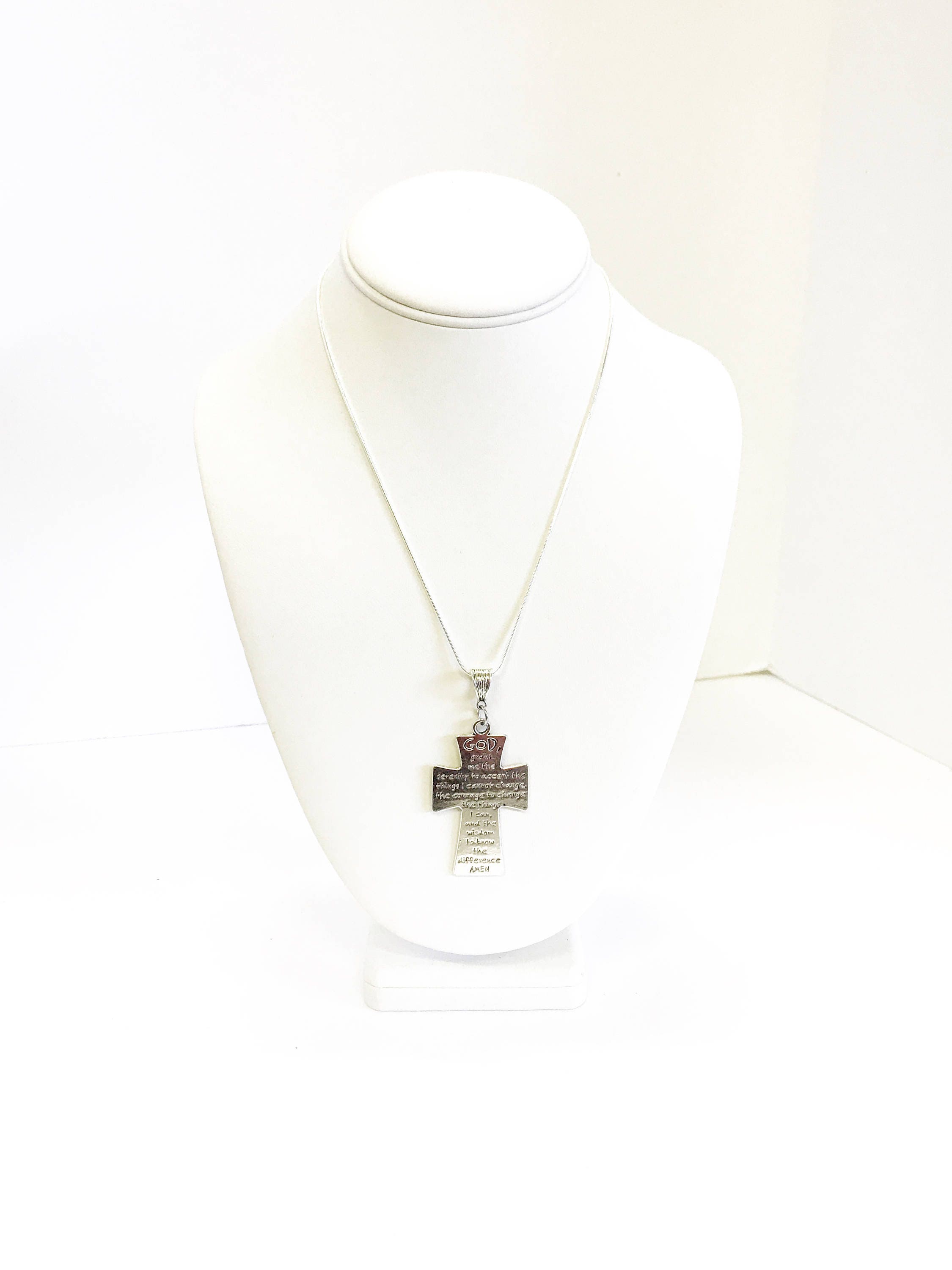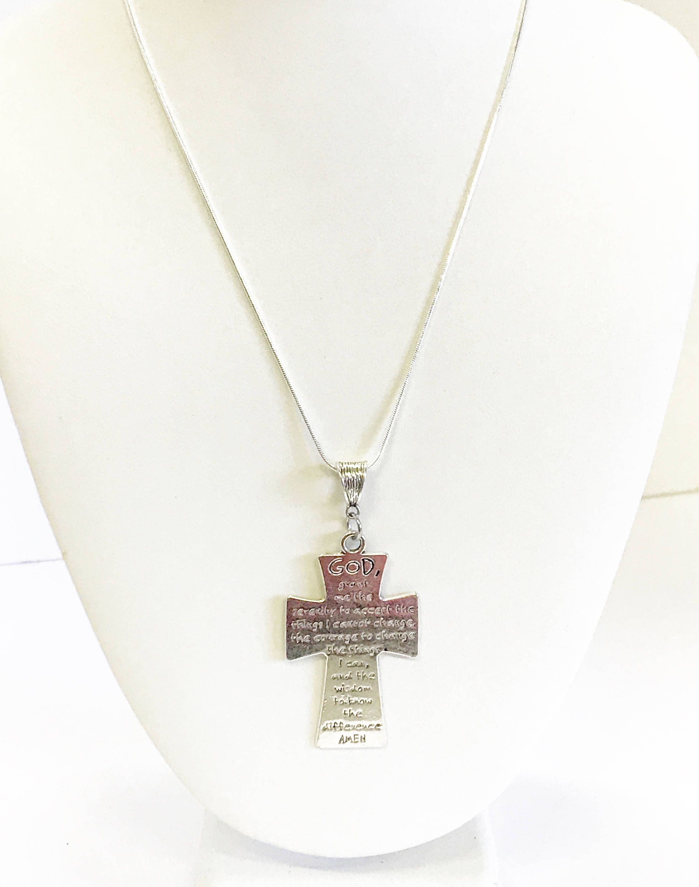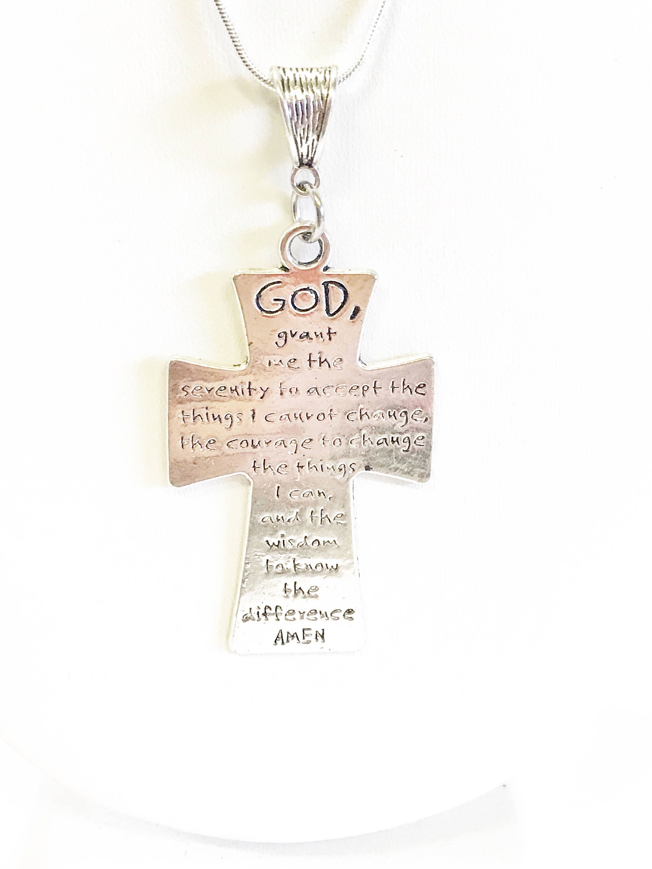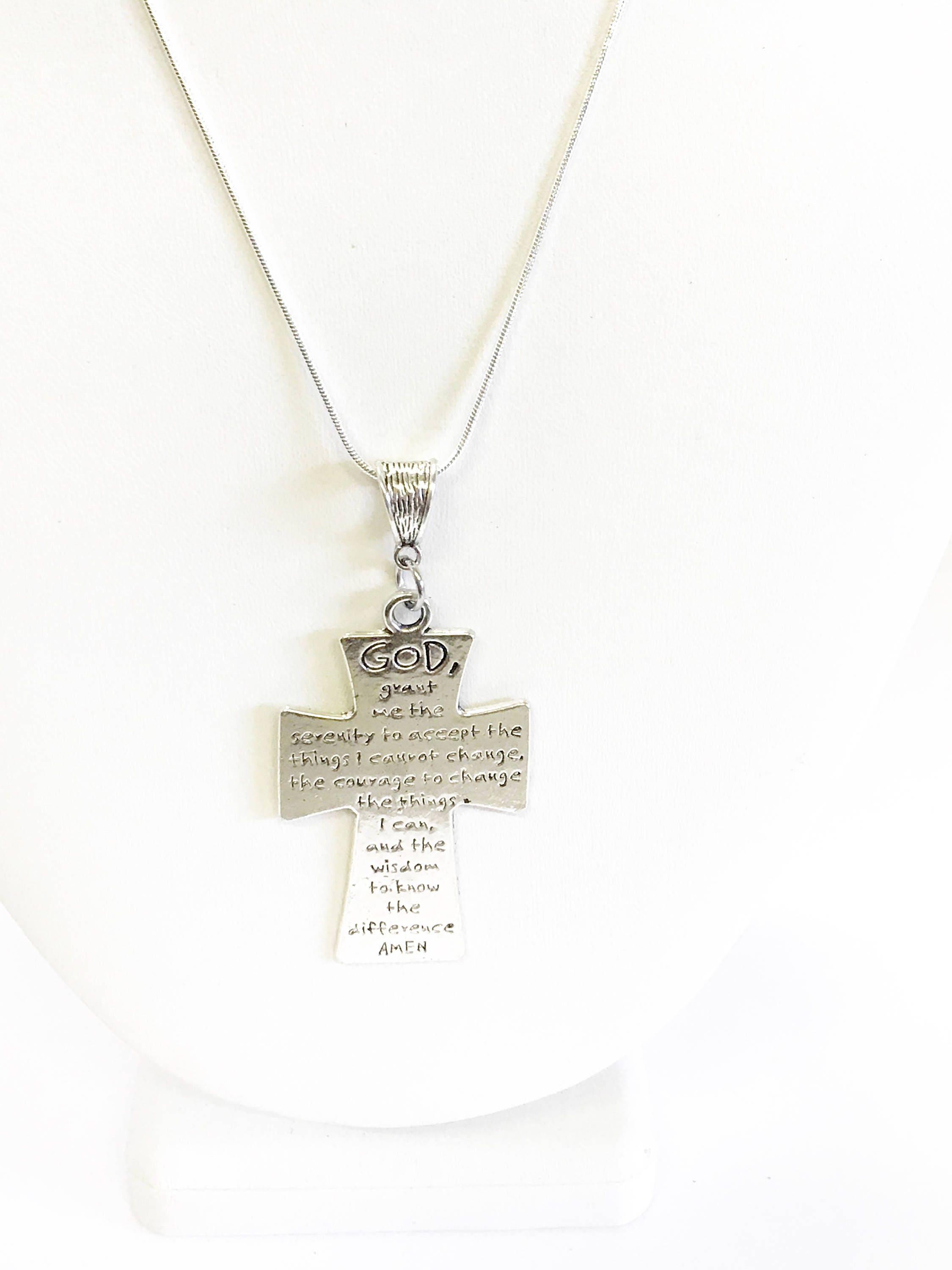 This necklace has a silver tone Serenity Prayer cross on a sterling silver plated snake chain. It can serve as a motivation to do what is necessary to achieve your dreams and goals. This necklace is available is your choice of 16, 18, 20, 22, 24, 26, 28 or 30 iInches. The pendant is also available for separate purchase if you have another necklace on which you would like to wear it. The pendant measures approx. 2 iInches by 1 1/4 iInches.