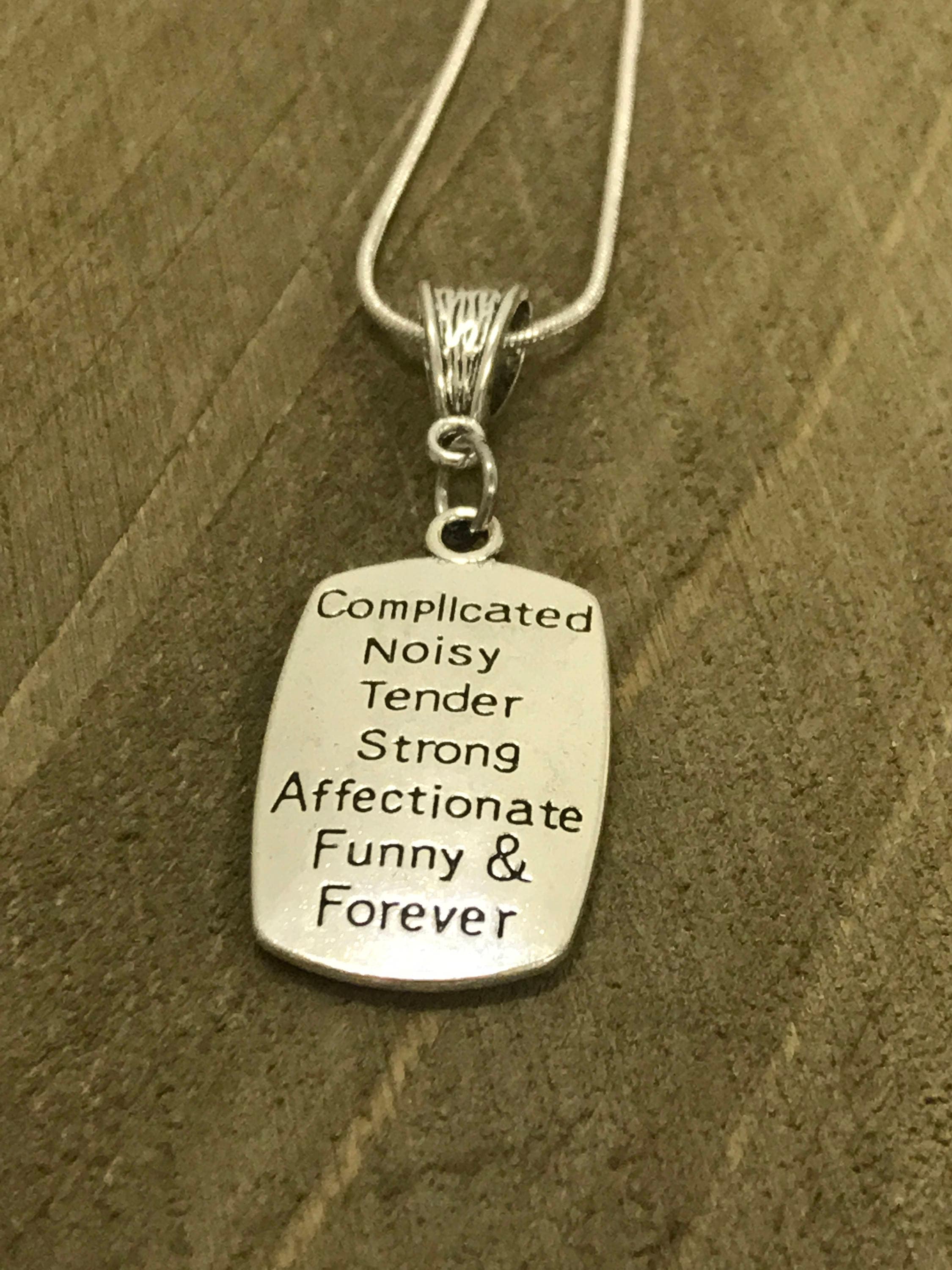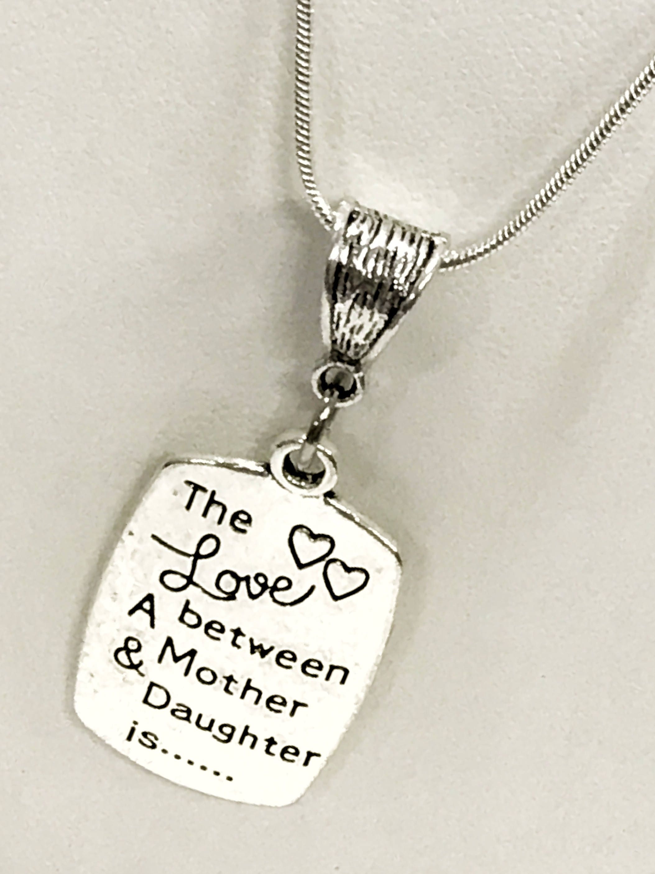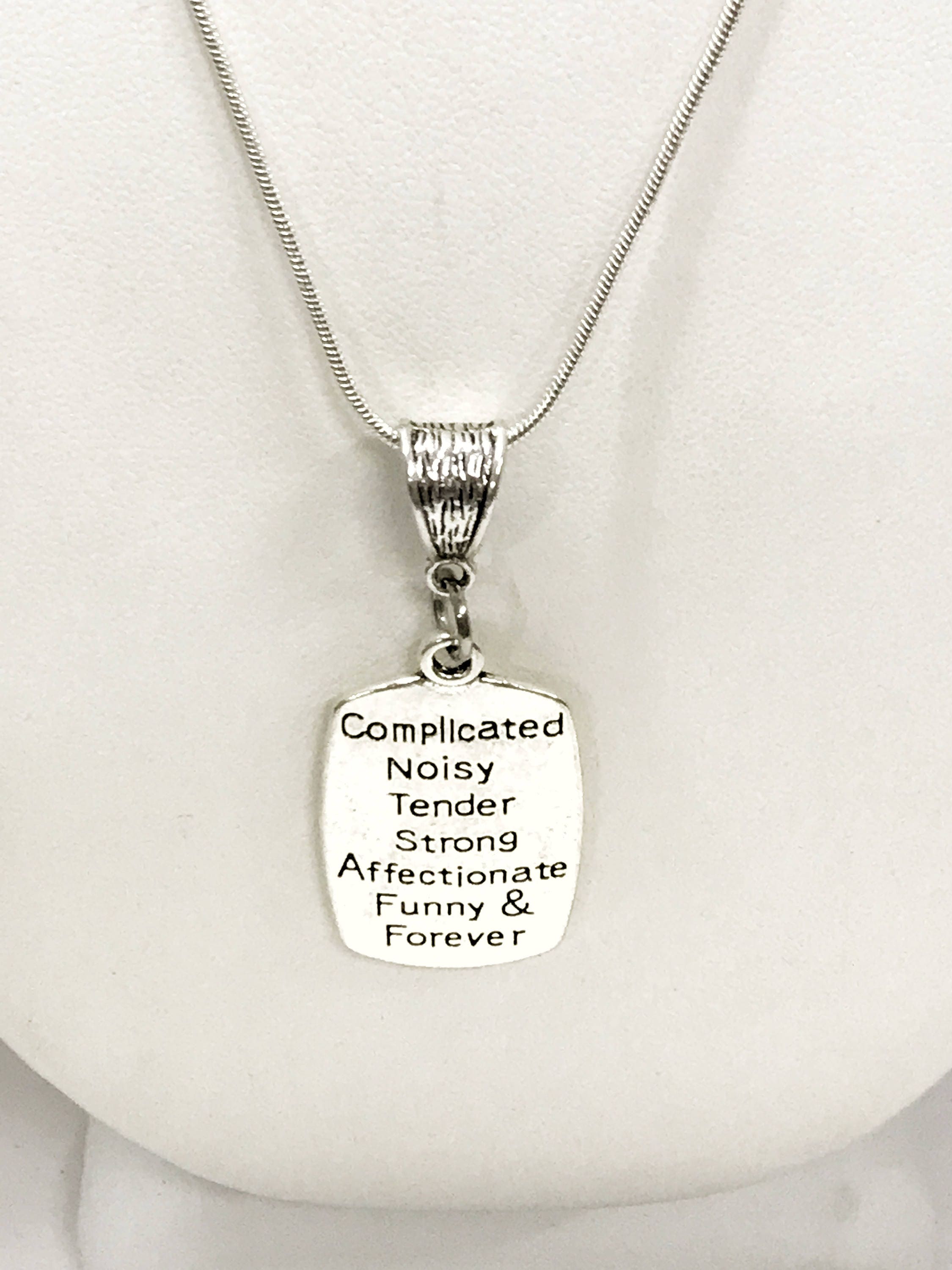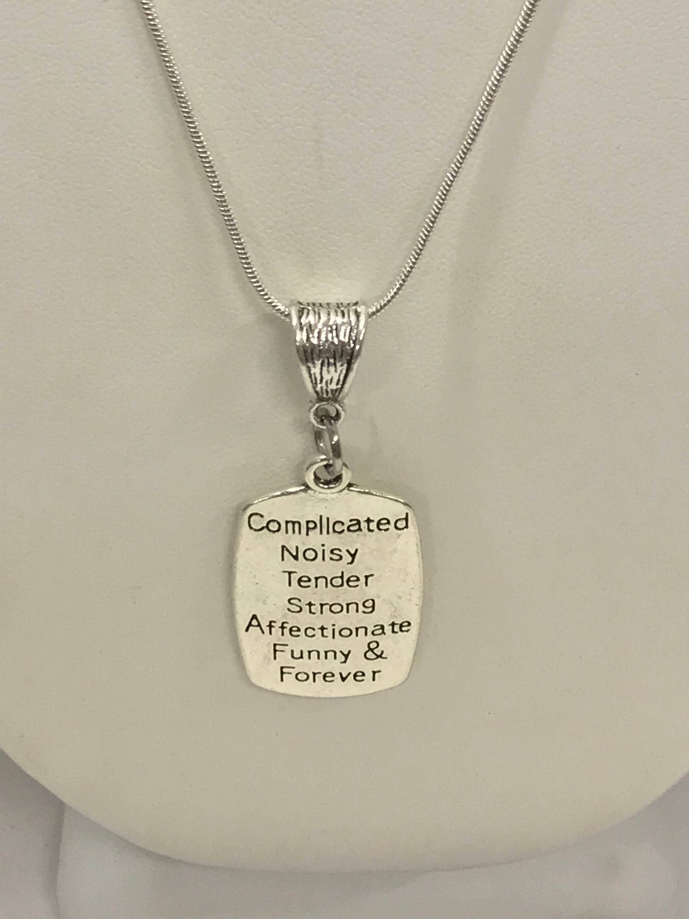 This is a pendant that says "The Love Between A Mother And Daughter Is...." on the front and "Complicated Noisy Tender Strong Affectionate Funny & Forever" on the back. This necklace is available on your choice of a 16, 18, 20, 22, 24, 26, 28 or 30 inch silver plated snake chain. This necklace would be a great gift for your mom or your daughter.