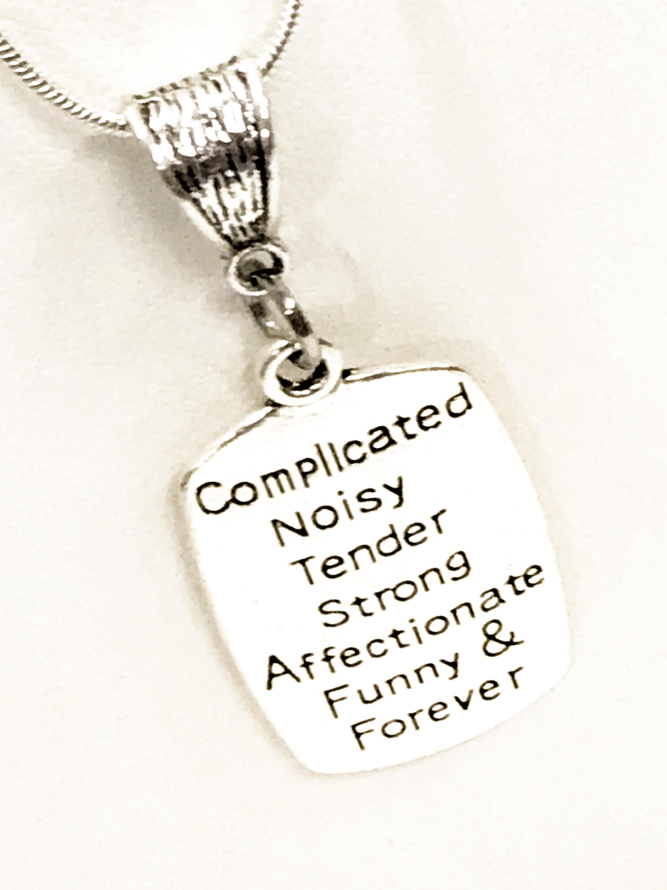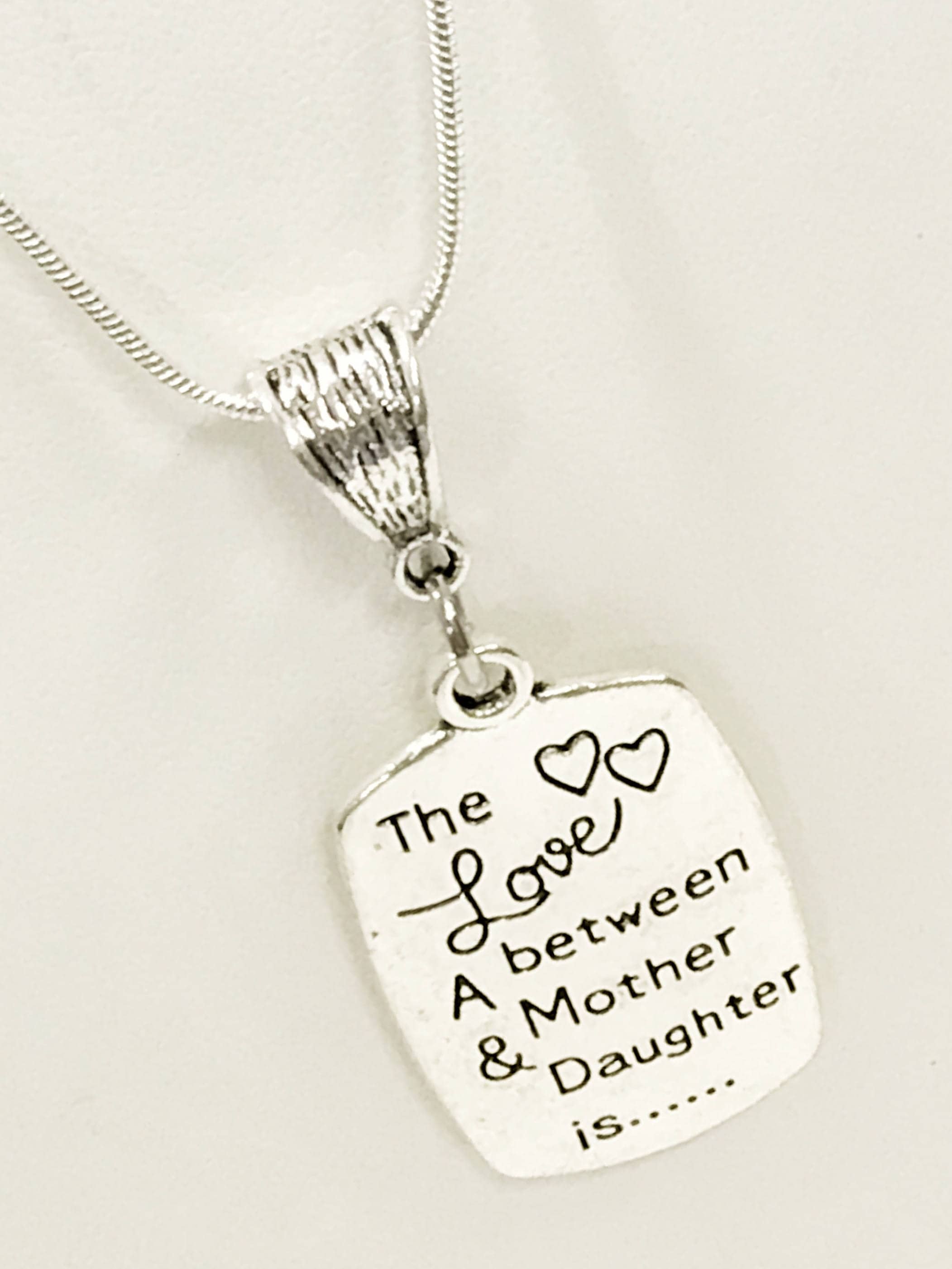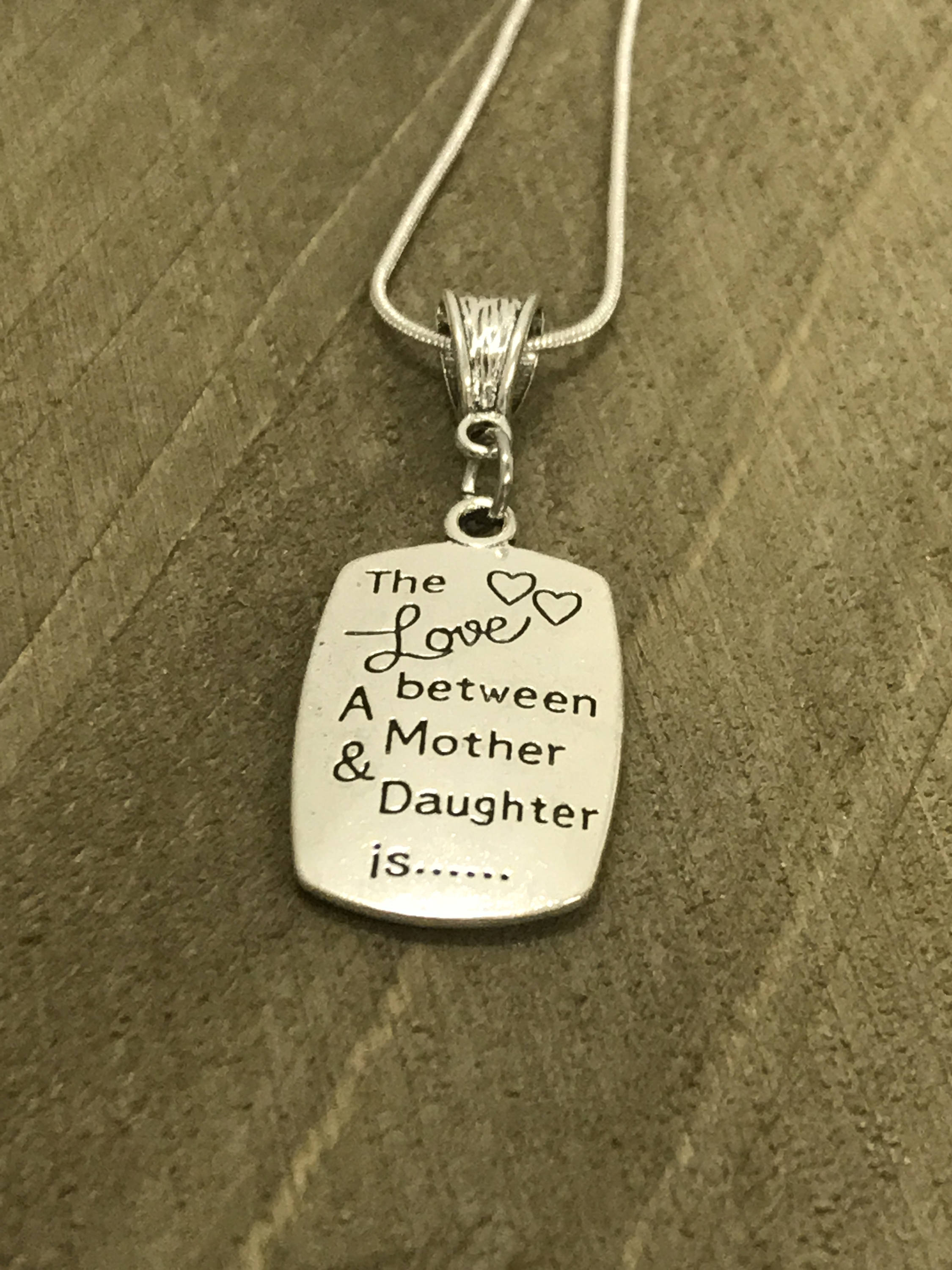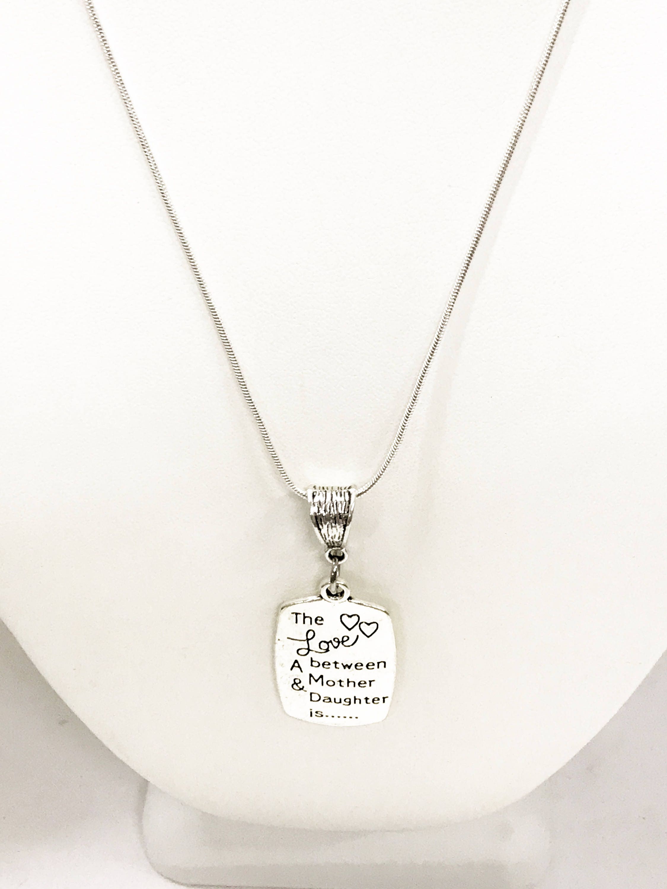 This is a pendant that says "The Love Between A Mother And Daughter Is...." on the front and "Complicated Noisy Tender Strong Affectionate Funny & Forever" on the back. This necklace is available on your choice of a 16, 18, 20, 22, 24, 26, 28 or 30 inch silver plated snake chain. This necklace would be a great gift for your mom or your daughter.