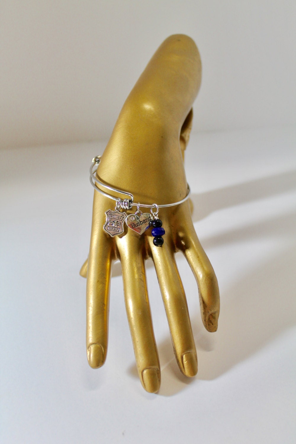This is an expanding bangle bracelet with a police supporter theme. It is available with your choice of heart charms - son, husband, grandson, daughter, granddaughter. It is also available on your choice of either a silvertone alloy bangle or a stainless steel bracelet. This bracelet expands to fit comfortably over any hand and fits any wrist size.