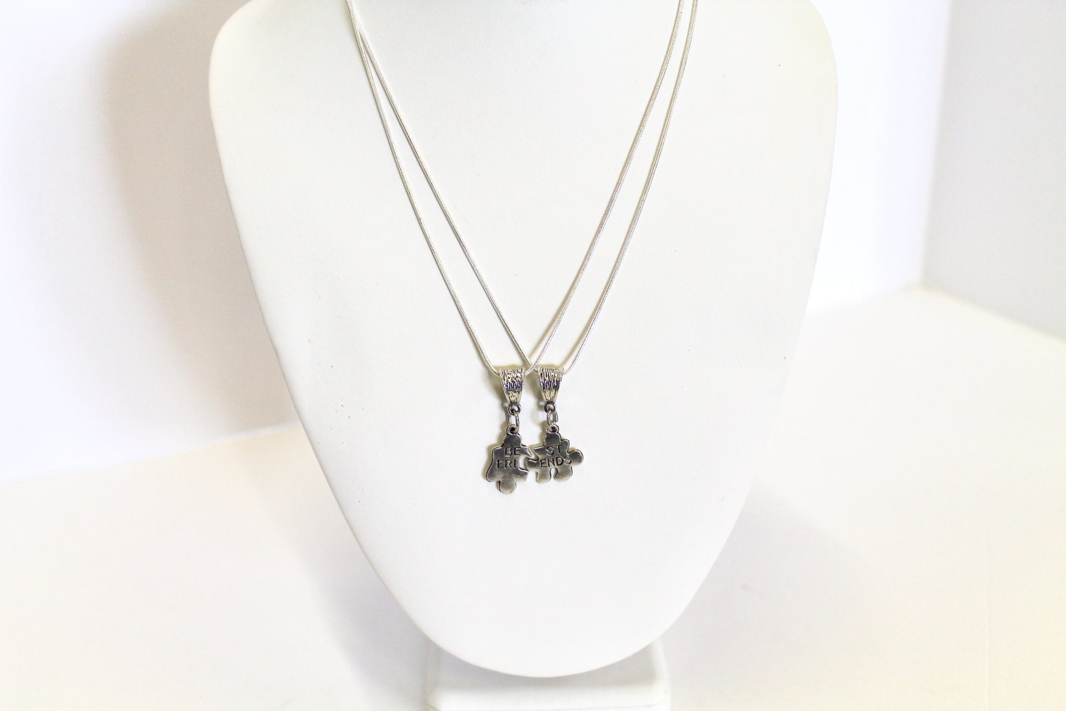This is a set of matching puzzle pieces Best Friends necklaces on sterling silver plated necklaces in your choice of lengths. This would be a great gift for your best friend and yourself!