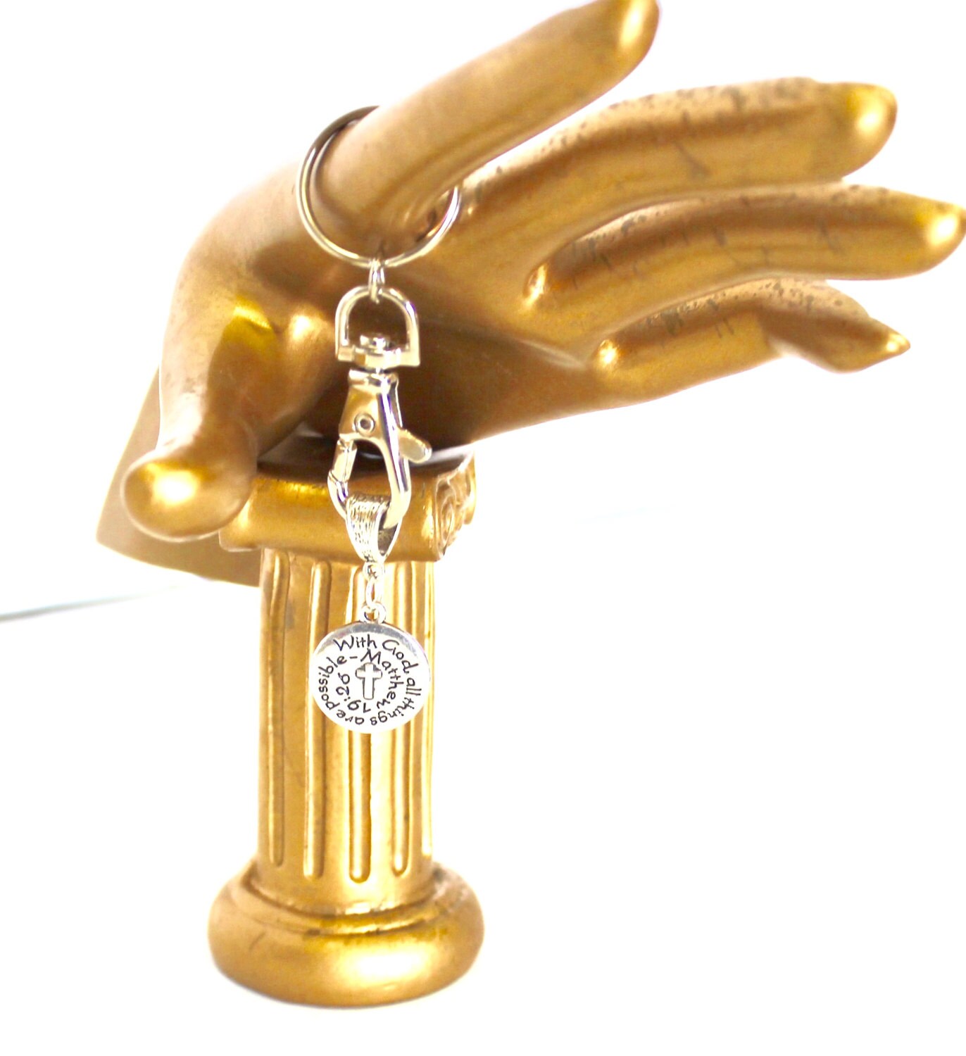 This keyring is a great motivational piece that reminds us of the bible verse Matthew 19:26 that with God all things are possible! This would be a great graduation gift or gift for someone facing a difficult task!