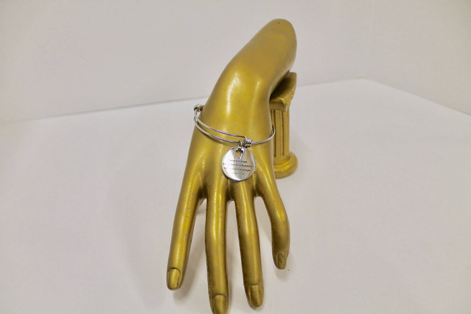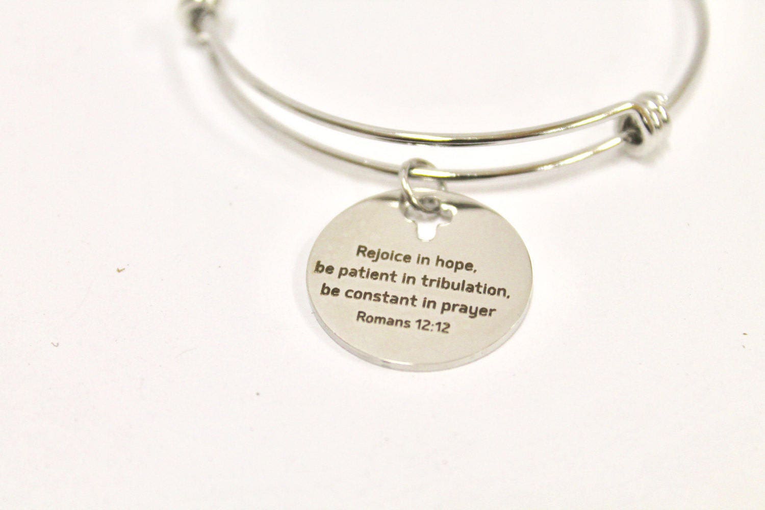 This beautiful bracelet contains a stainless steel engraved charm with the bible verse of Romans 12:12 on it which says, "Rejoice in Hope, Be Patient in Tribulation, Be Constant in Prayer". Additional charms can be added via the Add A Charm Listing in my shop. This bracelet is made of stainless steel to withstand regular wear without tarnishing or changing colors. The bracelet expands to easily fit any hand and wrist size.